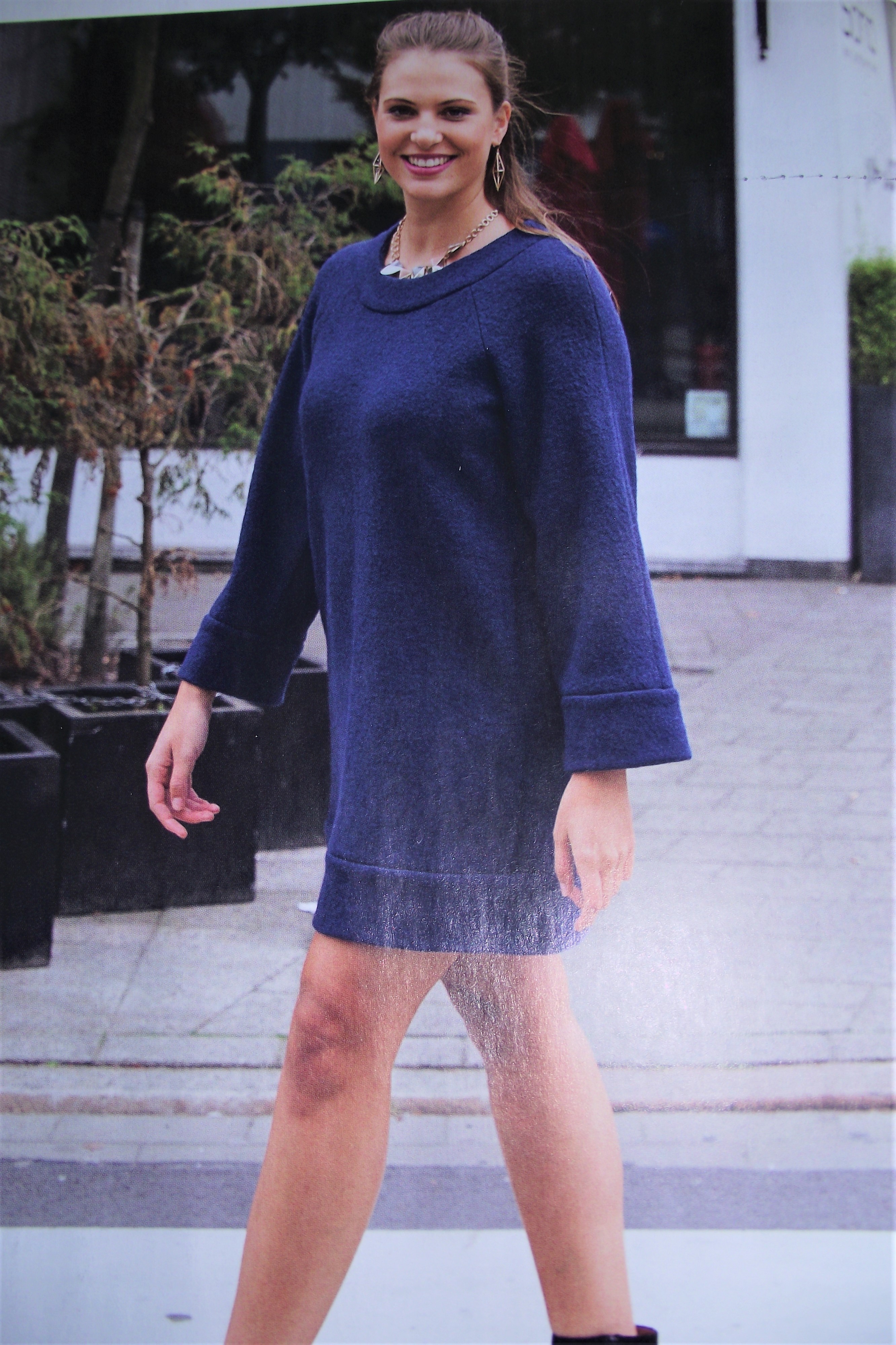 La robe Béa , aux manches raglans , semble très confortable , j’aime particulièrement la bande d’encolure , et sa longueur , avec un collant opaque , voilà une tenue confortable et féminine.