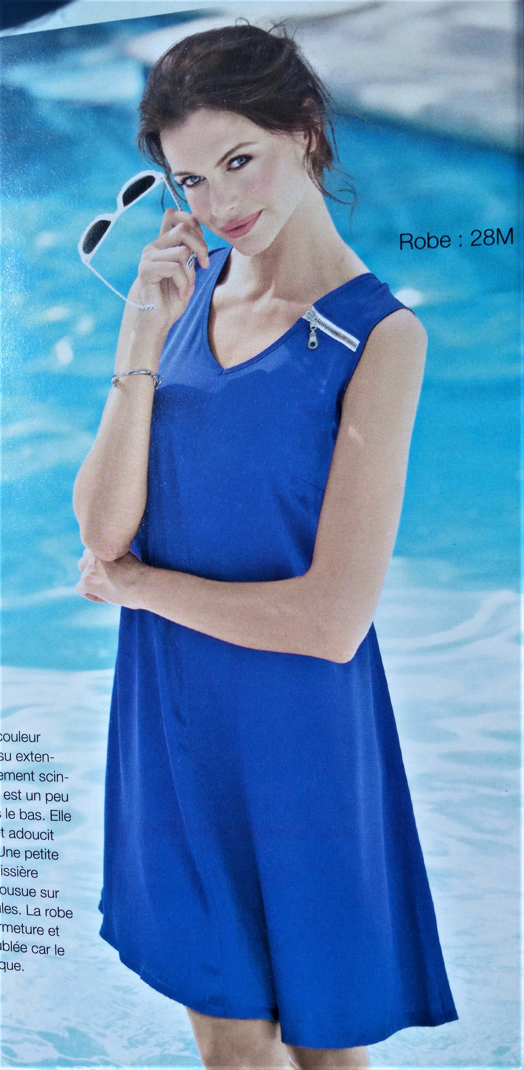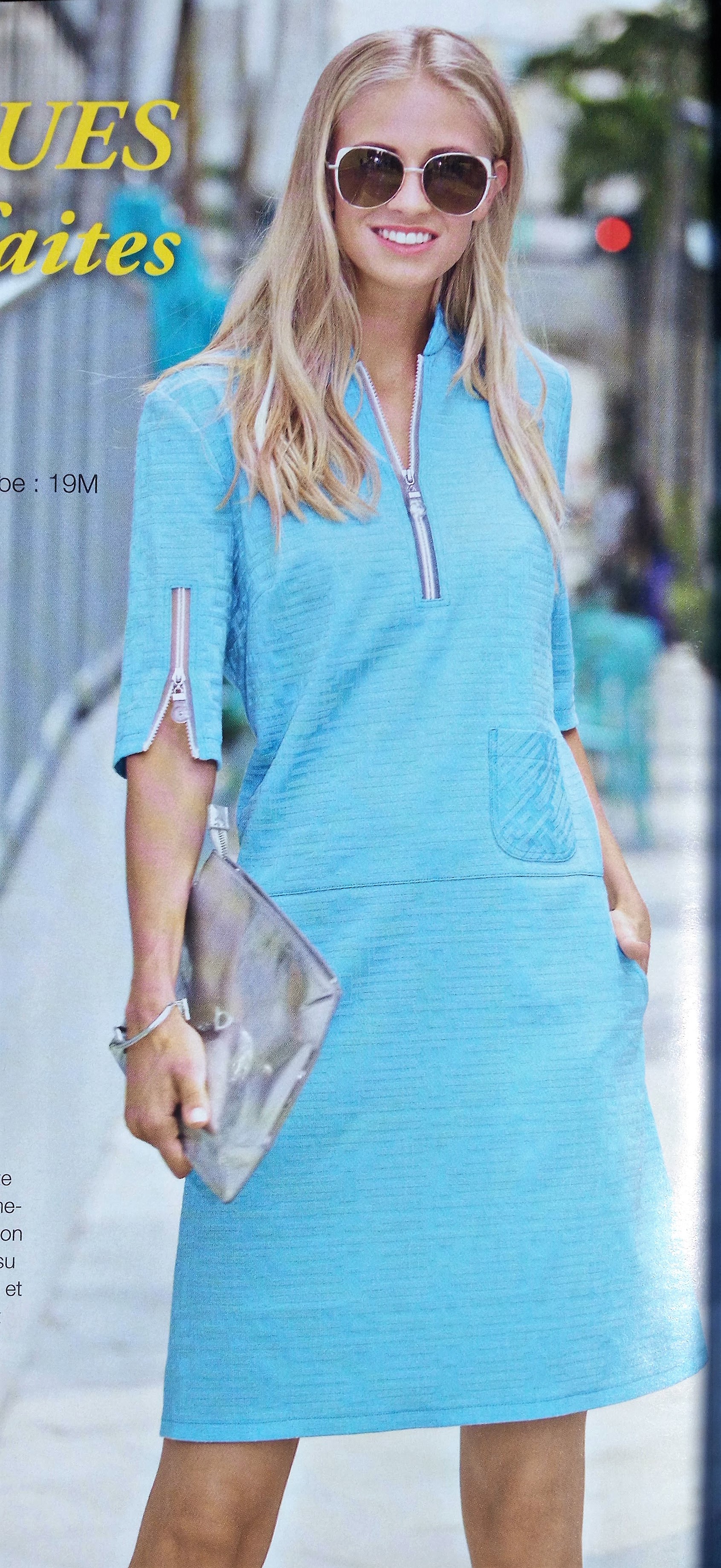 Cette tunique longue asymétrique , me plait aussi . La fermeture à glissière sur le devant permet de jouer sur la profondeur du décolleté . Le dos est fendu est un tissus différent vient habiller la fente. Elle est dans les tailles 40/42 , 44/46 , 48/50 , 50/52