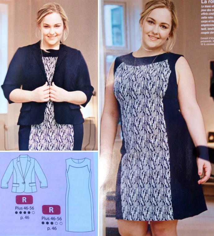Je commence par ce superbe ensemble robe et blazer en grandes tailles . La veste est cintrée avec des découpes princesses, et manches trois quart. La robe est réalisée dans deux matières différentes pour un effet amincissant en jouant sur les contrastes.