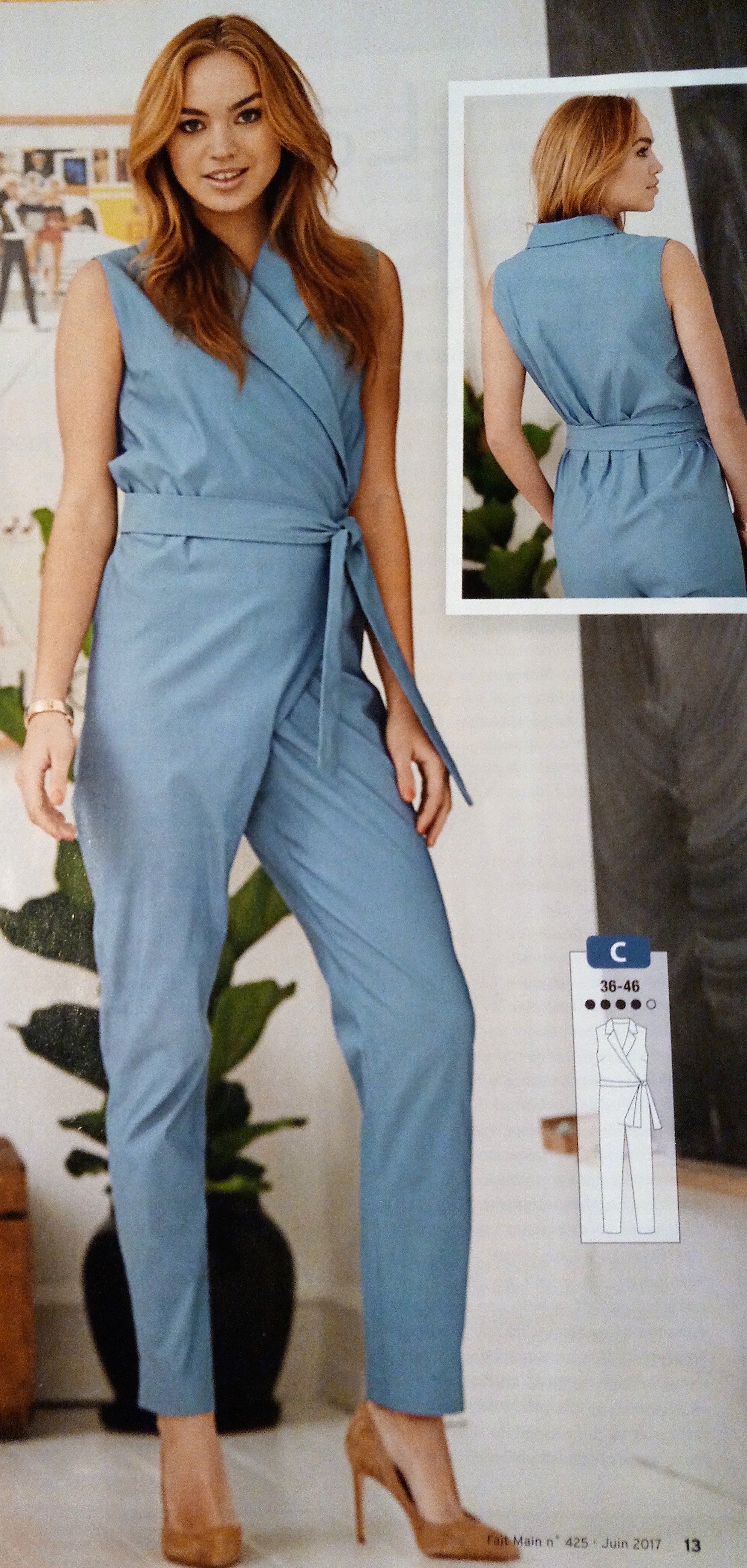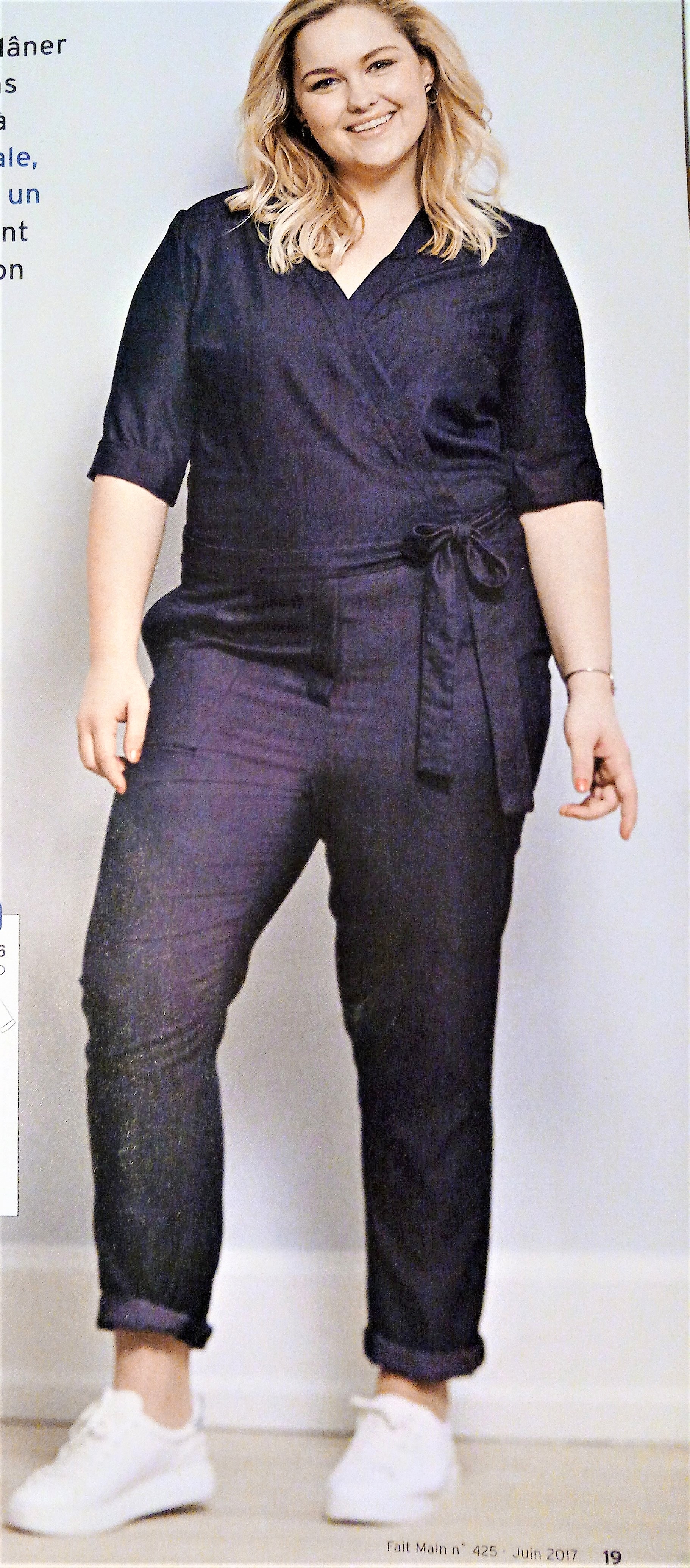 J’adore les combinaisons pantalons ! Idéal quand on a pas envie de se prendre la tête à assortir le haut et le bas ! Ce prototype est sympa, de forme slim pour le pantalon , cache cœur en haut avec des poches plaques , et une ceinture qui se noue sur le coté . De plus c’est un patron grandes tailles et on nous le présente sur un mannequin plus size ! Il va du 46 au 56.