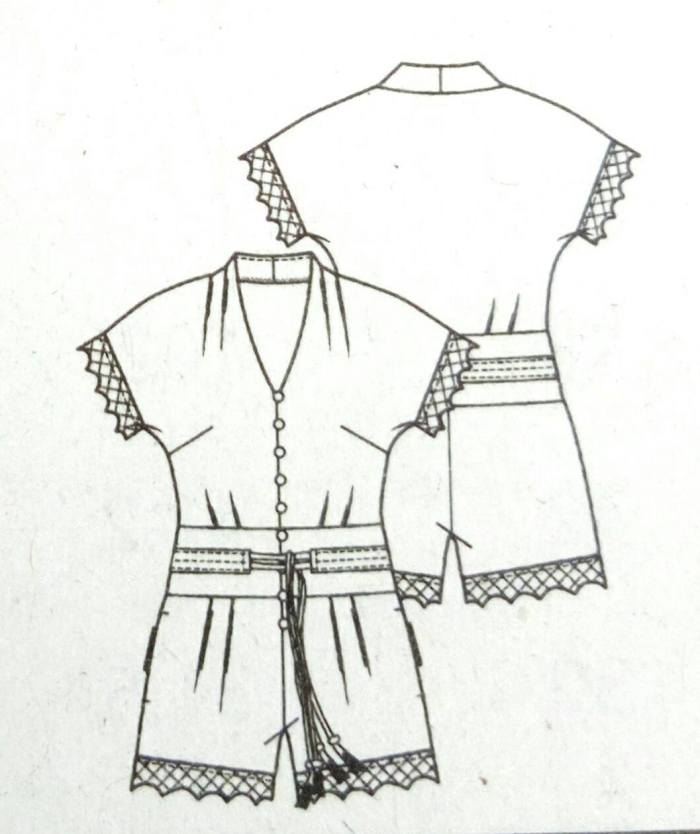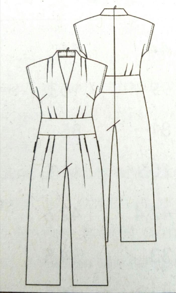 On passe ensuite à cette combinaison pantalon d’exception. Elle ne ressemble en rien à ce que l’on a vu dans les autres revues. La ligne d’encolure est relevée , les manches rapportés . Une ceinture large coupée à même fait la jonction entre le haut et le bas . La combinaison est mise en valeur dans la revue grâce au satin jacquard employé pour la réaliser. La version short est sympa aussi ,avec une coulisse piquée à la taille et son boutonnage devant .
