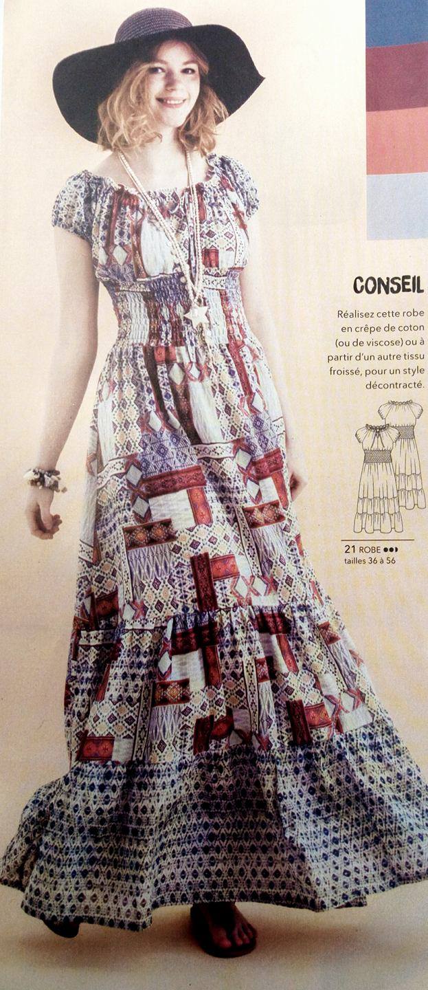 Cette robe aussi mise sur l’originalité , avec une coupe simple mais travaillée.Elle est croisée sur la poitrine comme un cache coeur. Deux empiècements triangulaire viennent completer le haut de cette robe. En jouant avec le sens des rayures comme sur la revue on obtient un résultat magnifique.