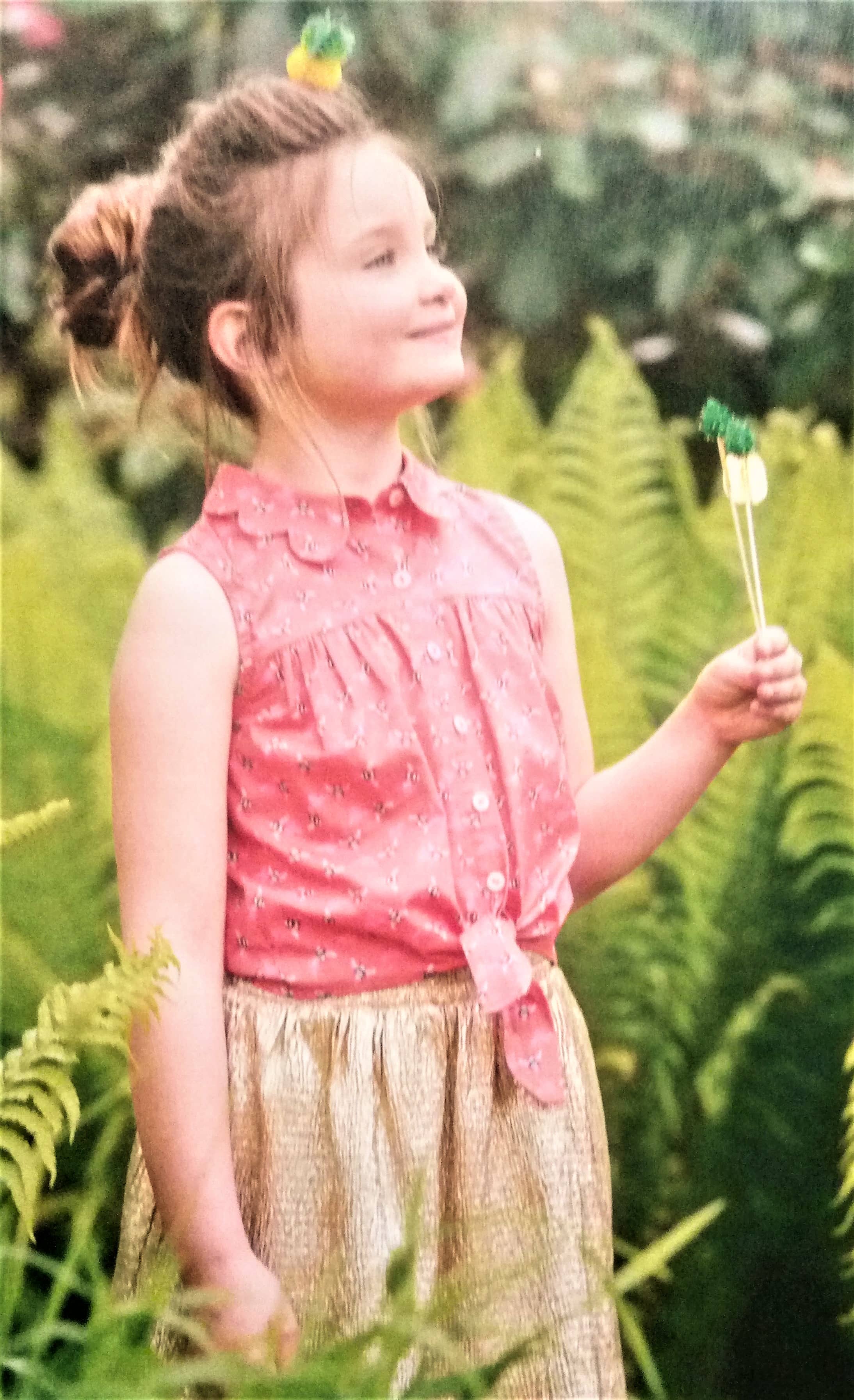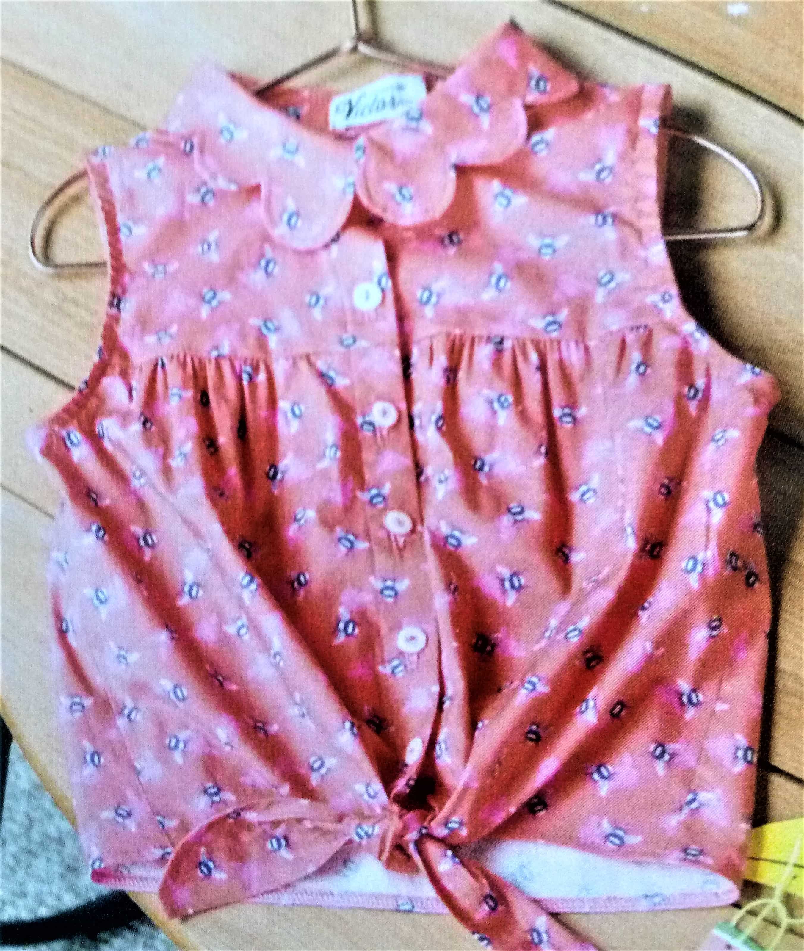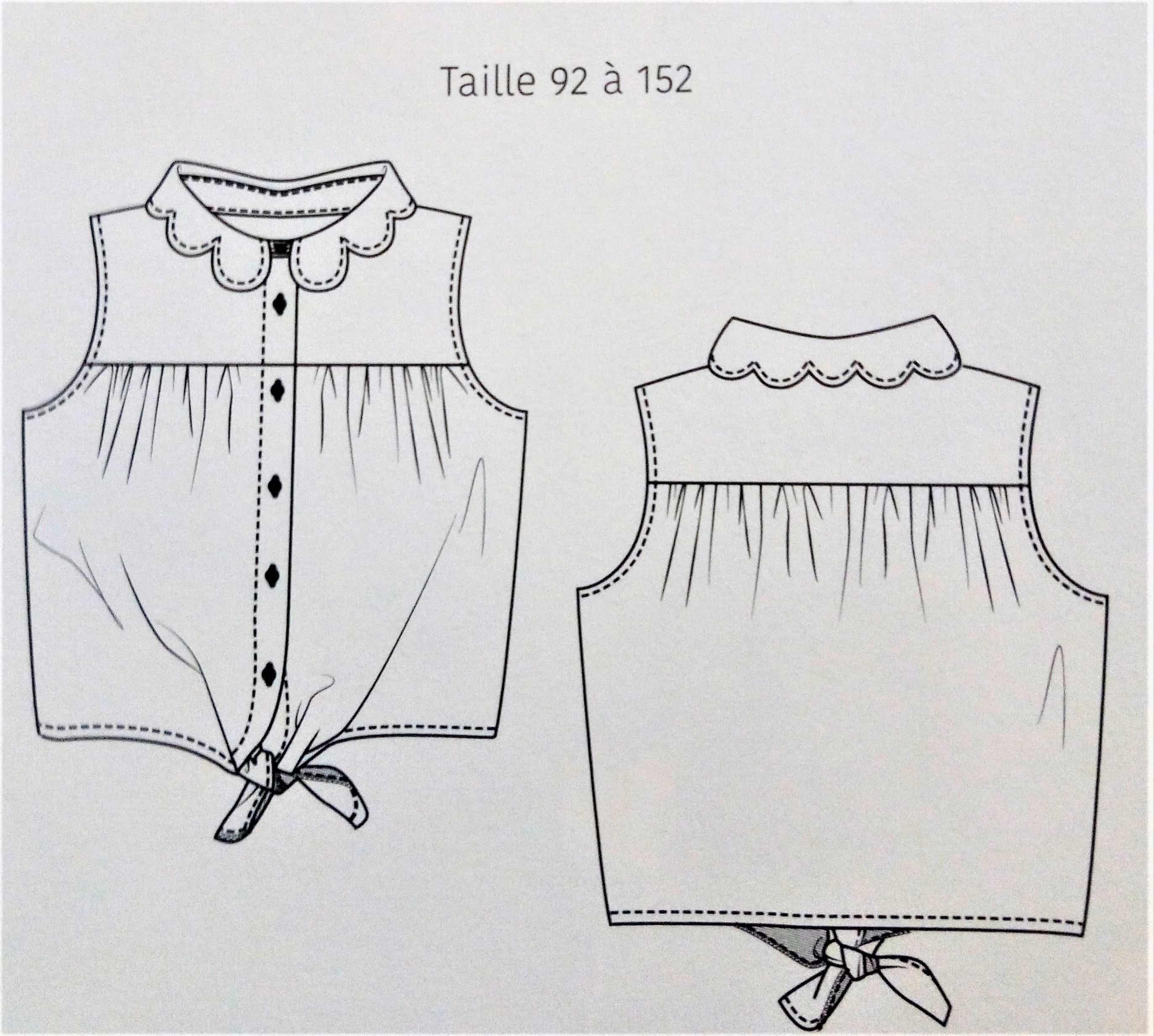 Sur la photo on voit un chemisier d’été sans manches que l’on noue devant . Il a un petit col festonné . Effectivement nos petites filles vont adorer ce modèle, c’est évident 😀 .