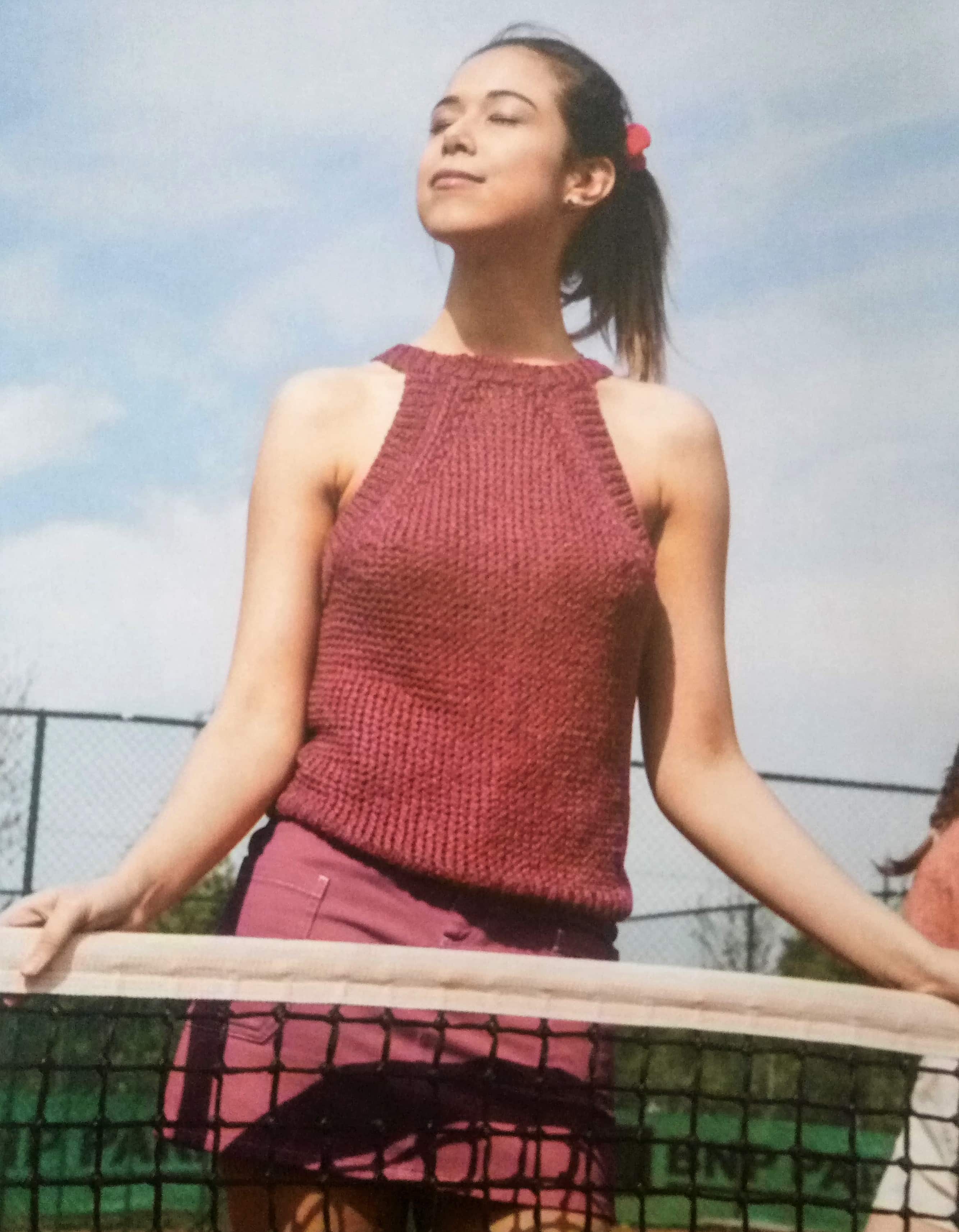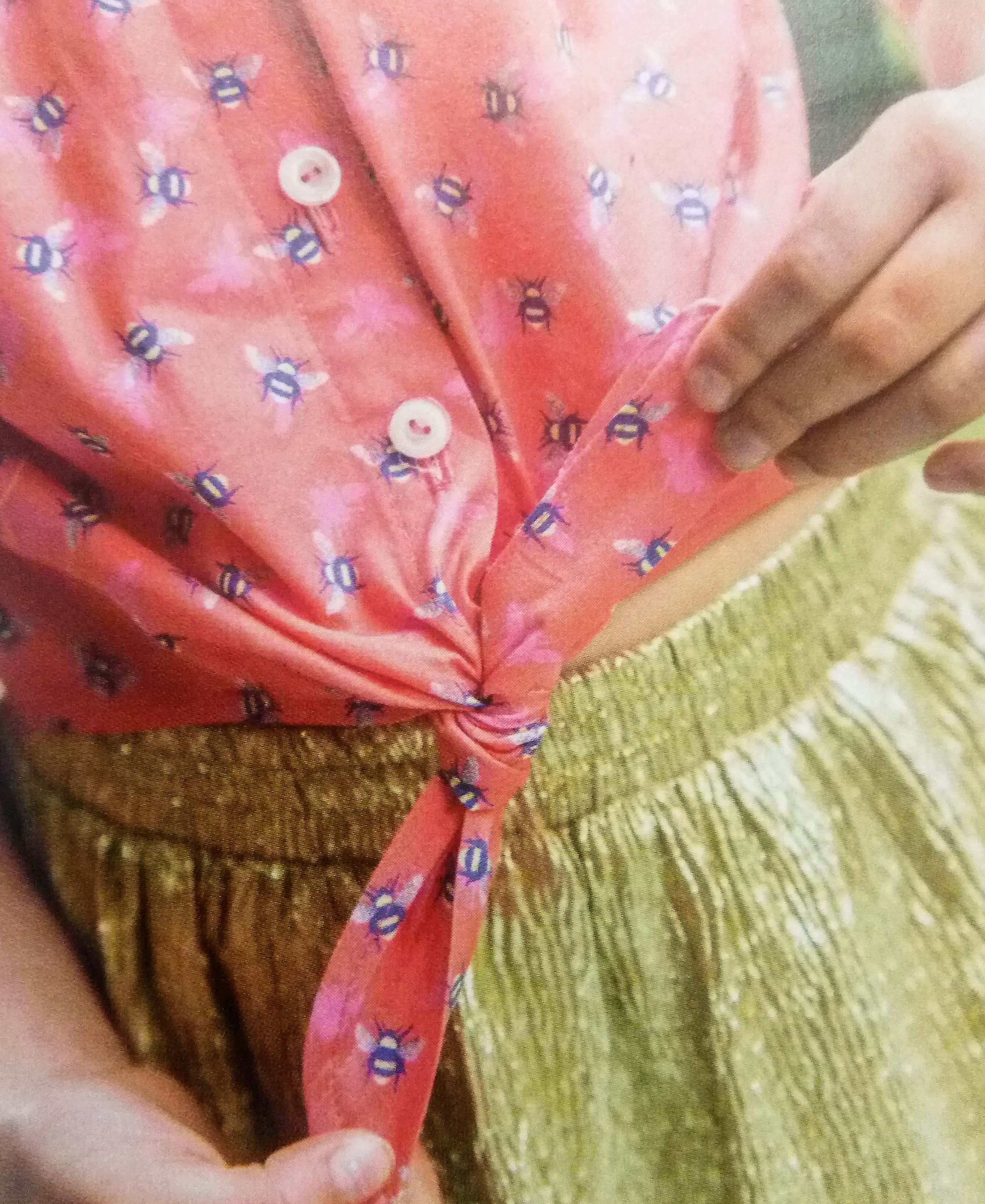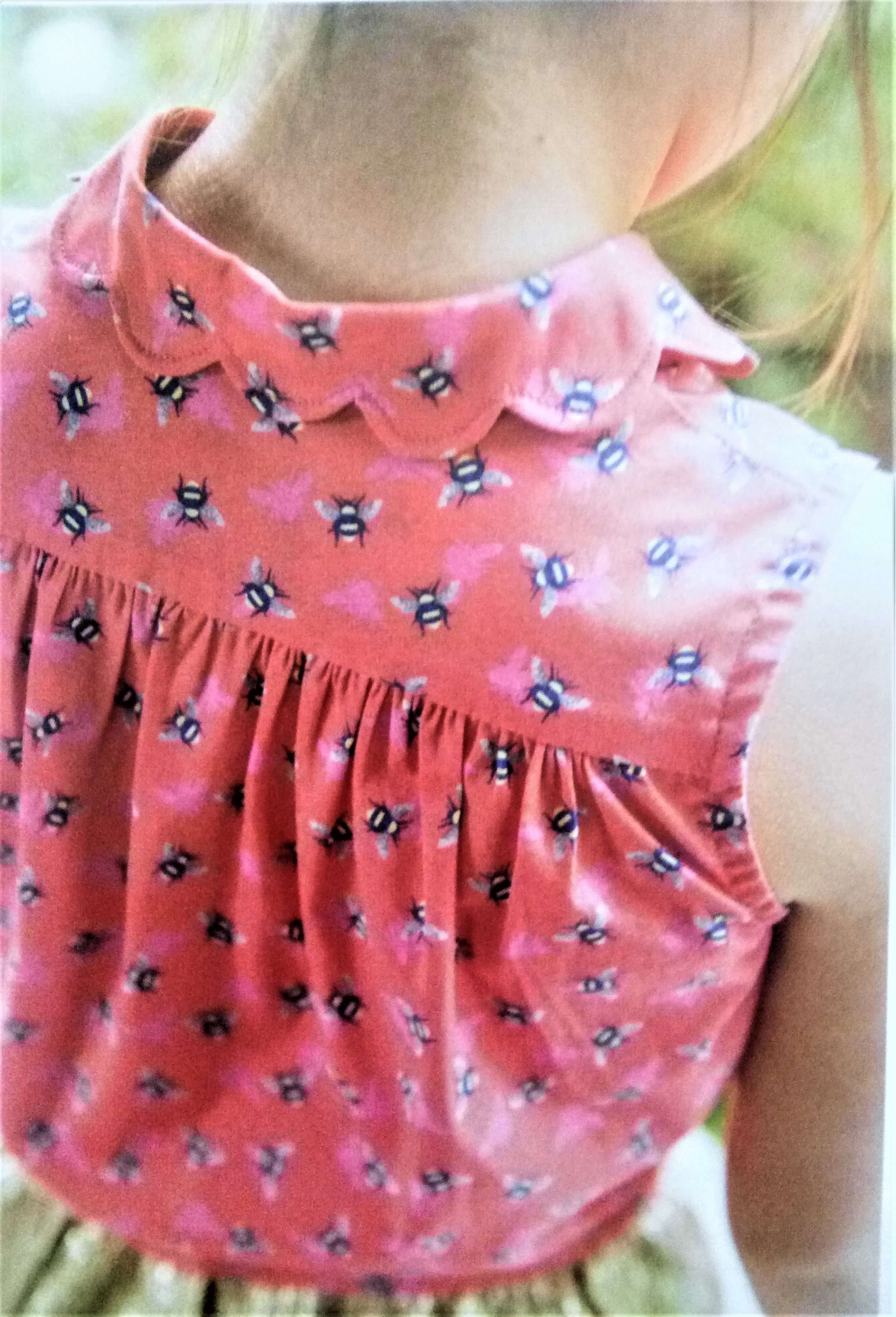 Sur la photo on voit un chemisier d’été sans manches que l’on noue devant . Il a un petit col festonné . Effectivement nos petites filles vont adorer ce modèle, c’est évident 😀 .