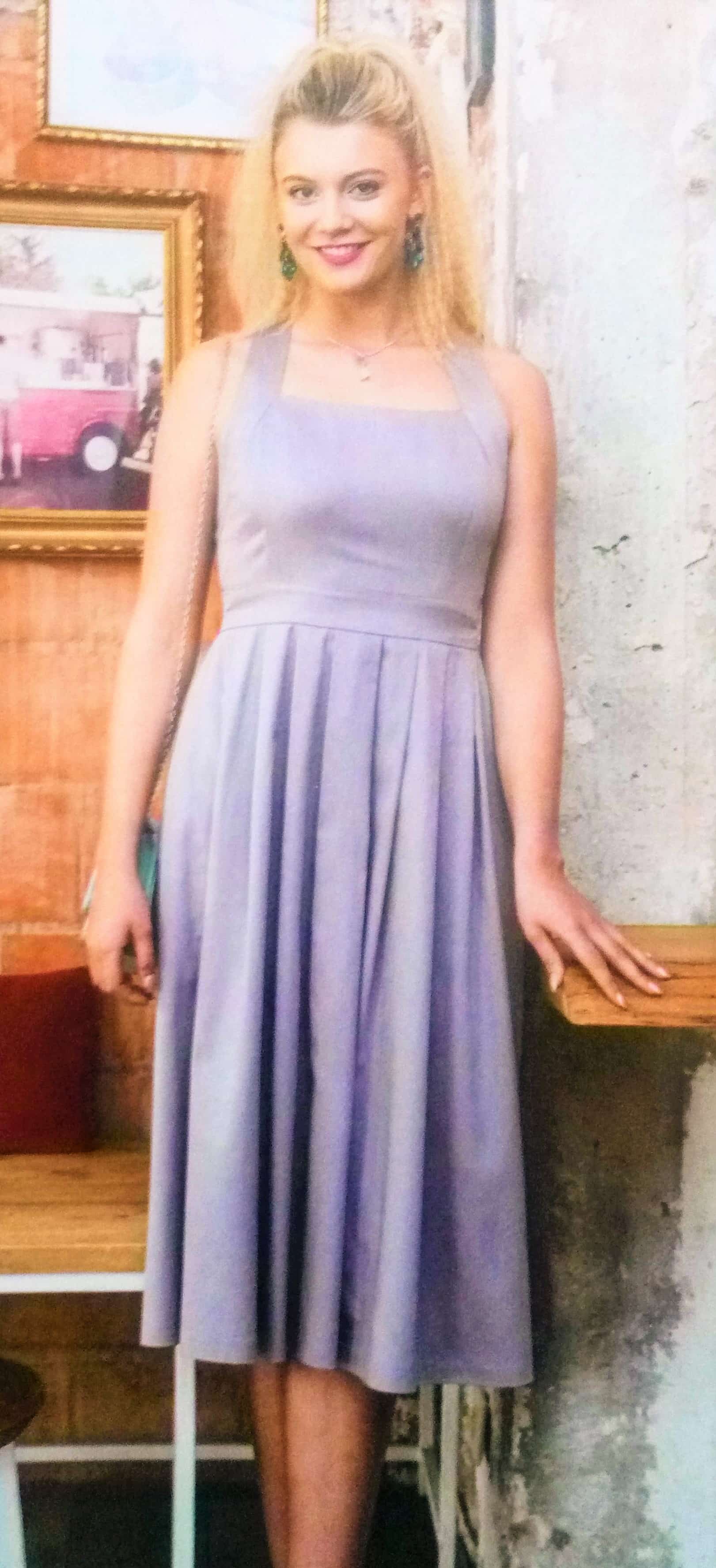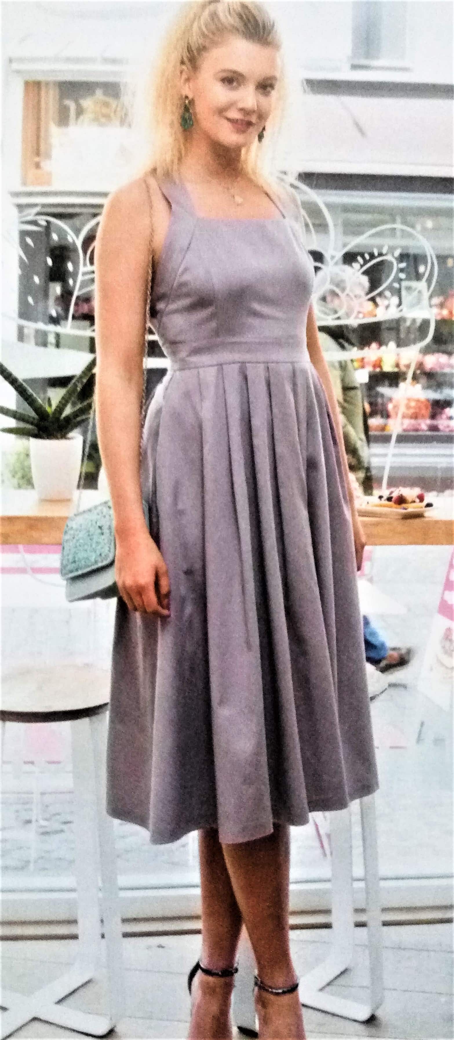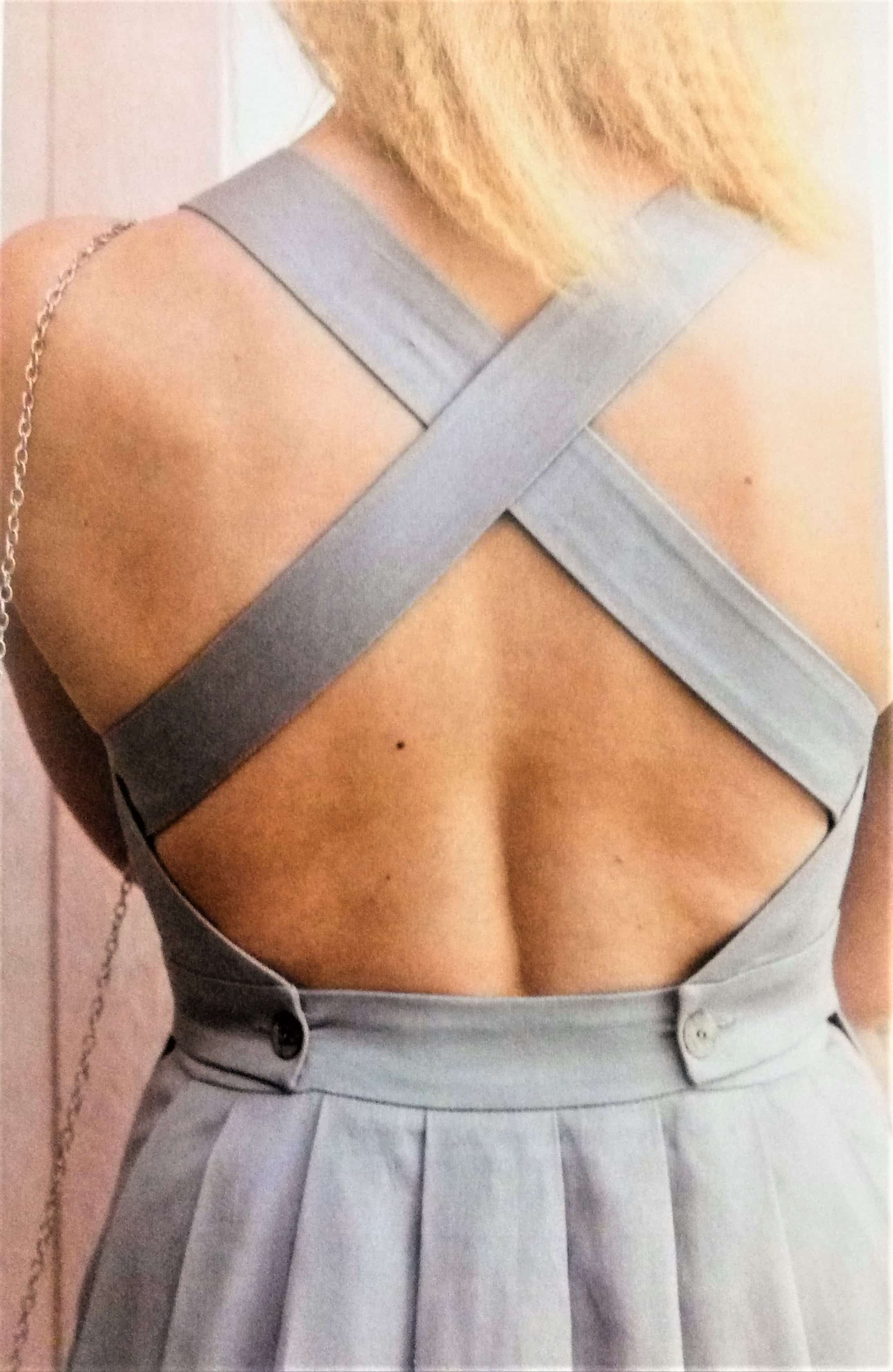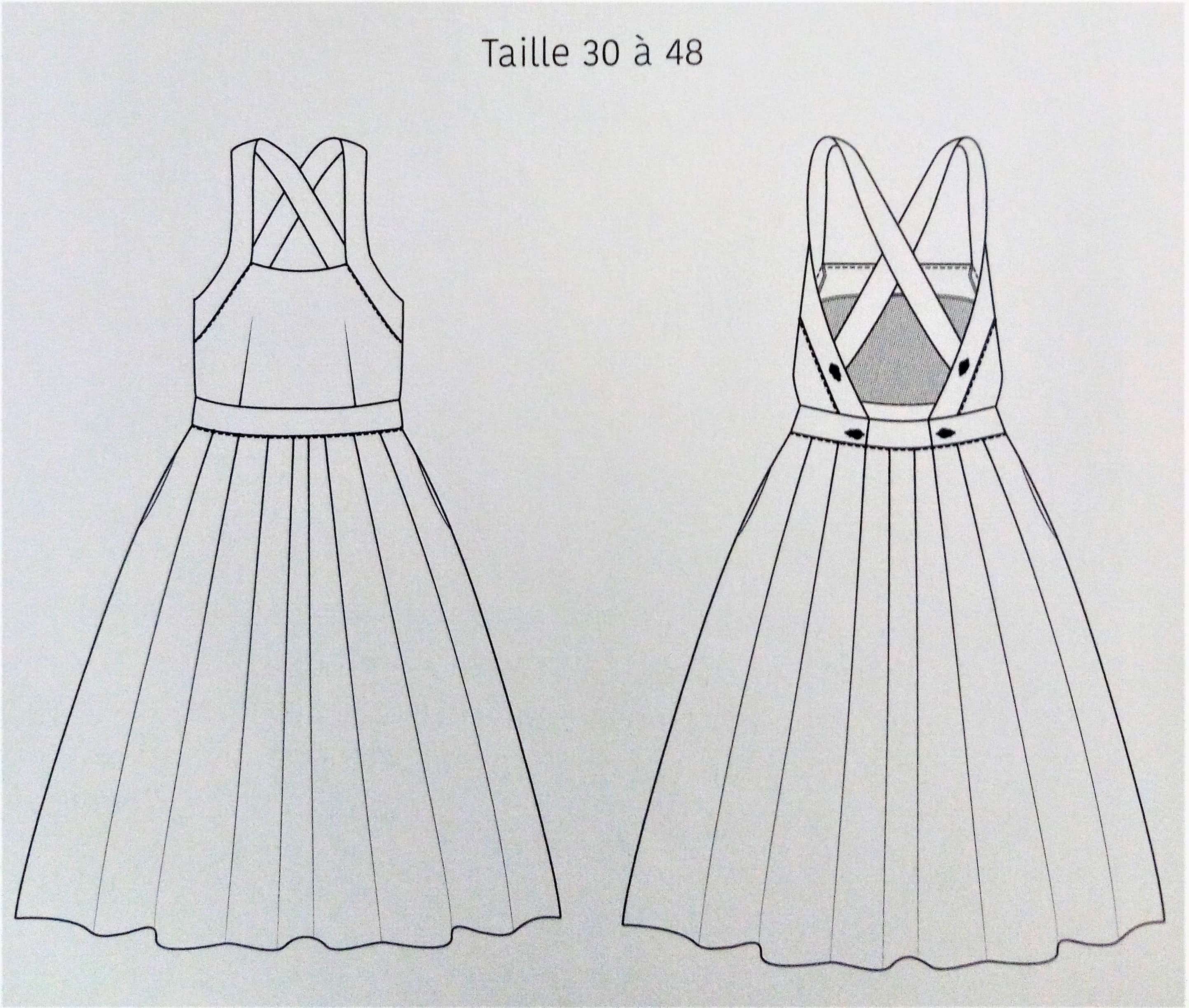 La robe Ramona est superbe , elle va de la taille 30 à 48 . Le haut est moulant , façon salopette près du corps. La jupe a elle beaucoup d’ampleur grâce à des plis plats. Les bretelles se croisent et s’attachent dans le dos .