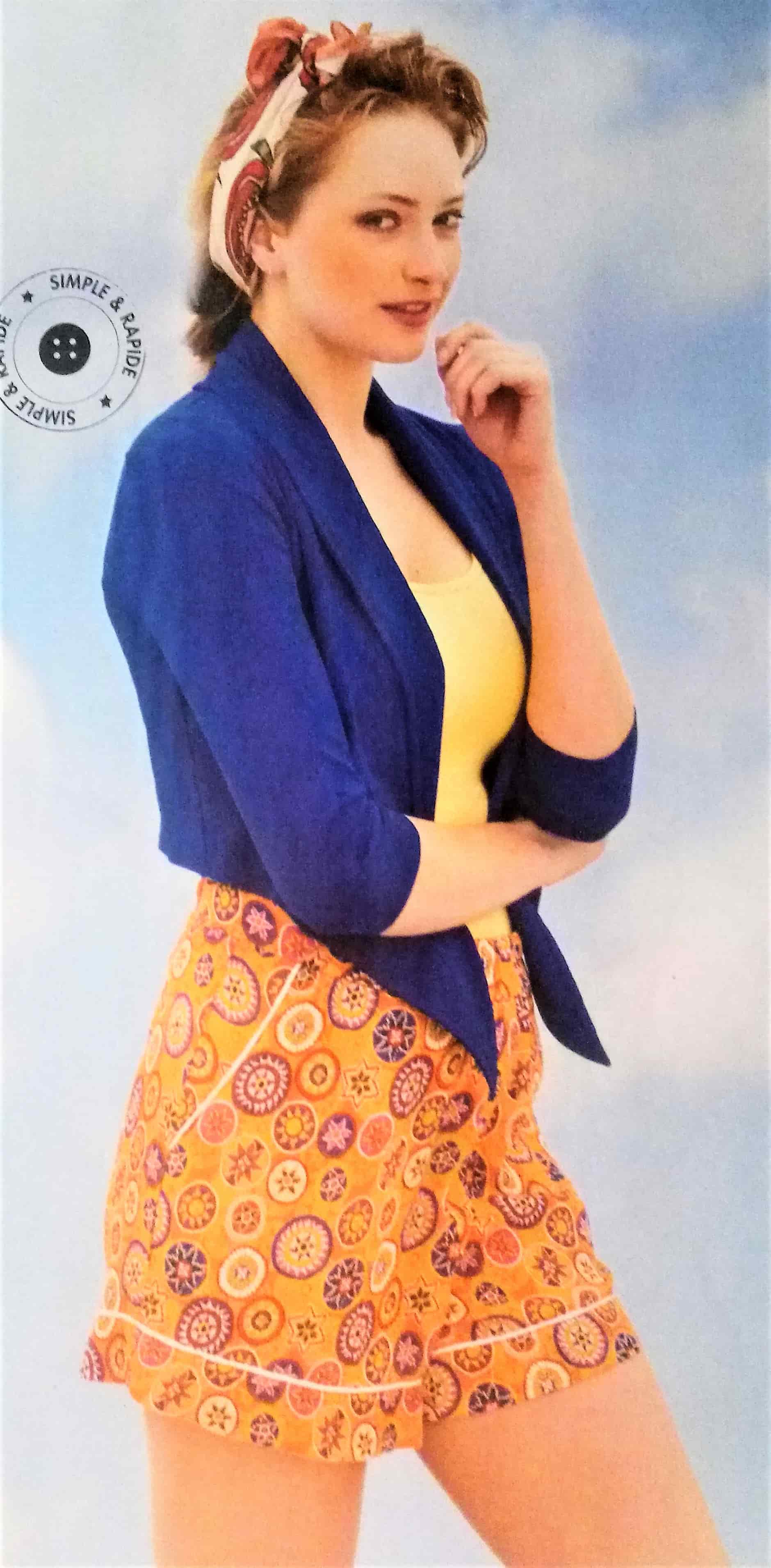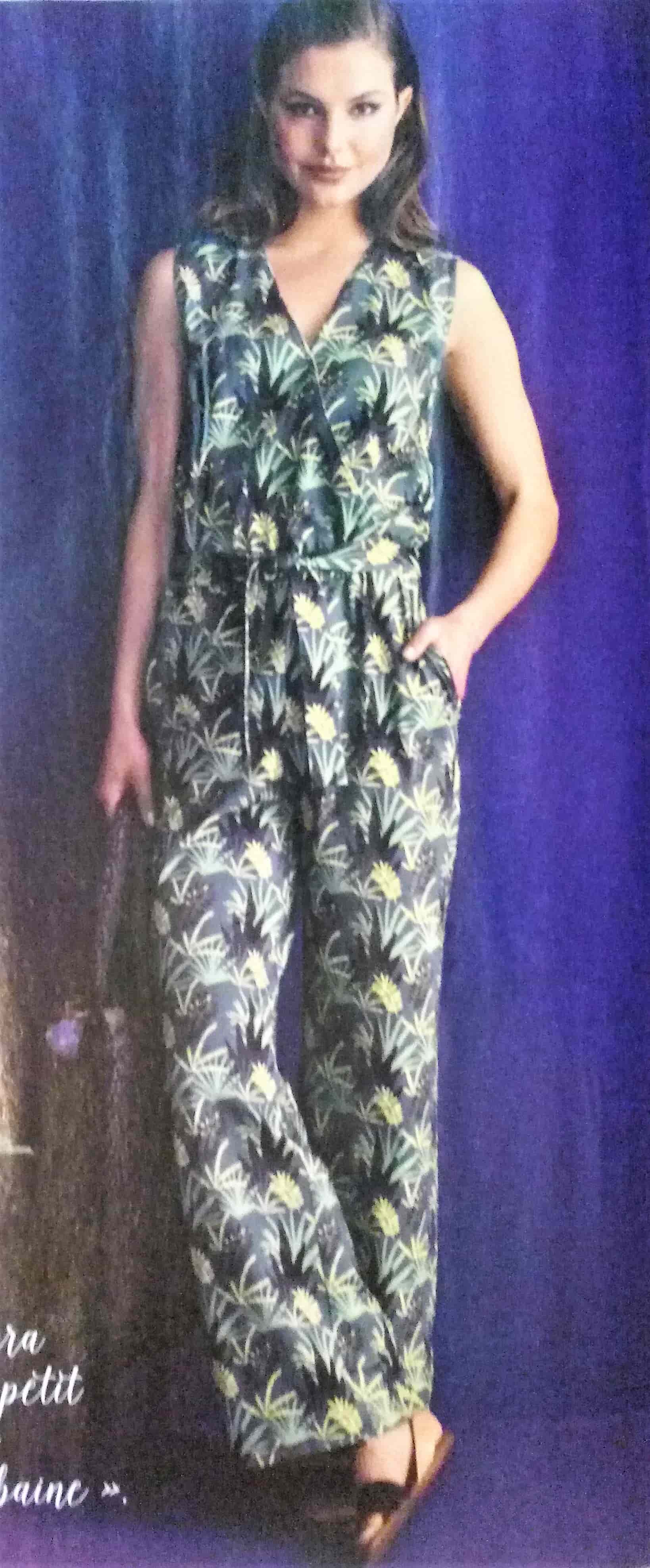 J’aime beaucoup ce combishort . Il possède des manches papillons. Il y a un pan asymétrique sur le bas dans le prolongement du croisé de l’encolure. Il vient assagir le short . Personnellement je le verrai bien de la même longueur que le bas pour un effet jupe short plutôt sympa.