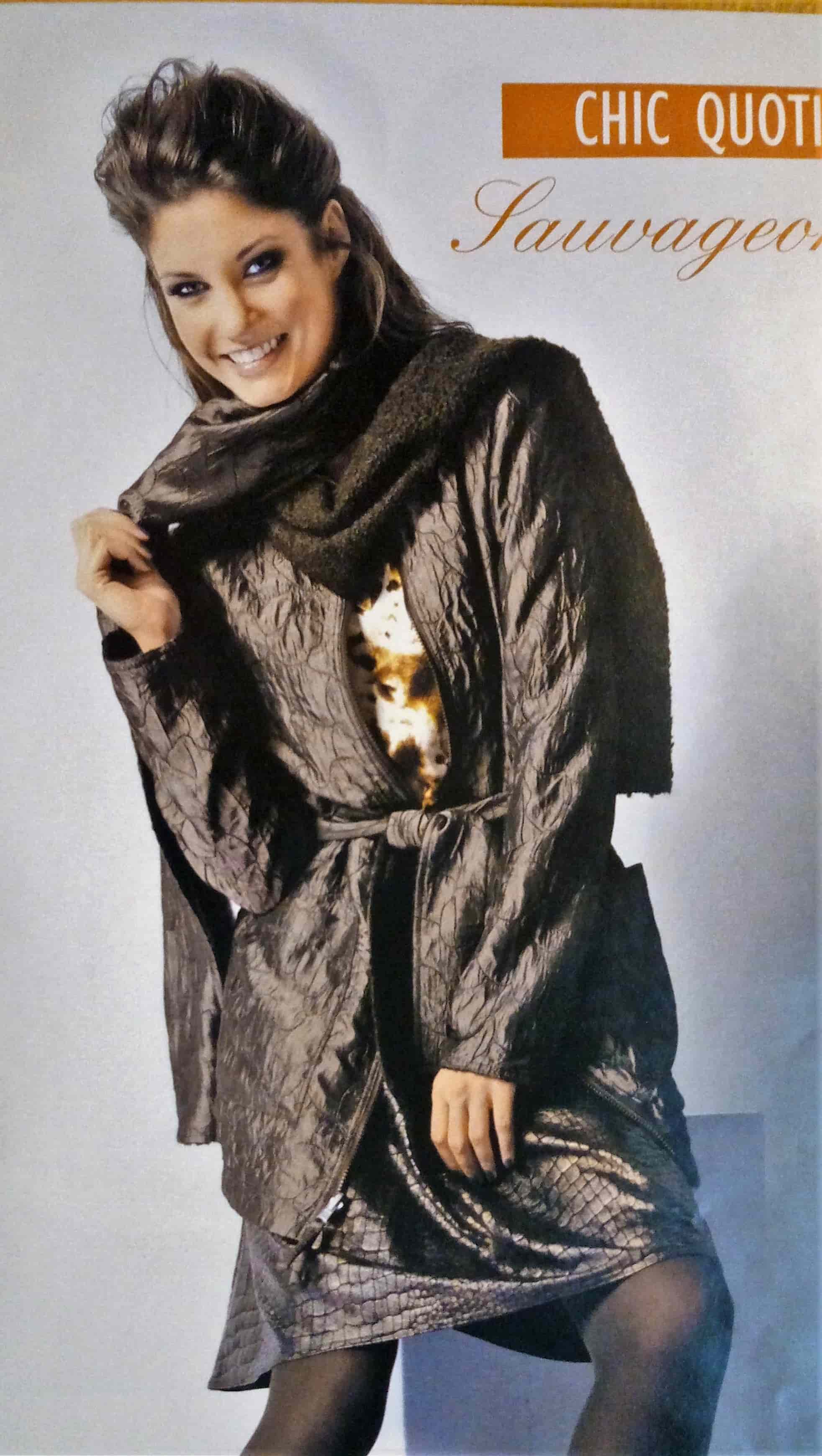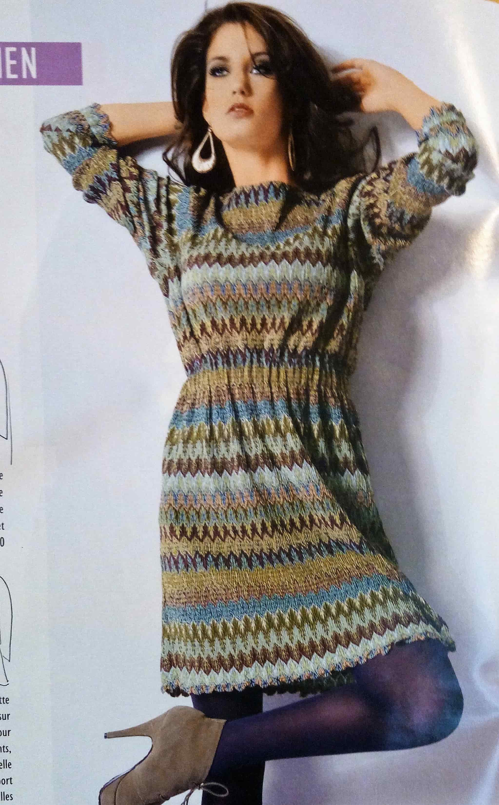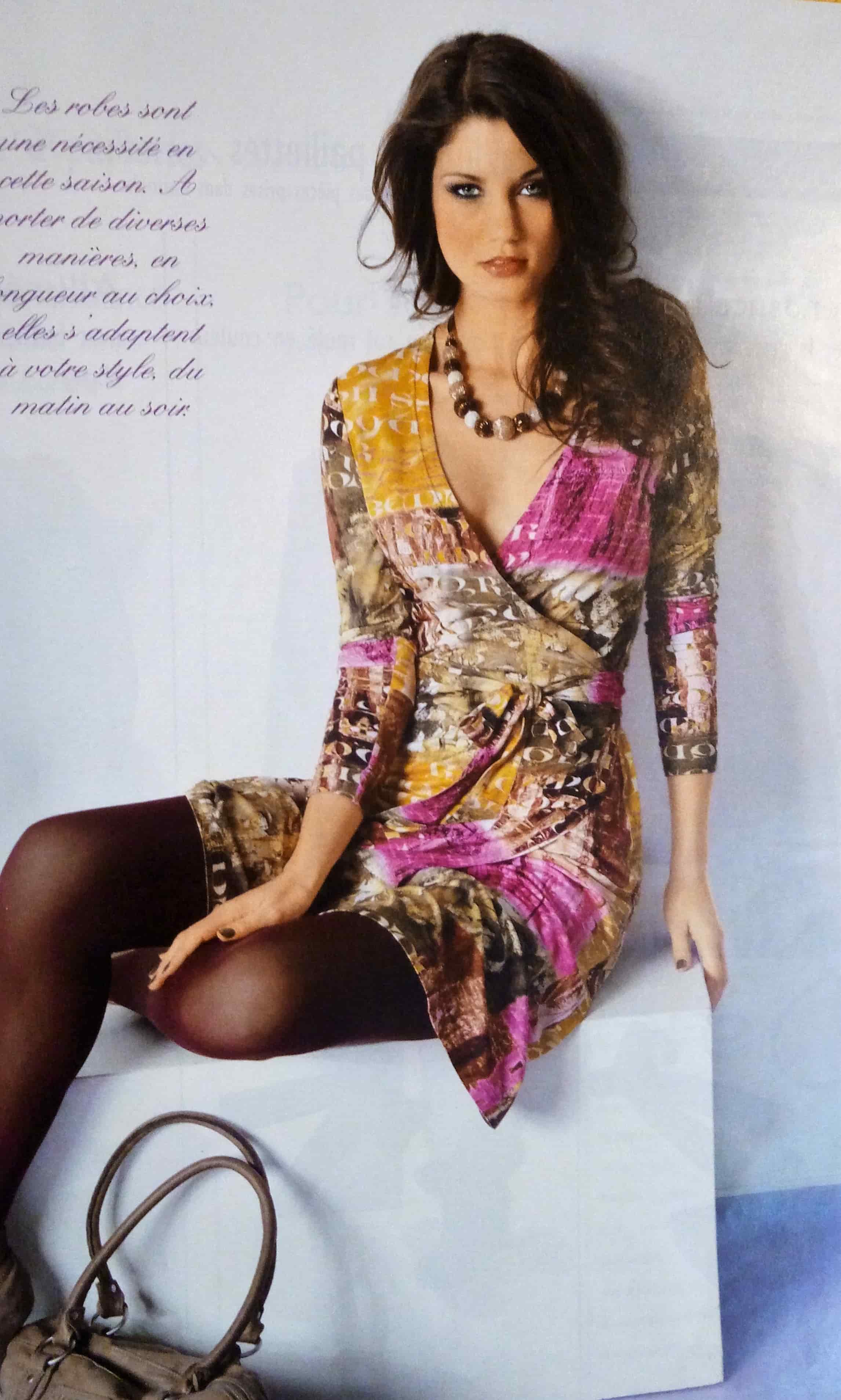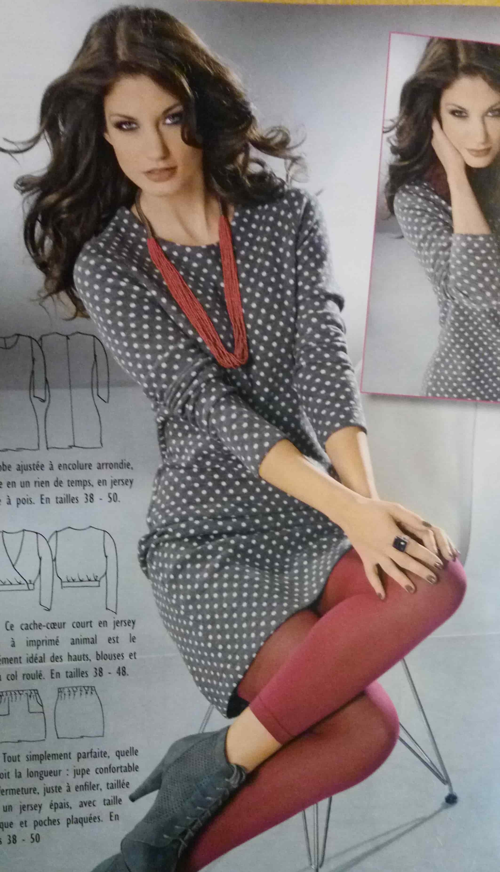 J’aime les robes porte feuilles avec encolure cache cœur, mais ce genre de modèle de robe est courant. Chaque revue a fait la sienne , tout comme le bomber ou la combi… Elle reste cependant très jolie , c’est le tissus qui fera la difference. Elle est à manches longues , légèrement évasée sur les cotés. Elle va de la taille 38 au 48.