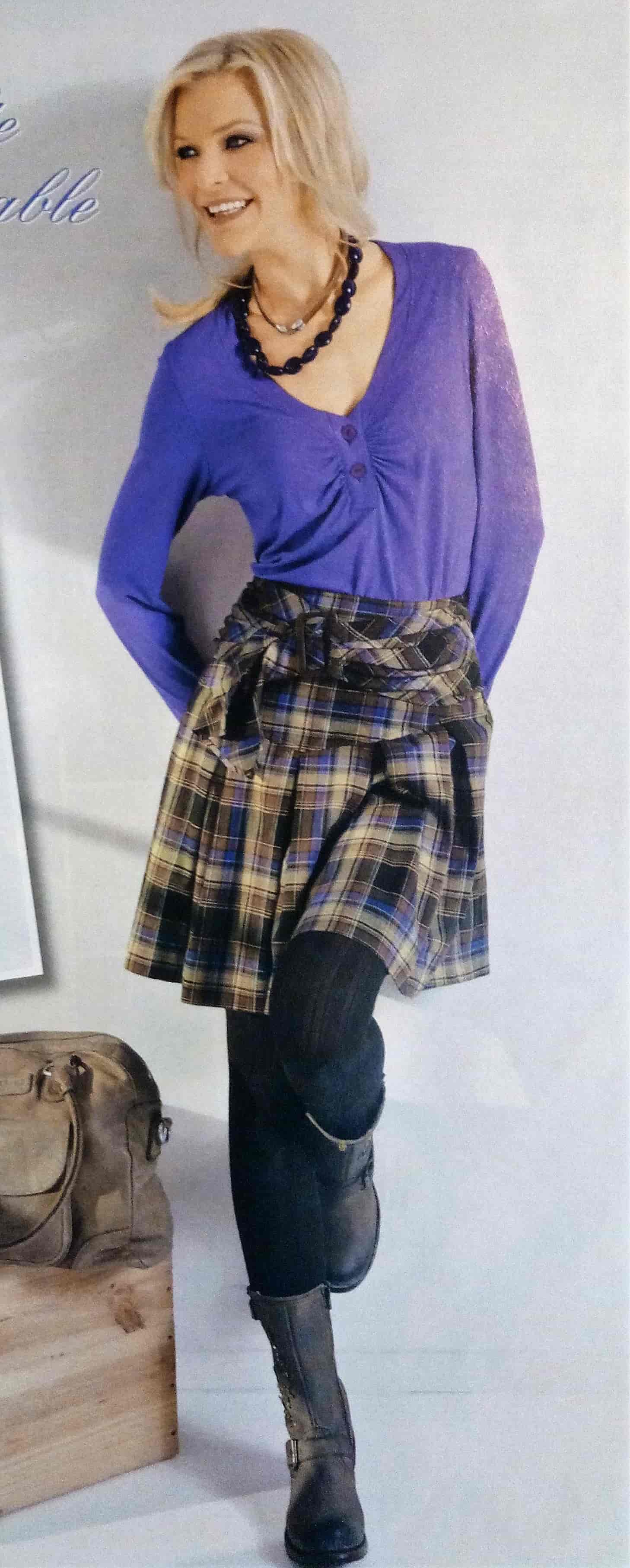 La jupe à gros plis possède un empiècement qui se termine en pointe et maintient les plis. Elle est ici réalisée en tissus à carreaux . La ceinture nouée vient rajeunir le modèle. Elle va du 38 au 50.