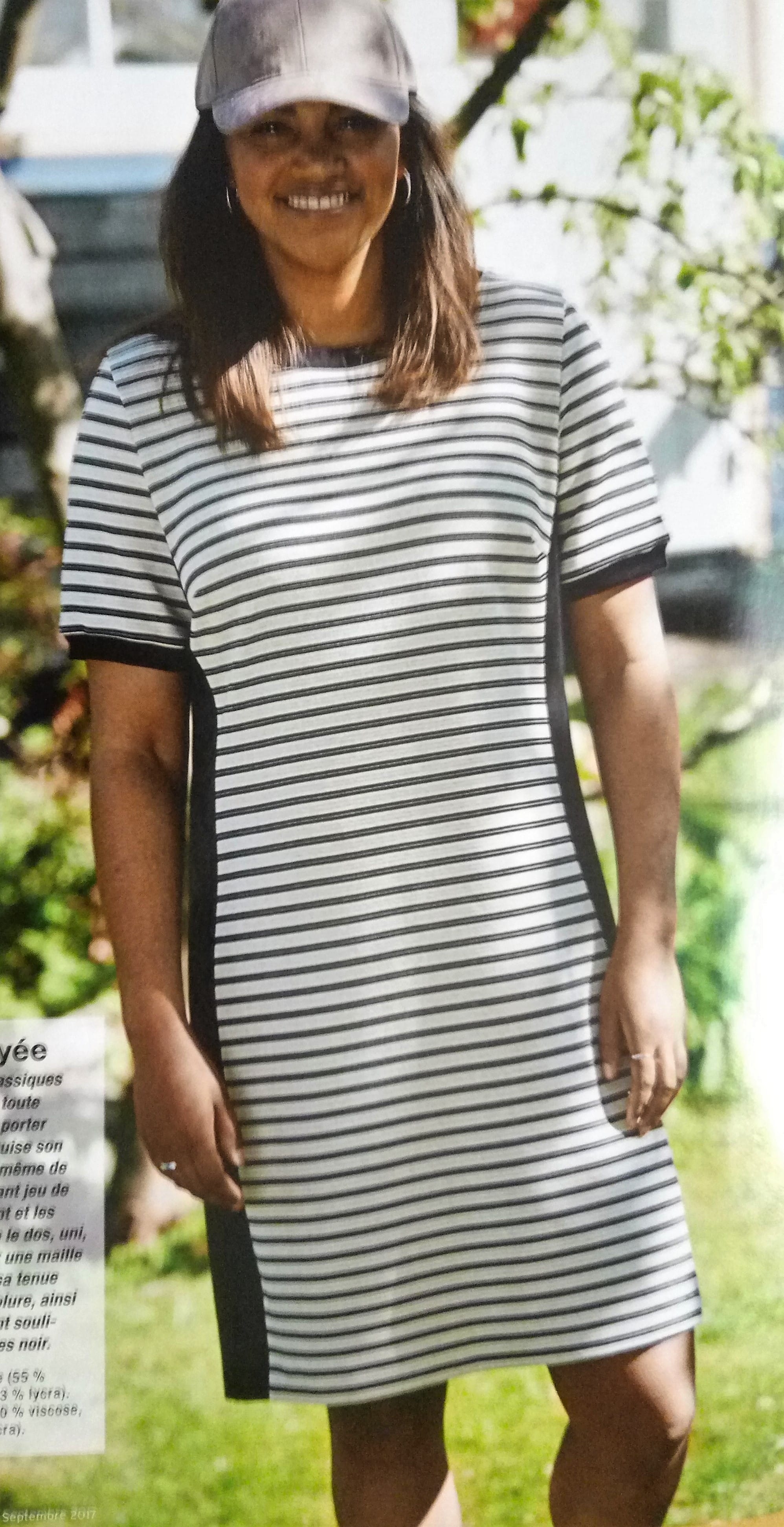 Bien que non concernée, je dis bravo pour le fait de présenter une robe de grossesse. Elle a des petits mancherons , un gros plis creux sur le devant et le dos. Elle se boutonne dans le dos. Elle va de la taille 36 à la taille 46.