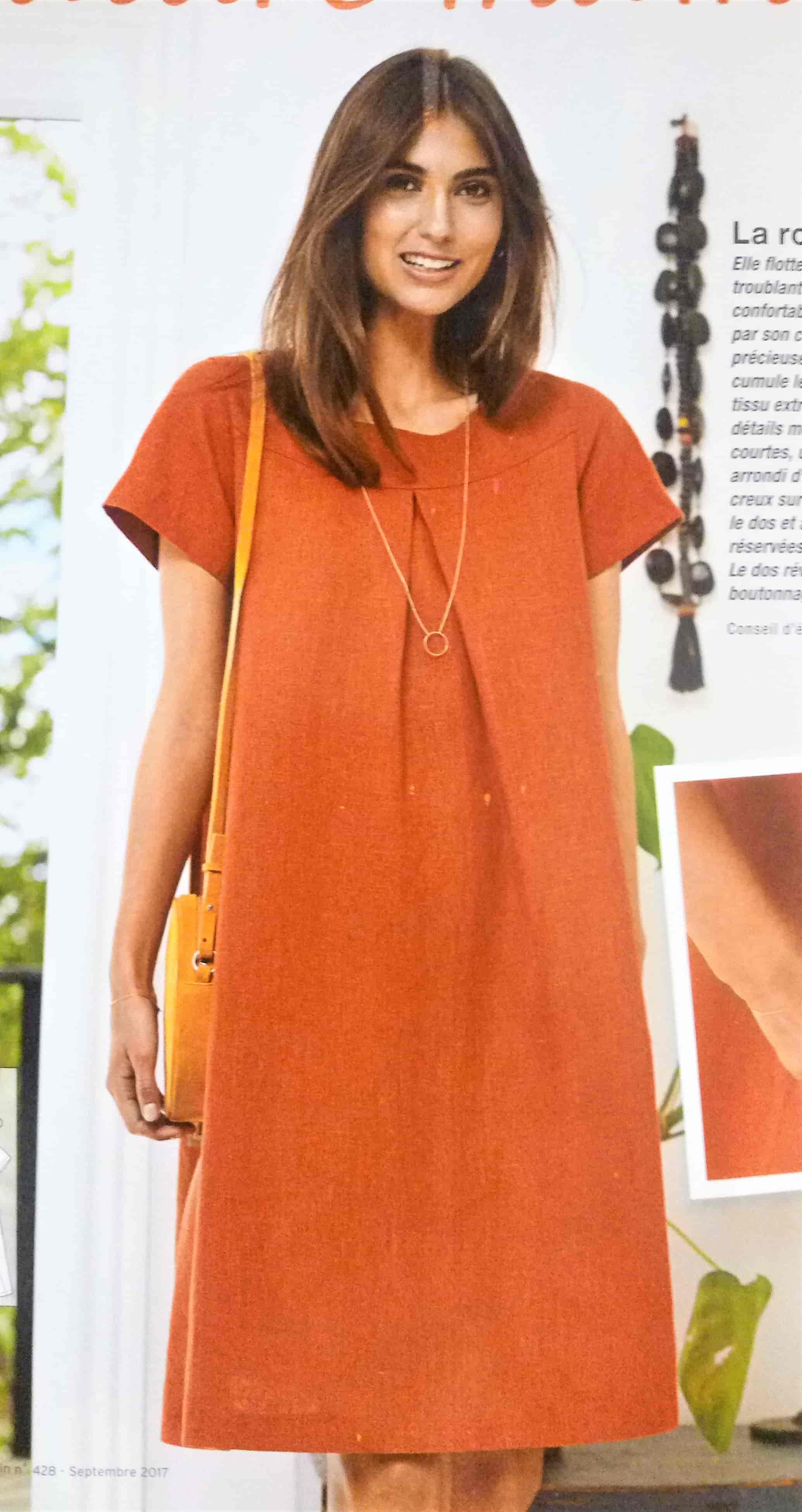On fait continuer un peu l’été , avec cette robe. Elle est sans manches, boutonnée sur le long du devant , et a un col à pied de col. Deux larges pans pris dans la couture de côtés se nouent sur le devant pour apporter un peu de fantaisie. Elle va de la taille 36 au 46.