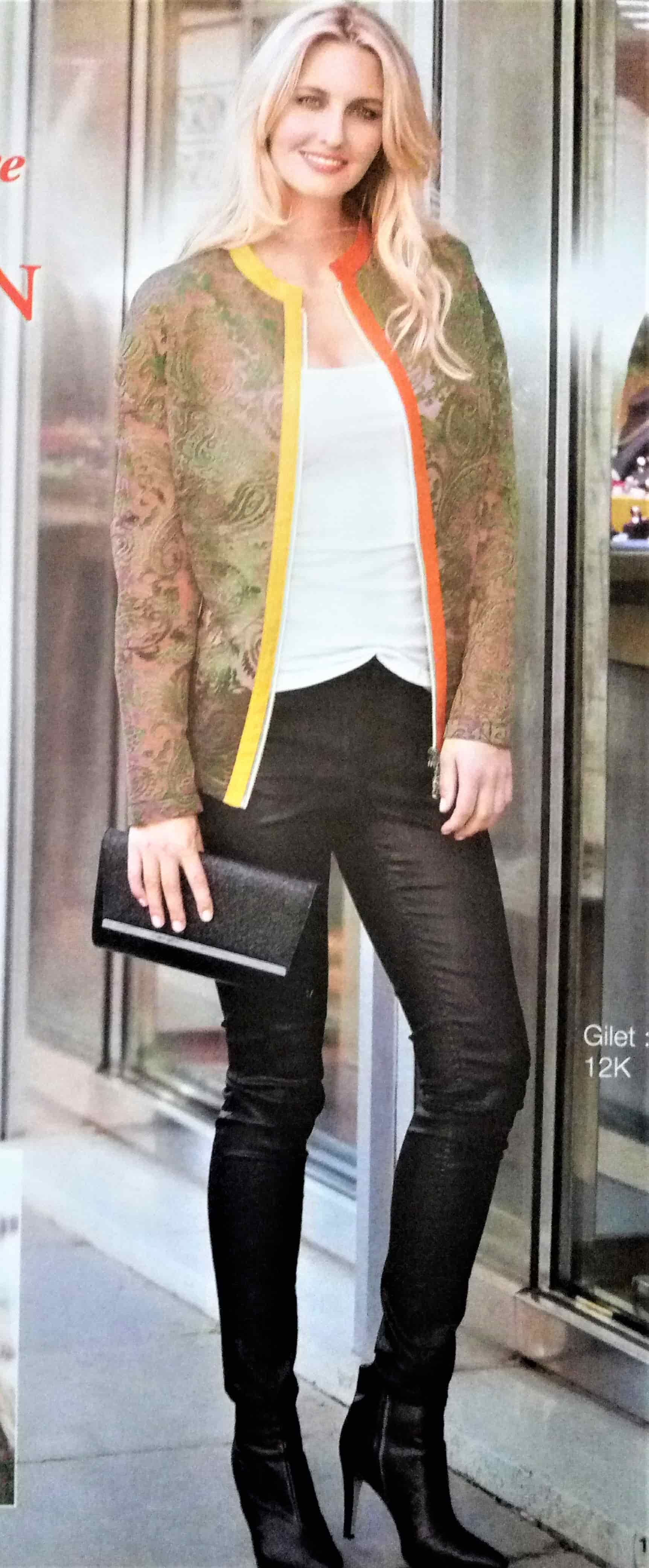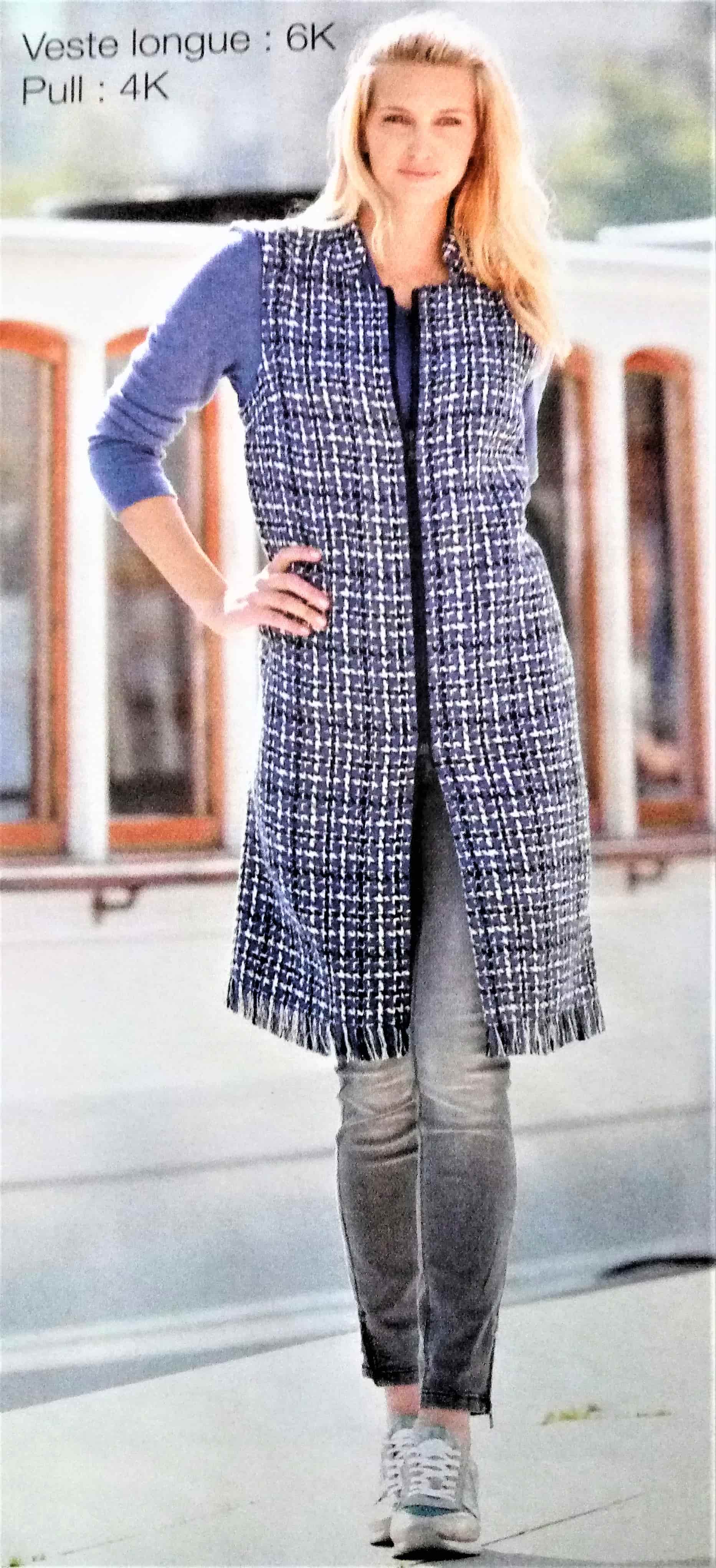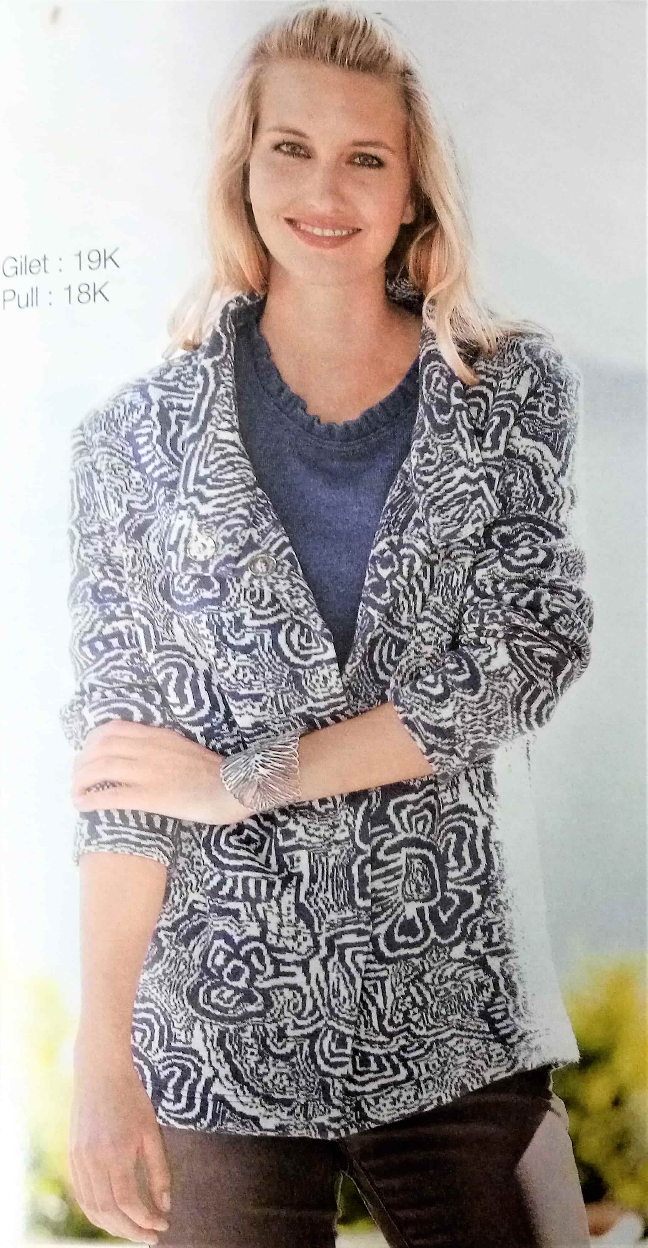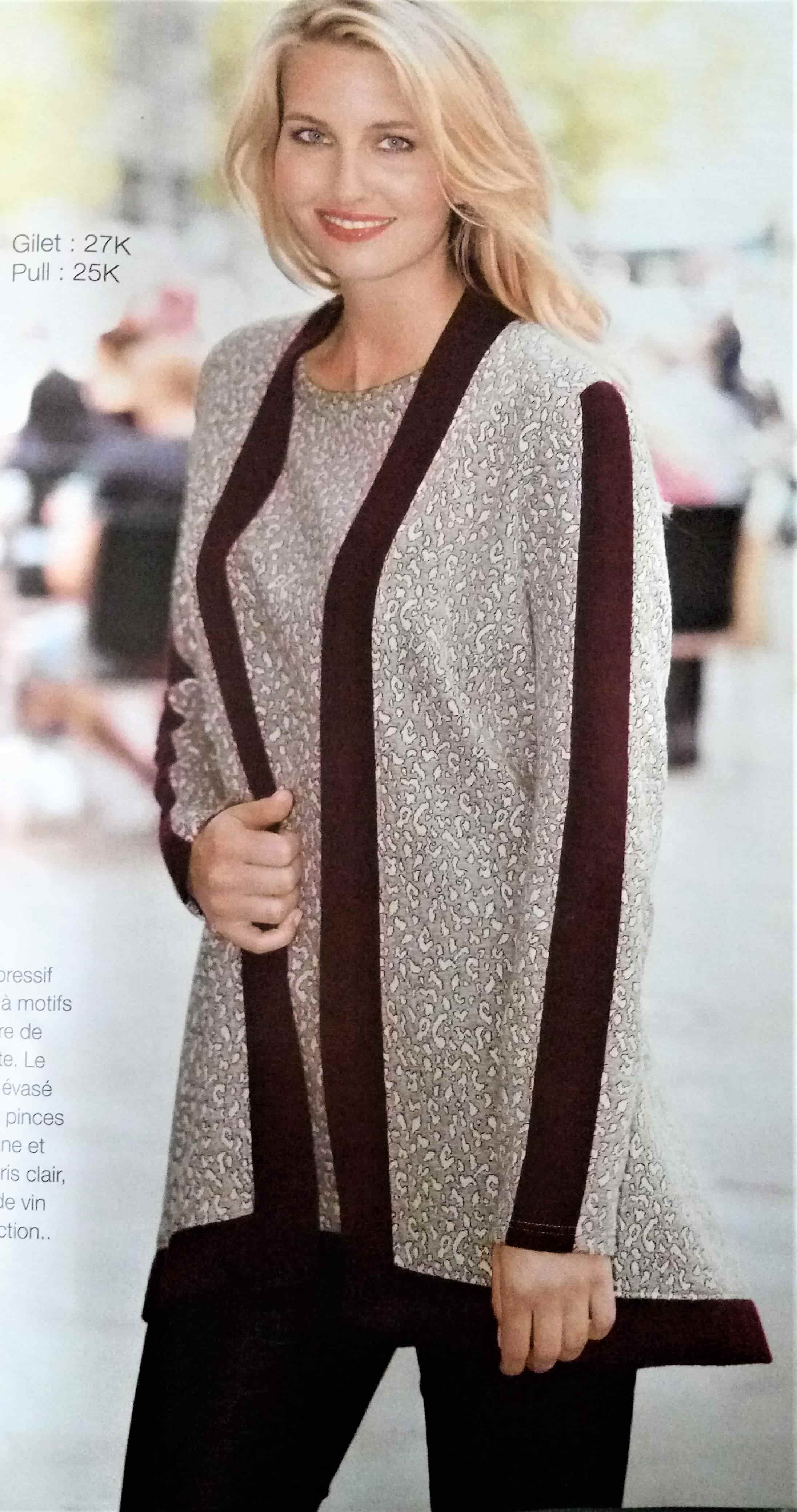 J’aime beaucoup ce petit gilet (mais pas dans cet imprimé), il est à manches longues et possède un boutonnage asymétrique. Il peut se porter ouvert ou fermé pour bien couvrir le cou.