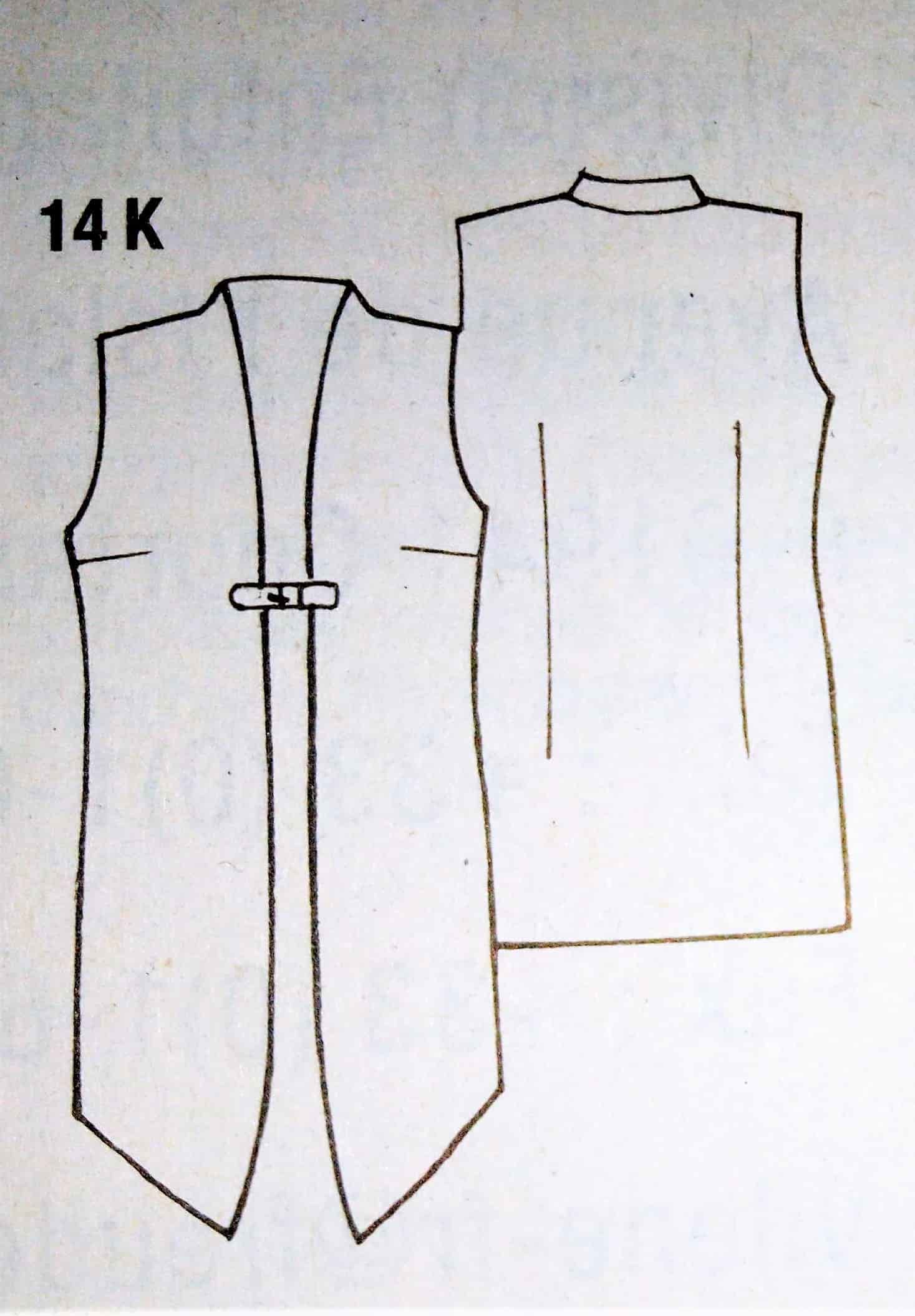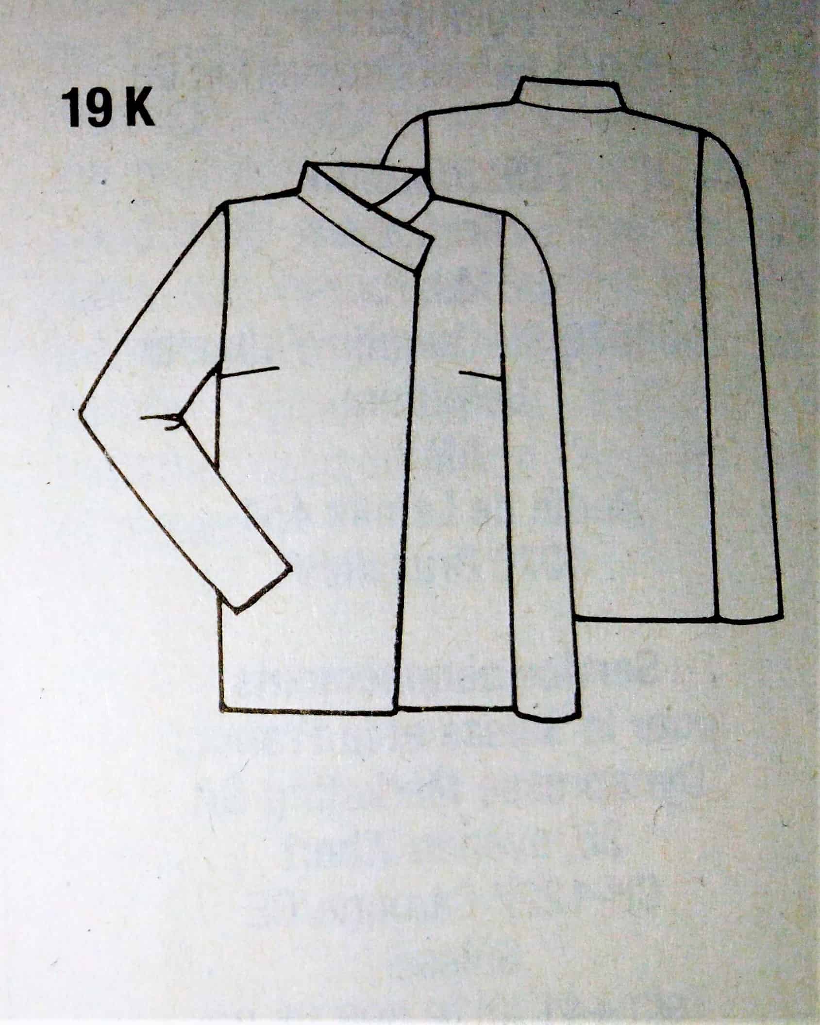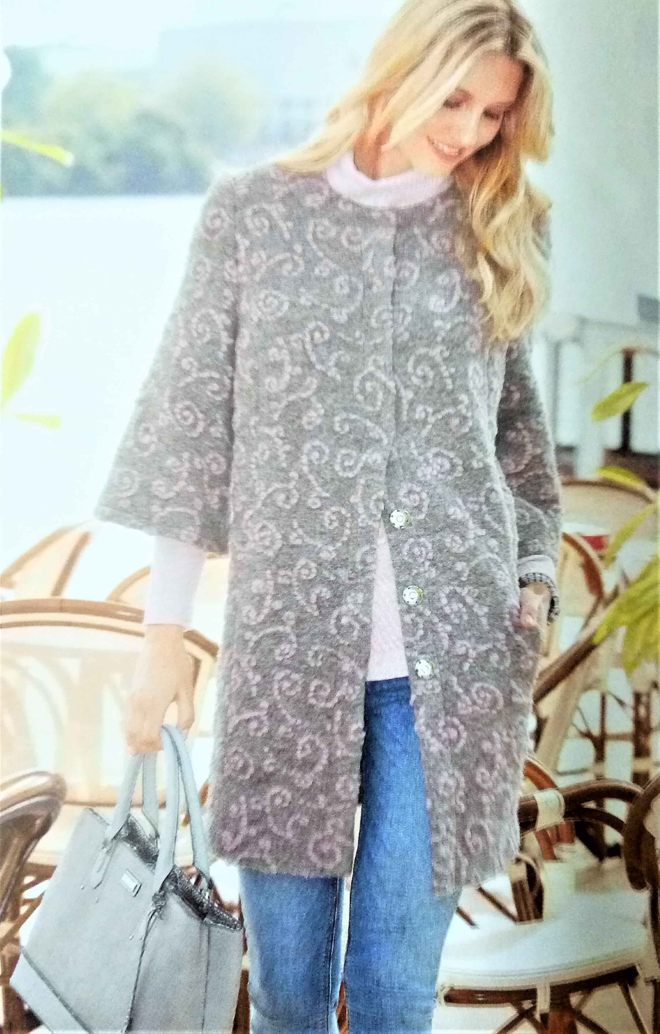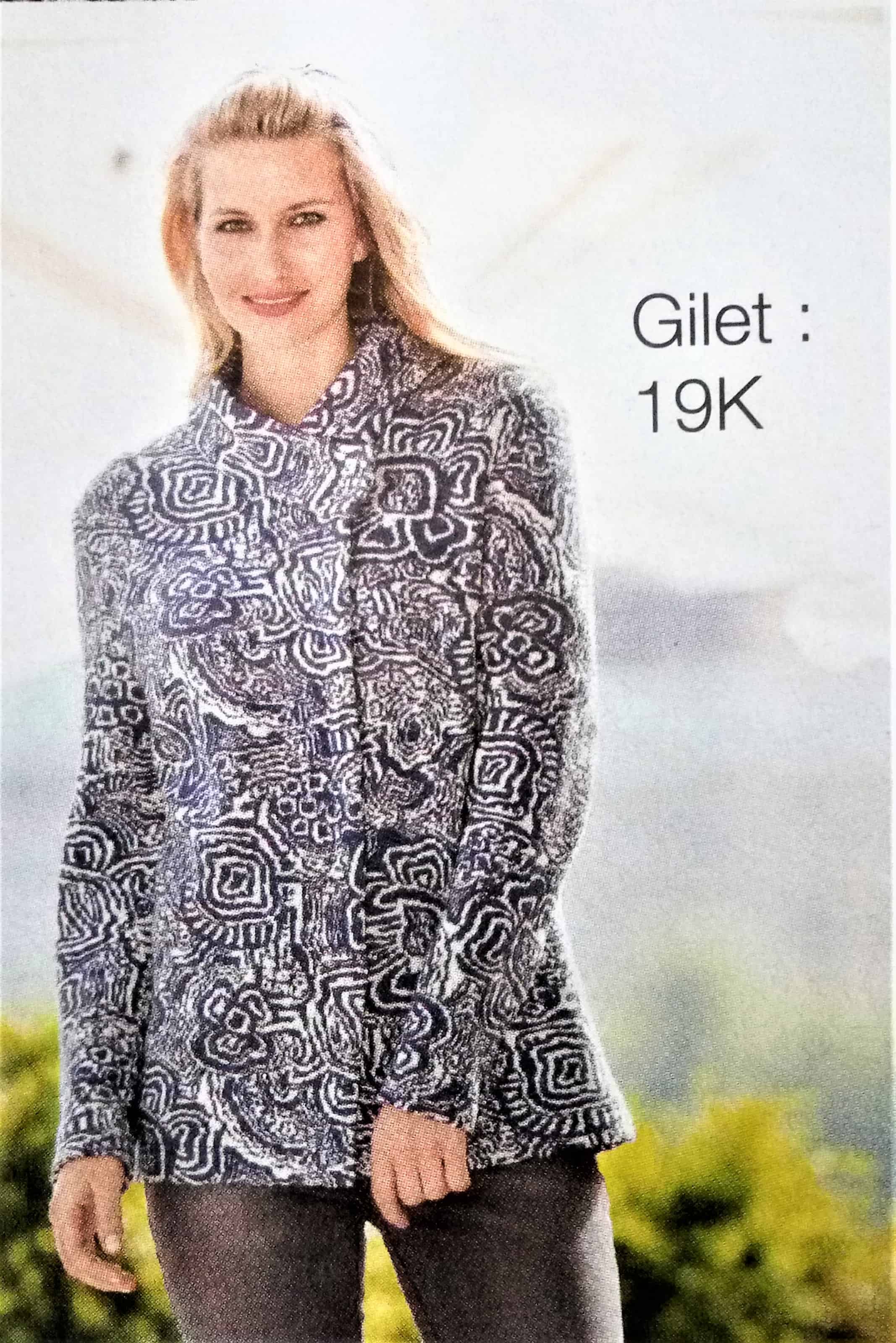 J’aime beaucoup ce petit gilet (mais pas dans cet imprimé), il est à manches longues et possède un boutonnage asymétrique. Il peut se porter ouvert ou fermé pour bien couvrir le cou.