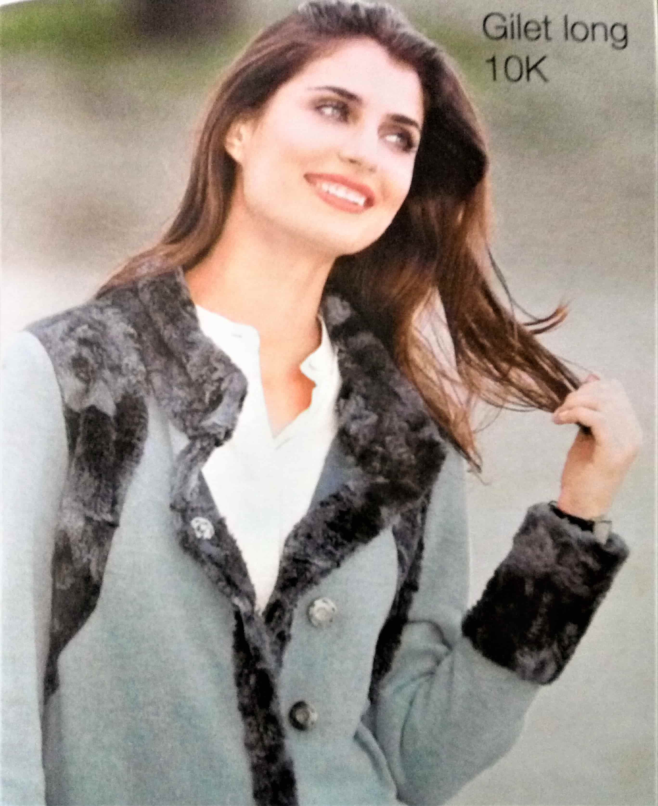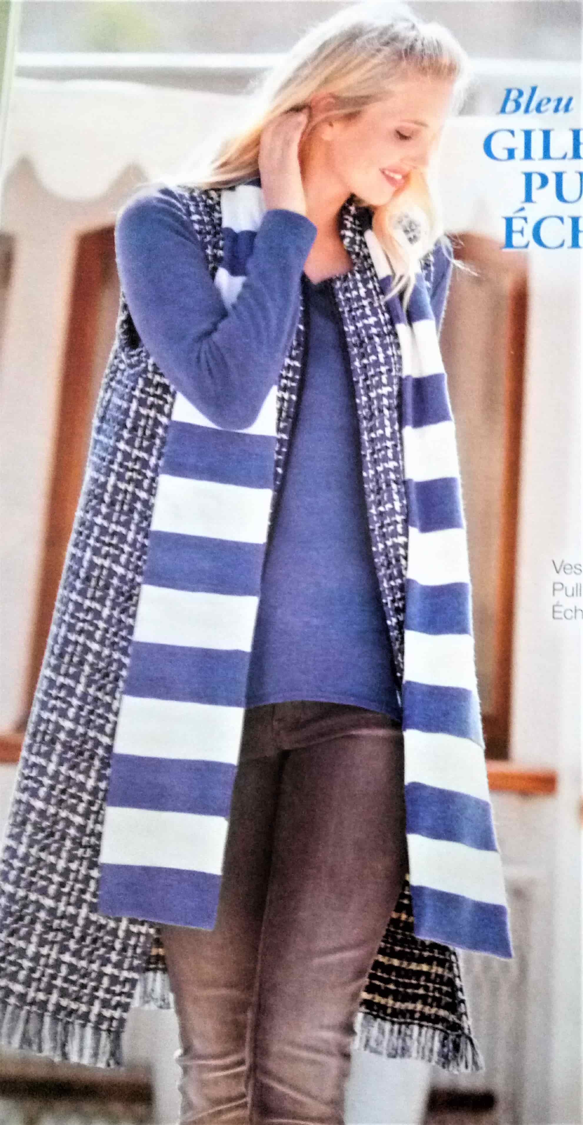 Je trouve ce petit gilet sans manches très beau lui aussi. Simple mais efficace, sur un pull comme sur la photo et un snood. Il est fermé par une bride et les pans se terminent en pointe.