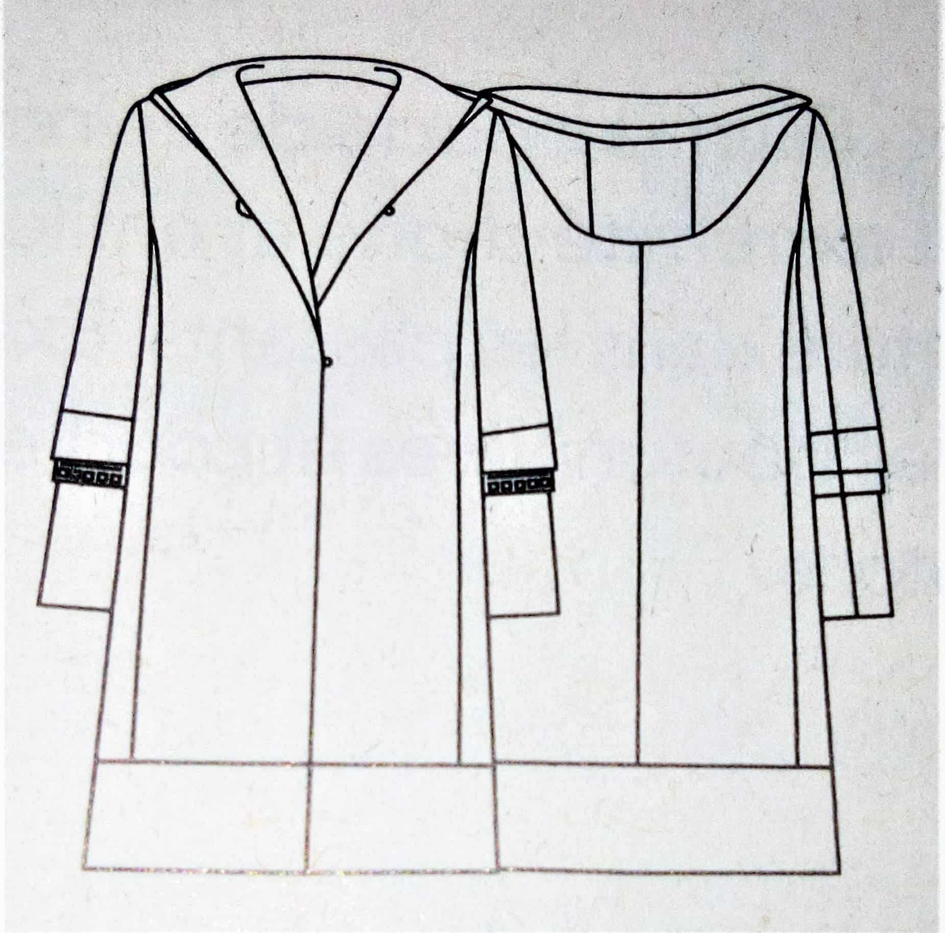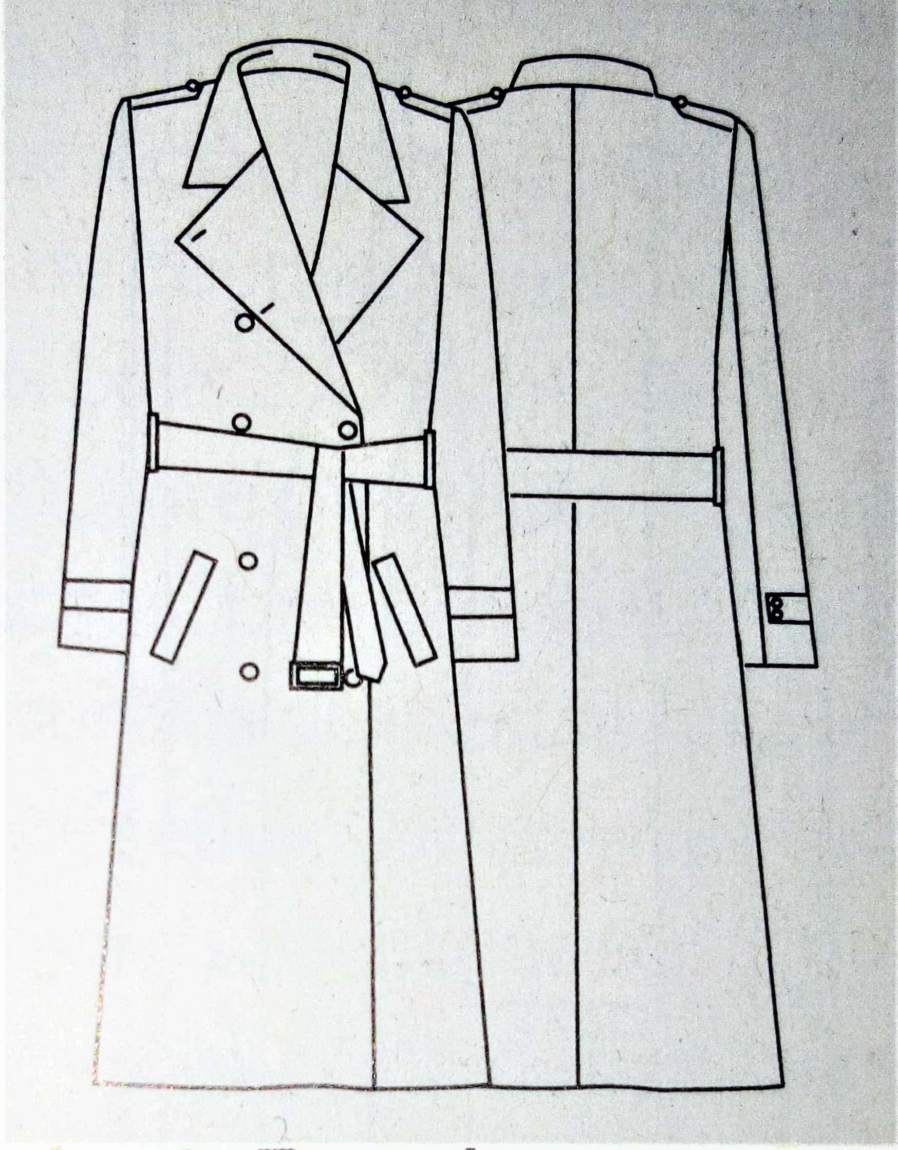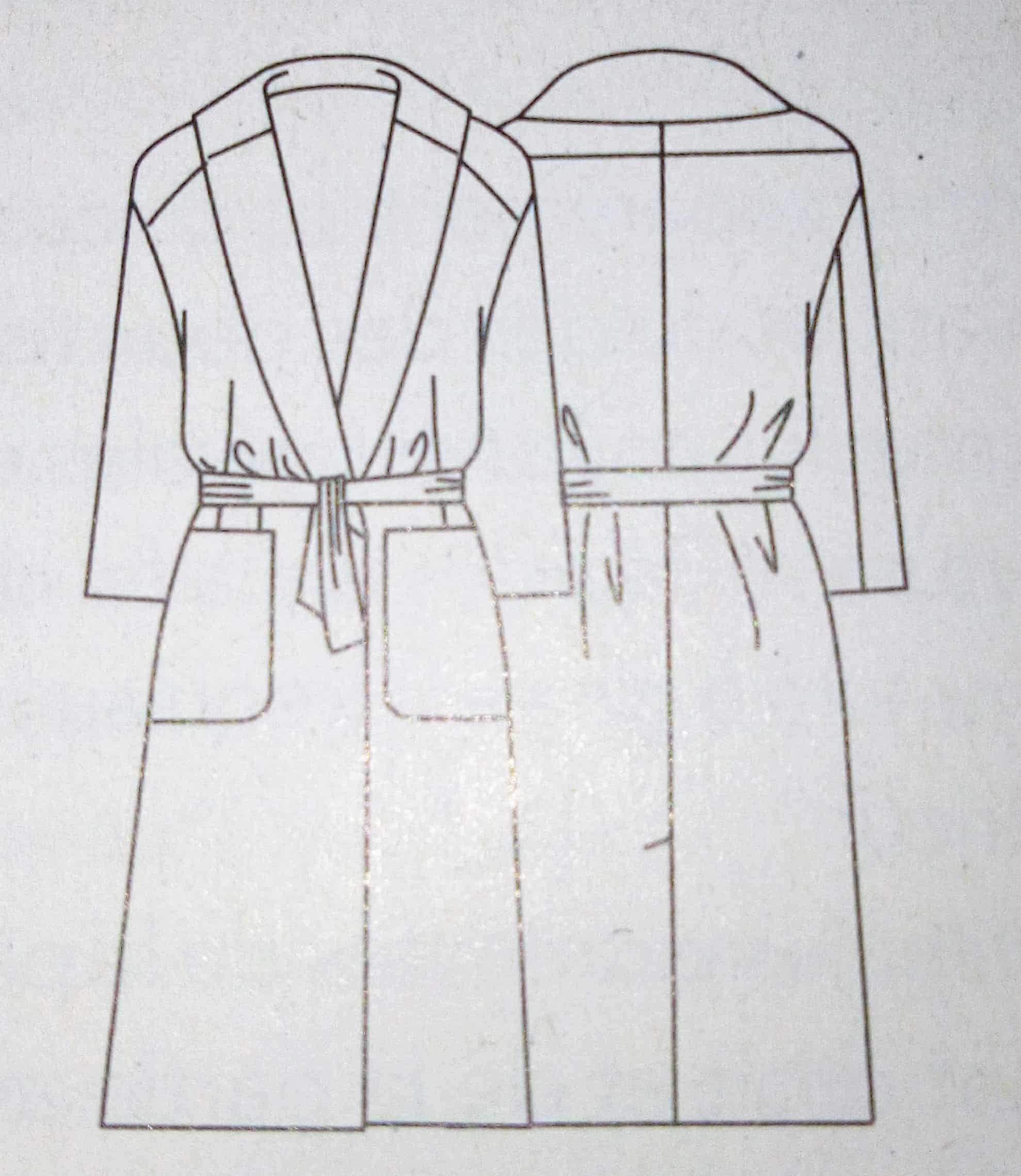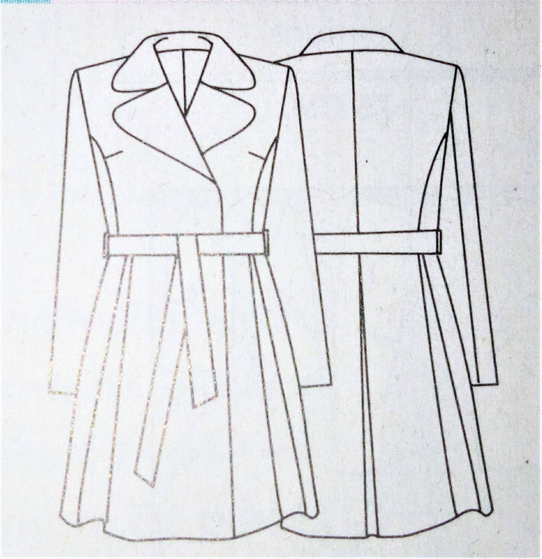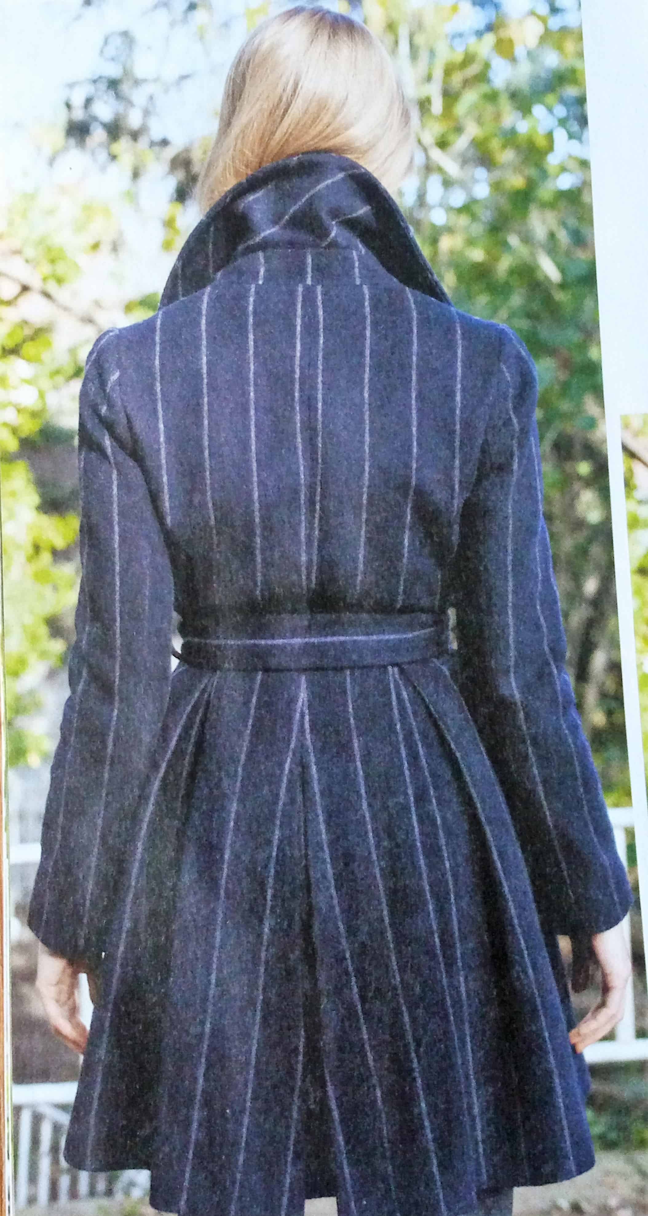 Ce manteau croisé sur le devant est superbe lui aussi. Il possède sur le haut des découpes princesse et des pinces de poitrine. Le bas de est orné de plis creux pour plus d’aisance. Le boutonnage est caché dans la doublure et complété par une ceinture à nouer.