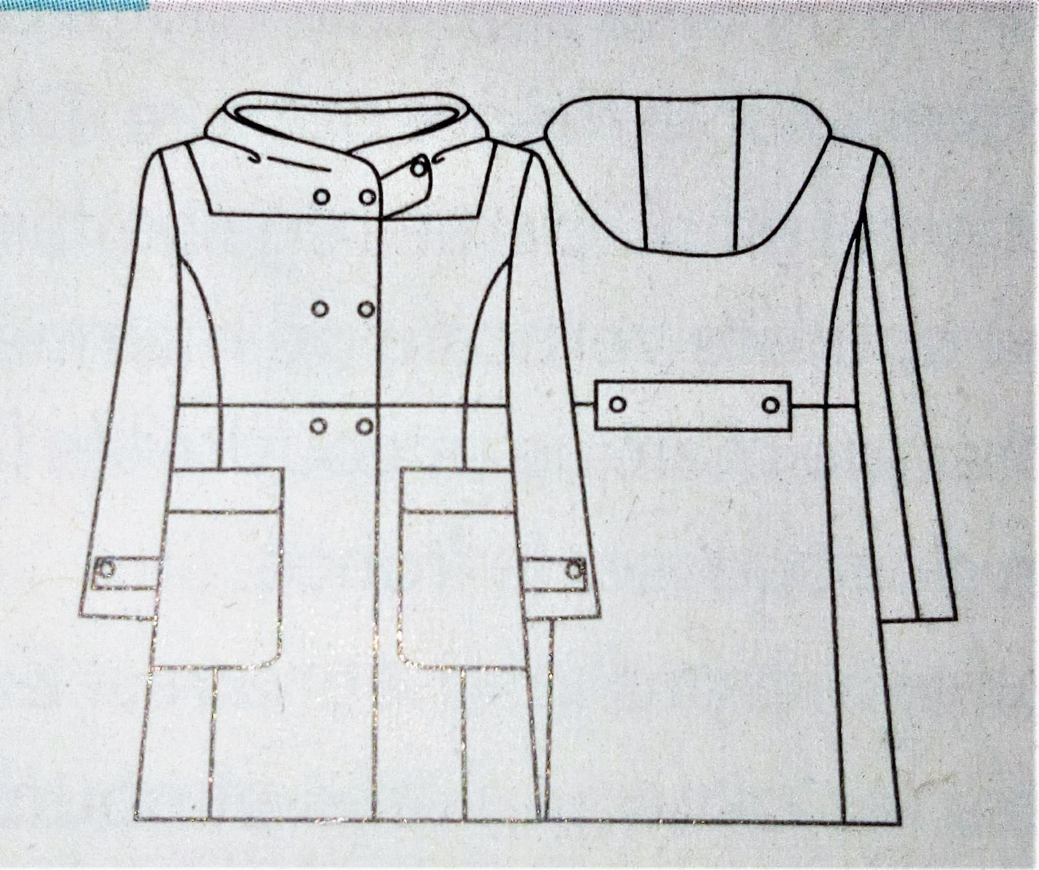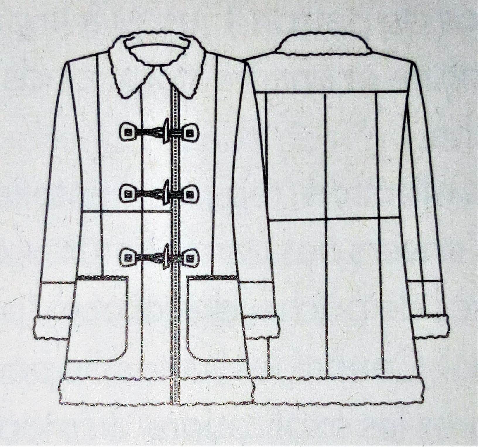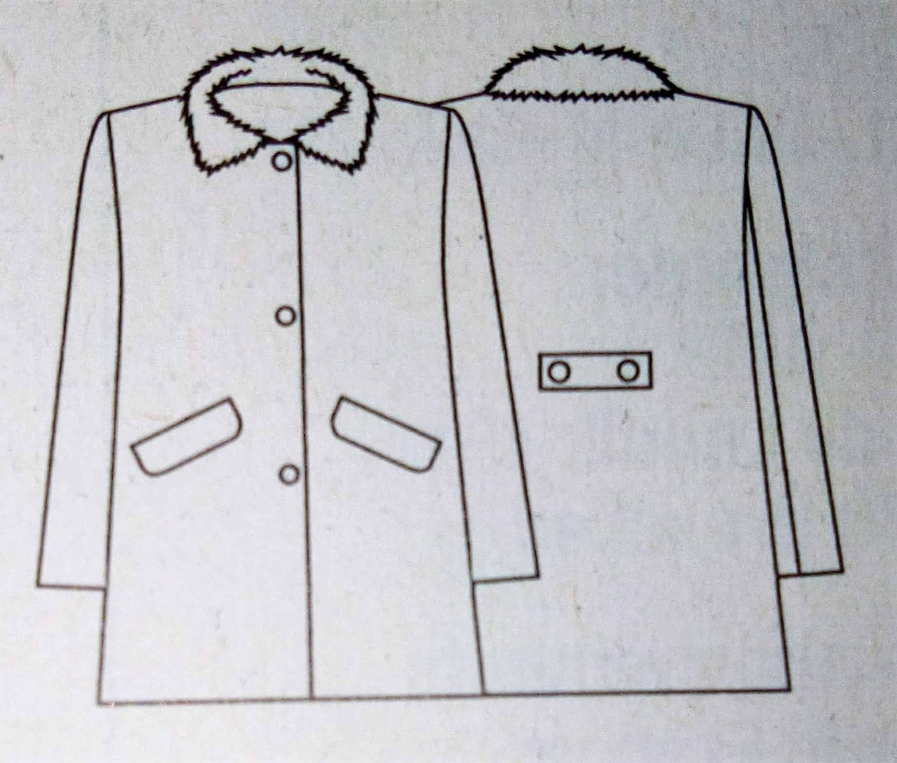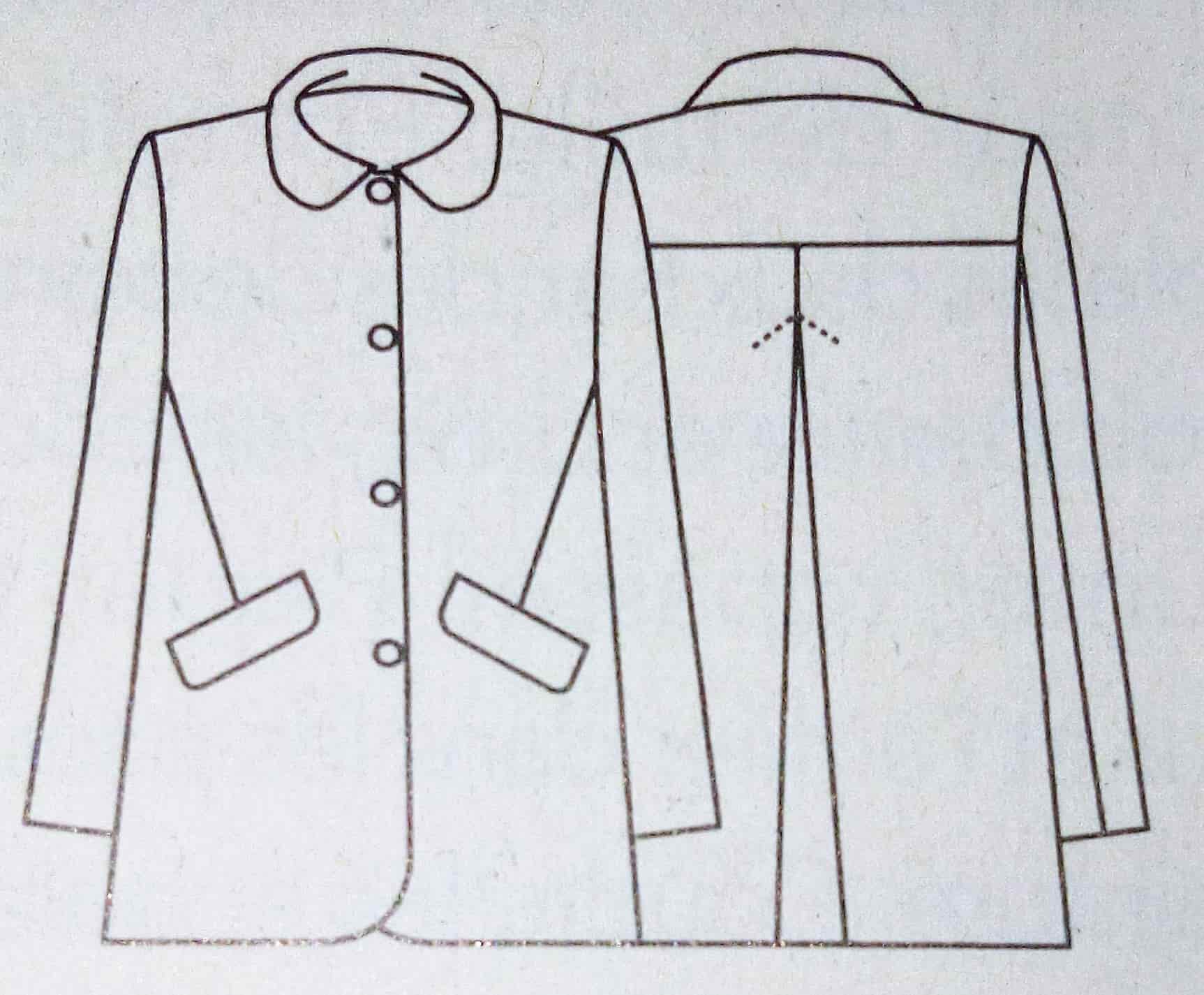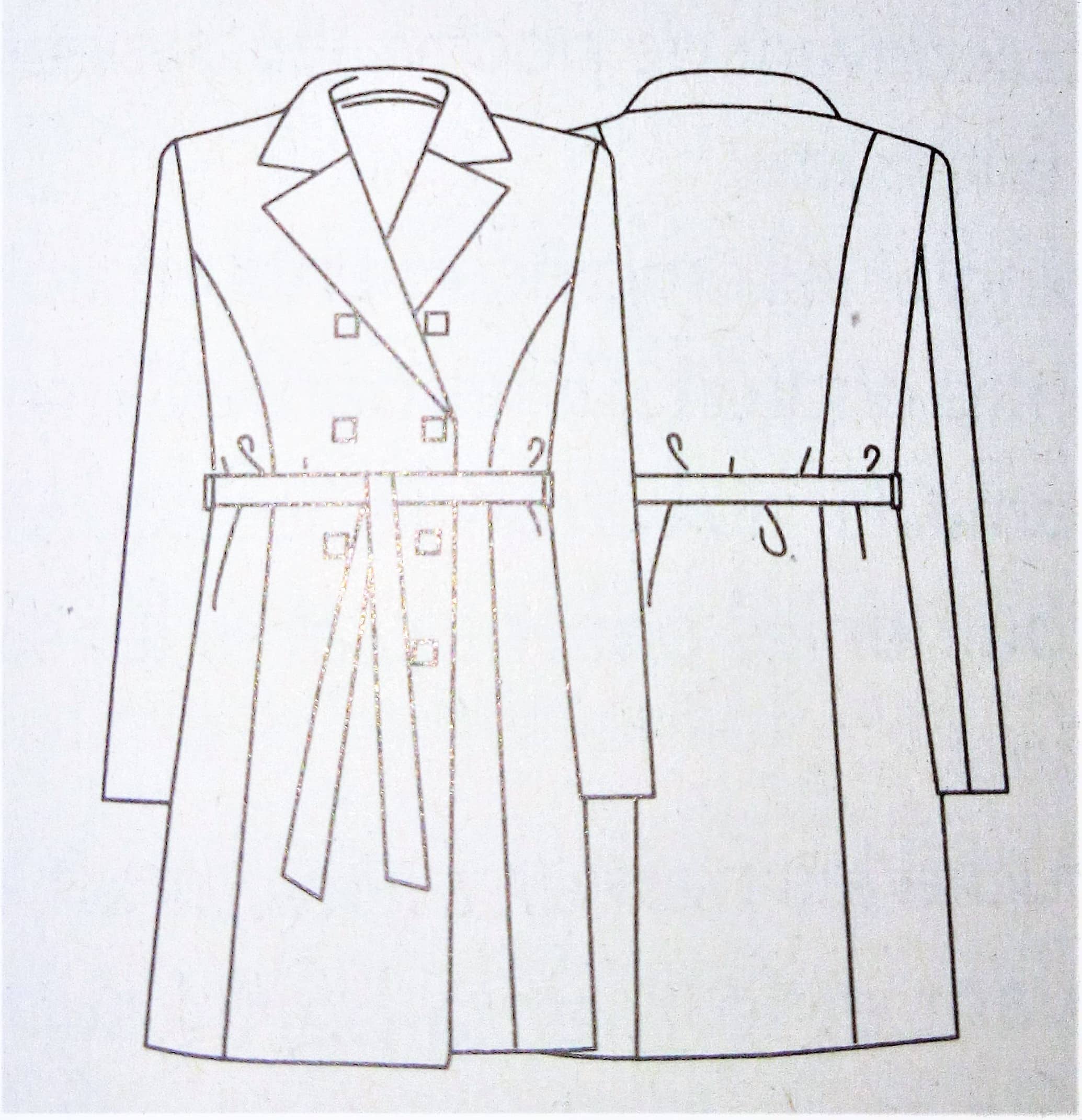 Ce manteau croisé sur le devant est superbe lui aussi. Il possède sur le haut des découpes princesse et des pinces de poitrine. Le bas de est orné de plis creux pour plus d’aisance. Le boutonnage est caché dans la doublure et complété par une ceinture à nouer.