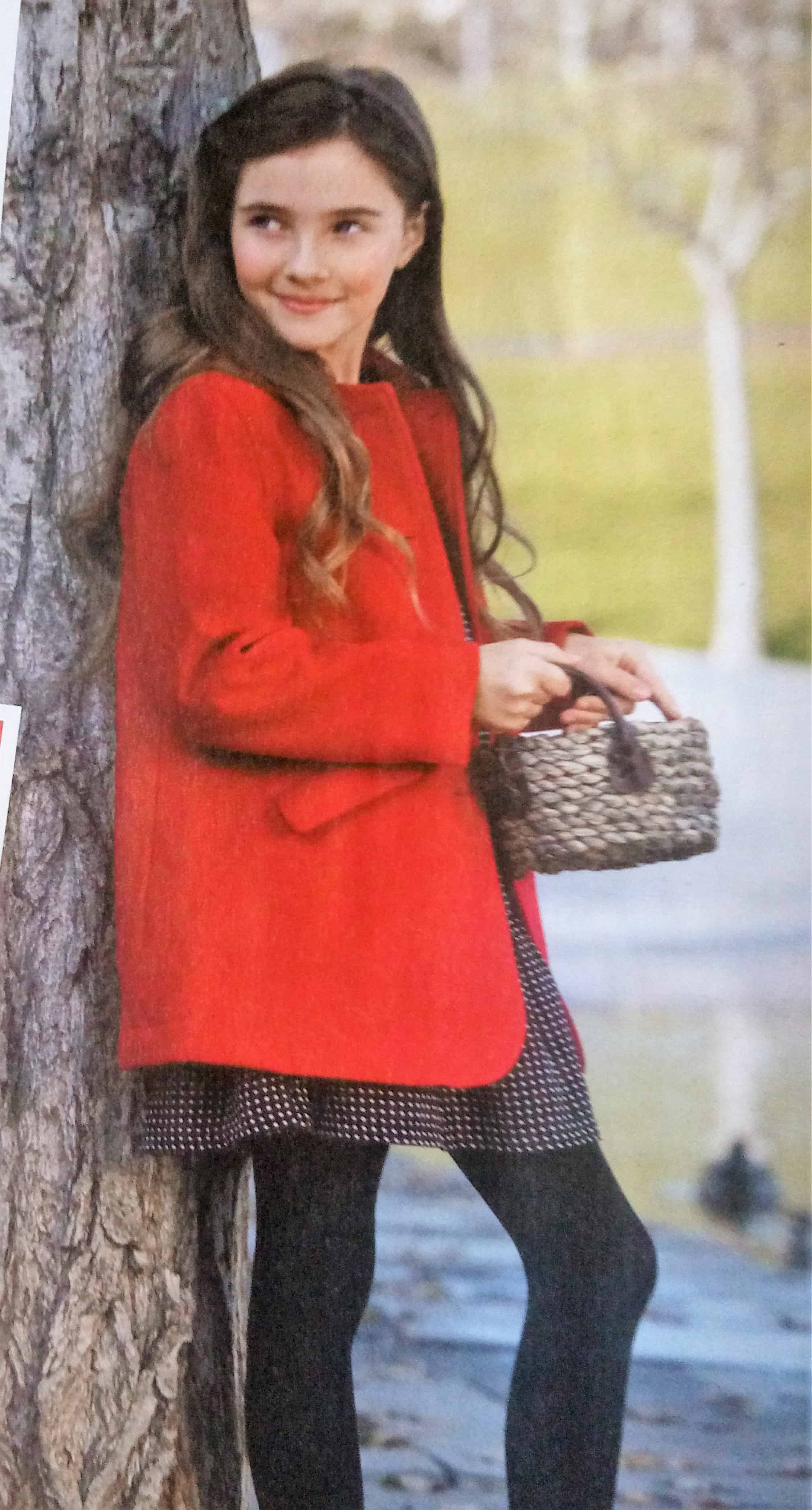 Dernier coup de coeur, il s’agit de ce manteau rouge pour petite fille. Lui aussi est de forme assez simple avec seulement une pince qui se termine dans les poches.