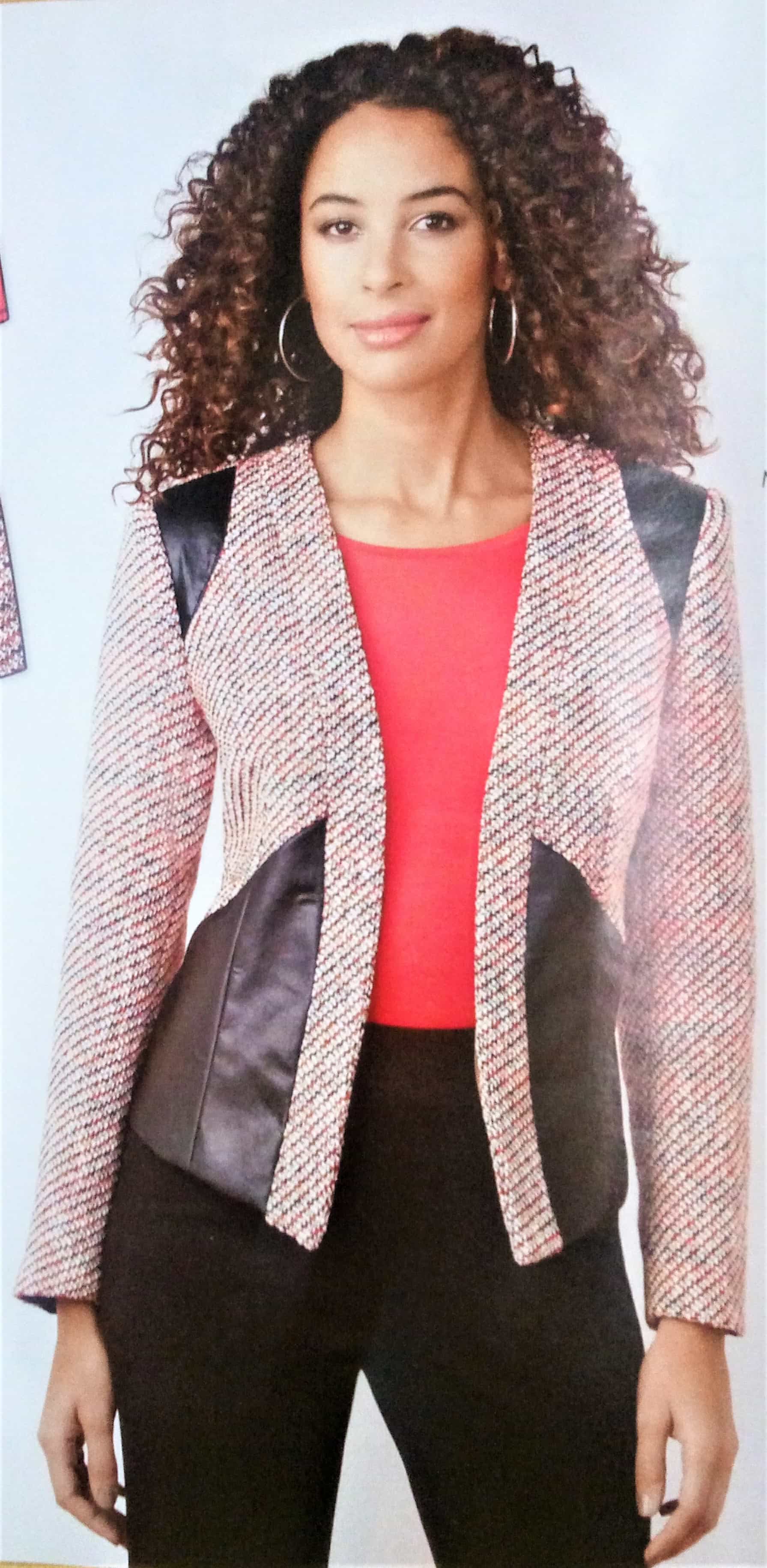 Pour compléter la jupe et avoir un superbe tailleur, voici la veste toujours avec des empiècements en simili. Ce jeu de découpes met en valeur la silhouette.