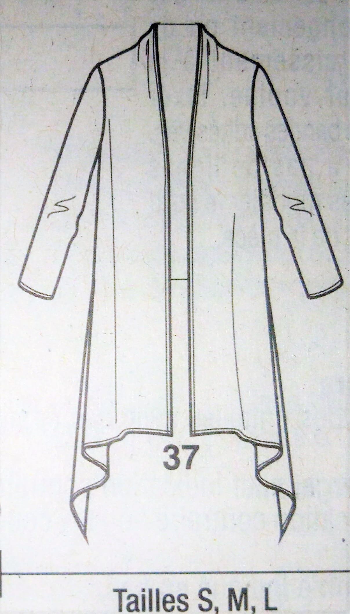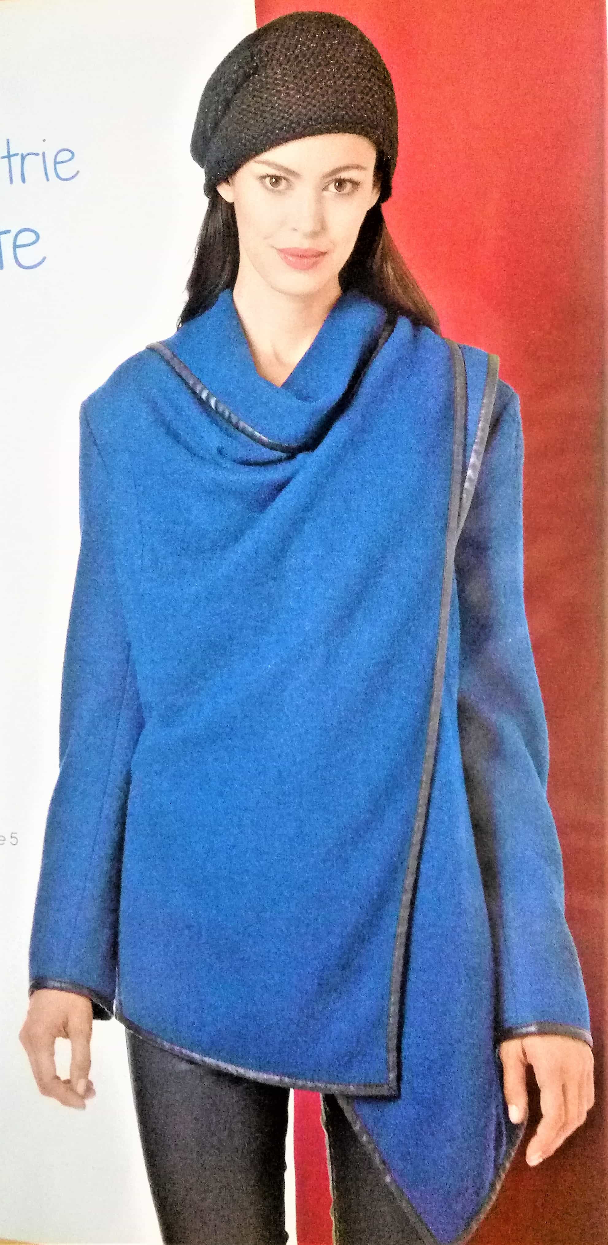 Je suis amoureuse de cette veste, plus précisément de la version longue portée croisée . Le biais en simili rajoute du caractère à l’ensemble. Elle peut être réalisée dans deux tissus différents.
