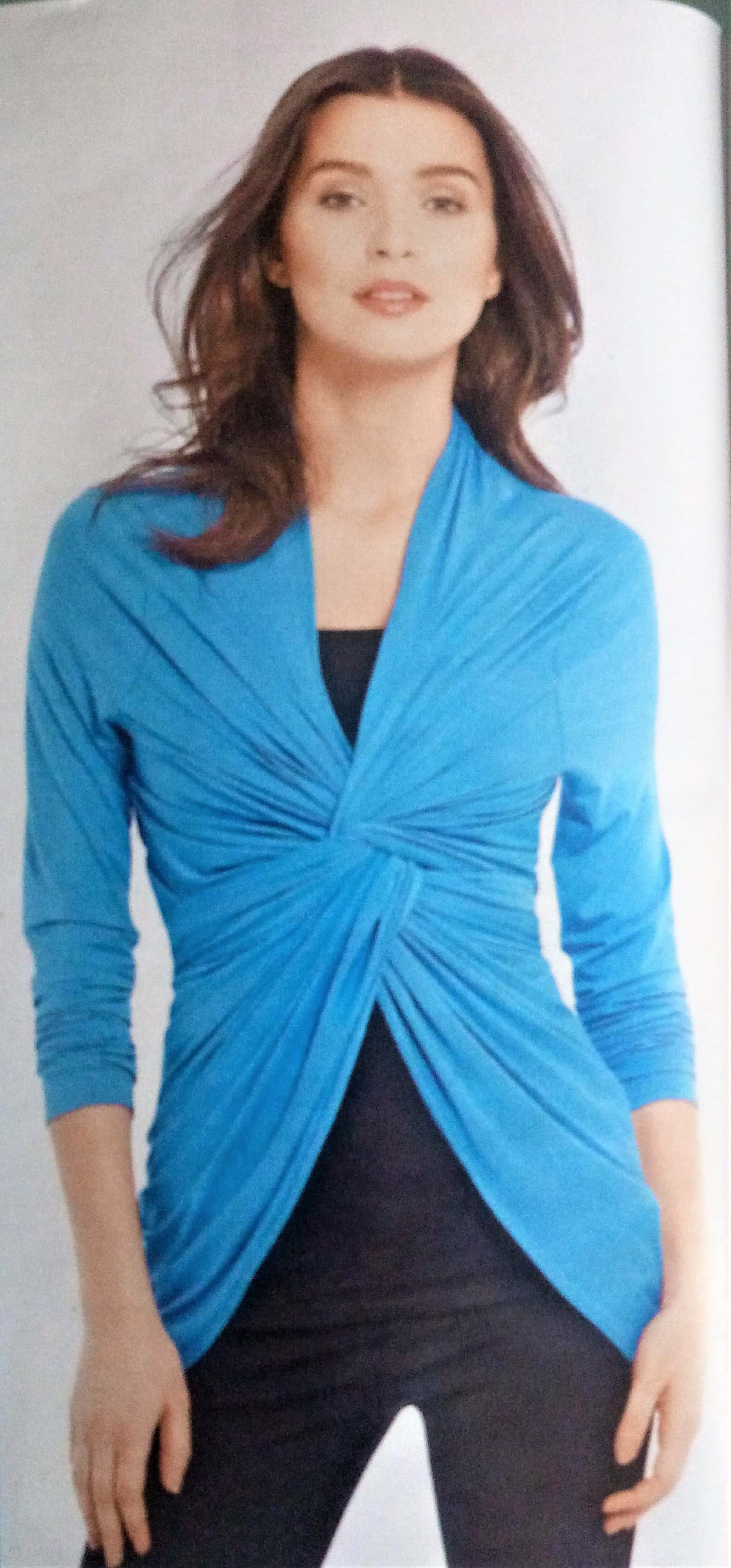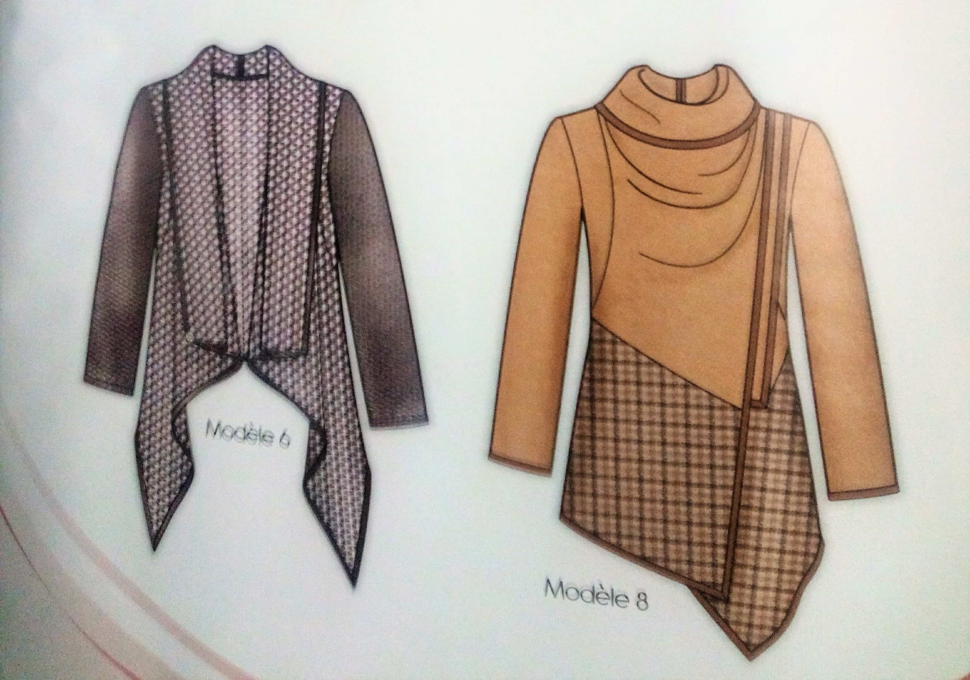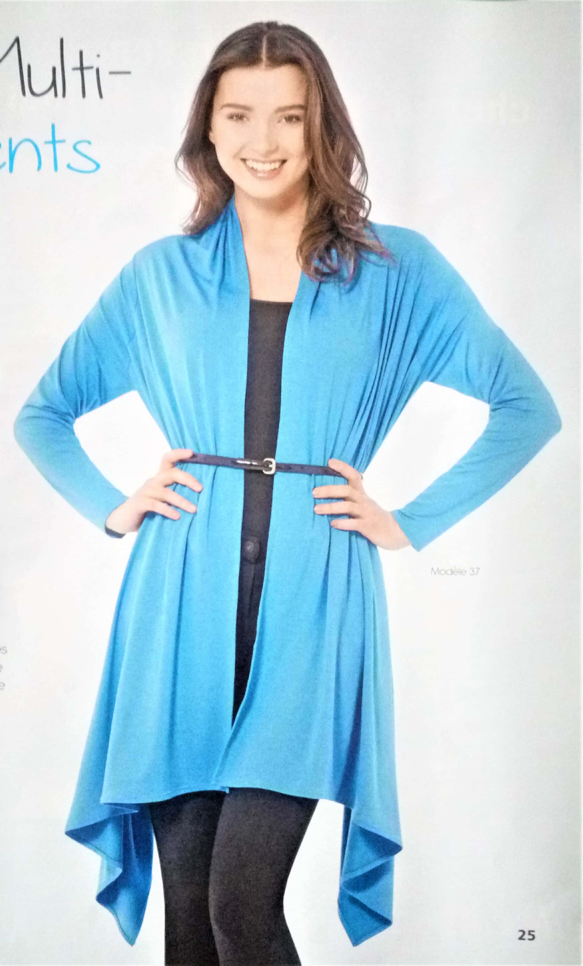 Souvent, il nous est proposé des vêtements évolutifs comme celui de la couverture. ici il s’agit d’un gilet à nouer, torsader ou draper. Personnellement j’adore ce genre de pièces dans la garde robe.