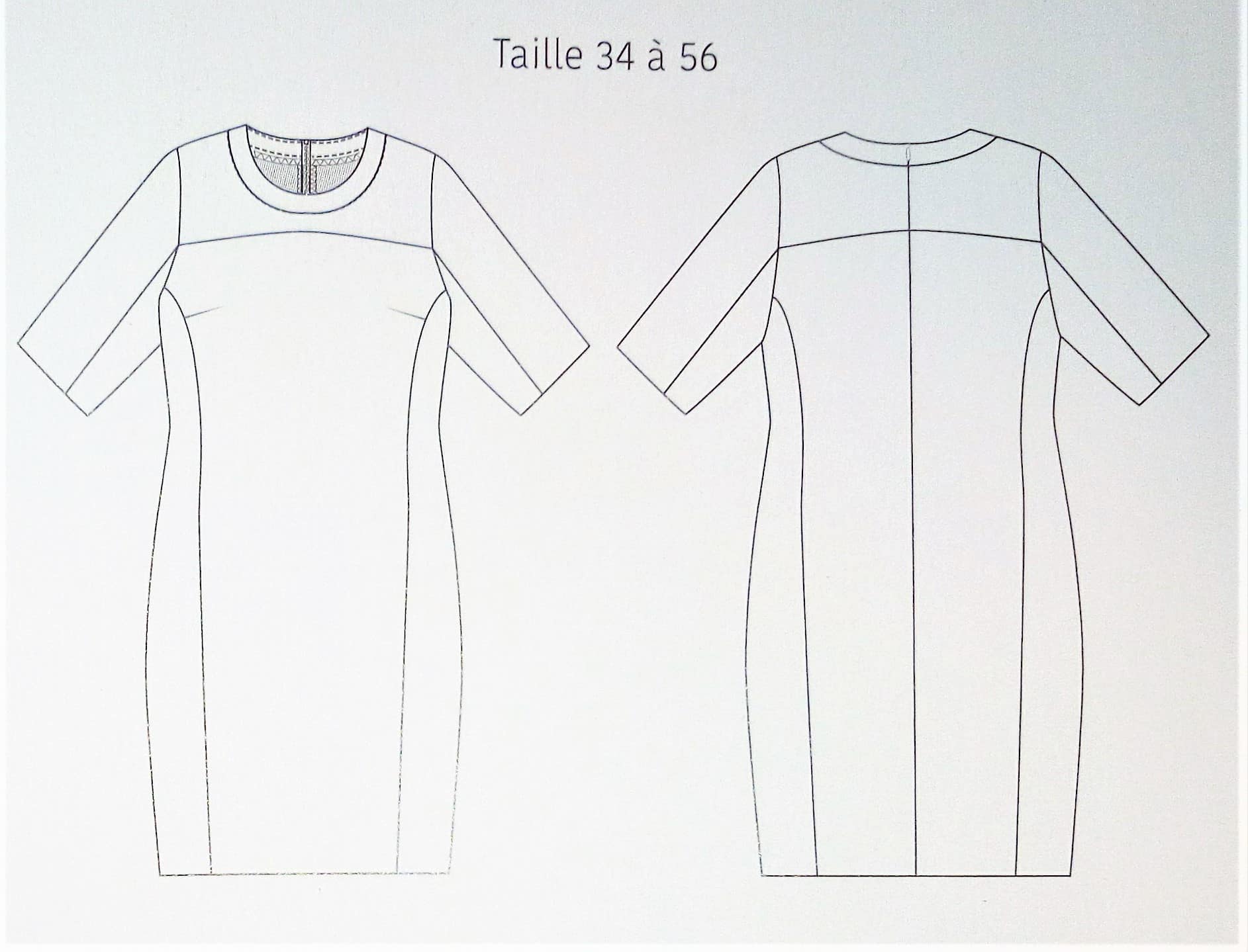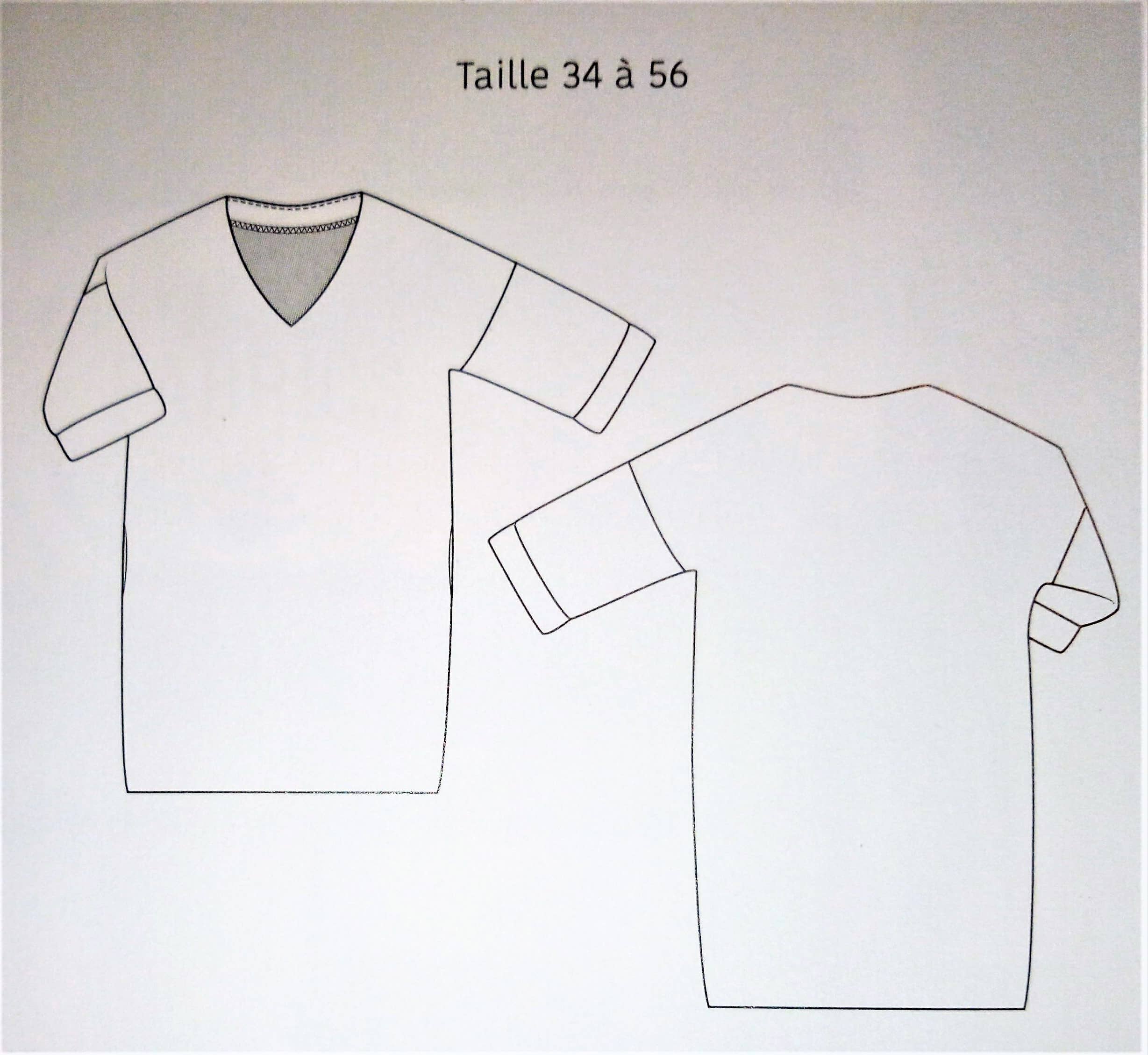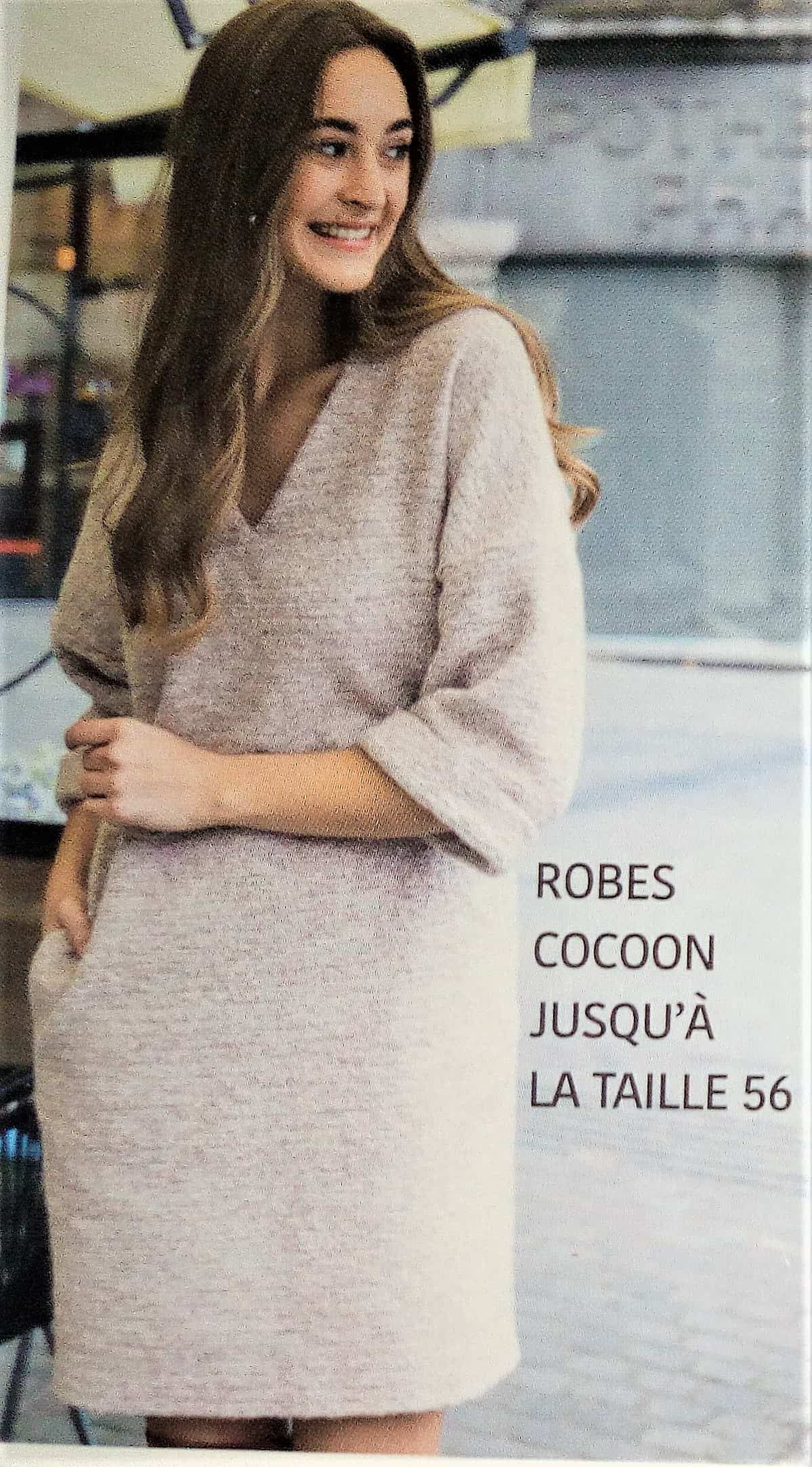 Voici une première robe qui va du 34 au 56. Elle est toute simple un peu large, avec un col en v. Les poches sont cachés dans la couture de côté. Un revers vient terminer les manches.