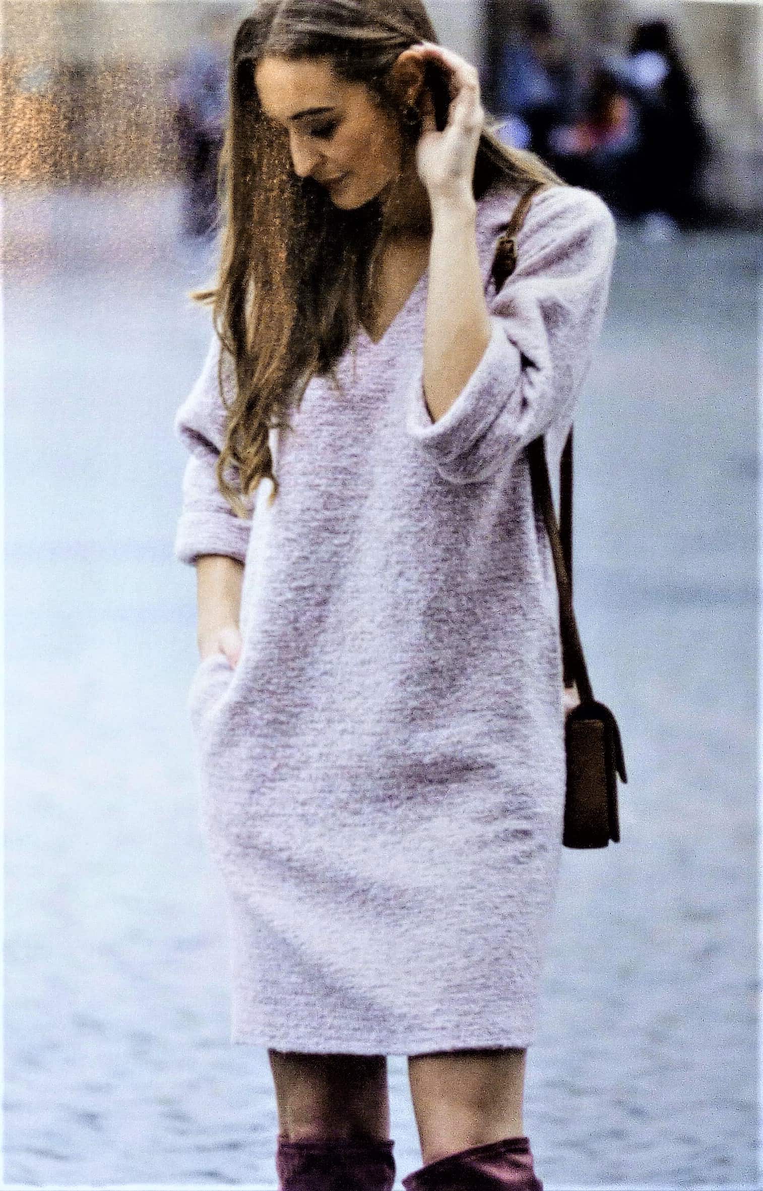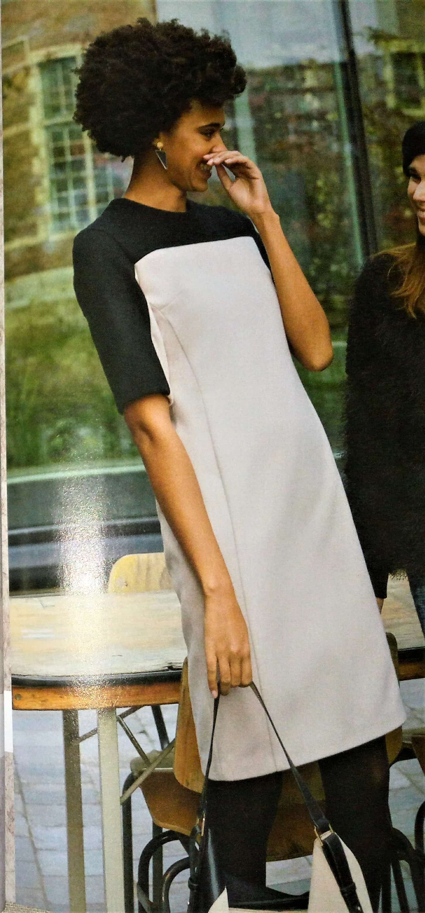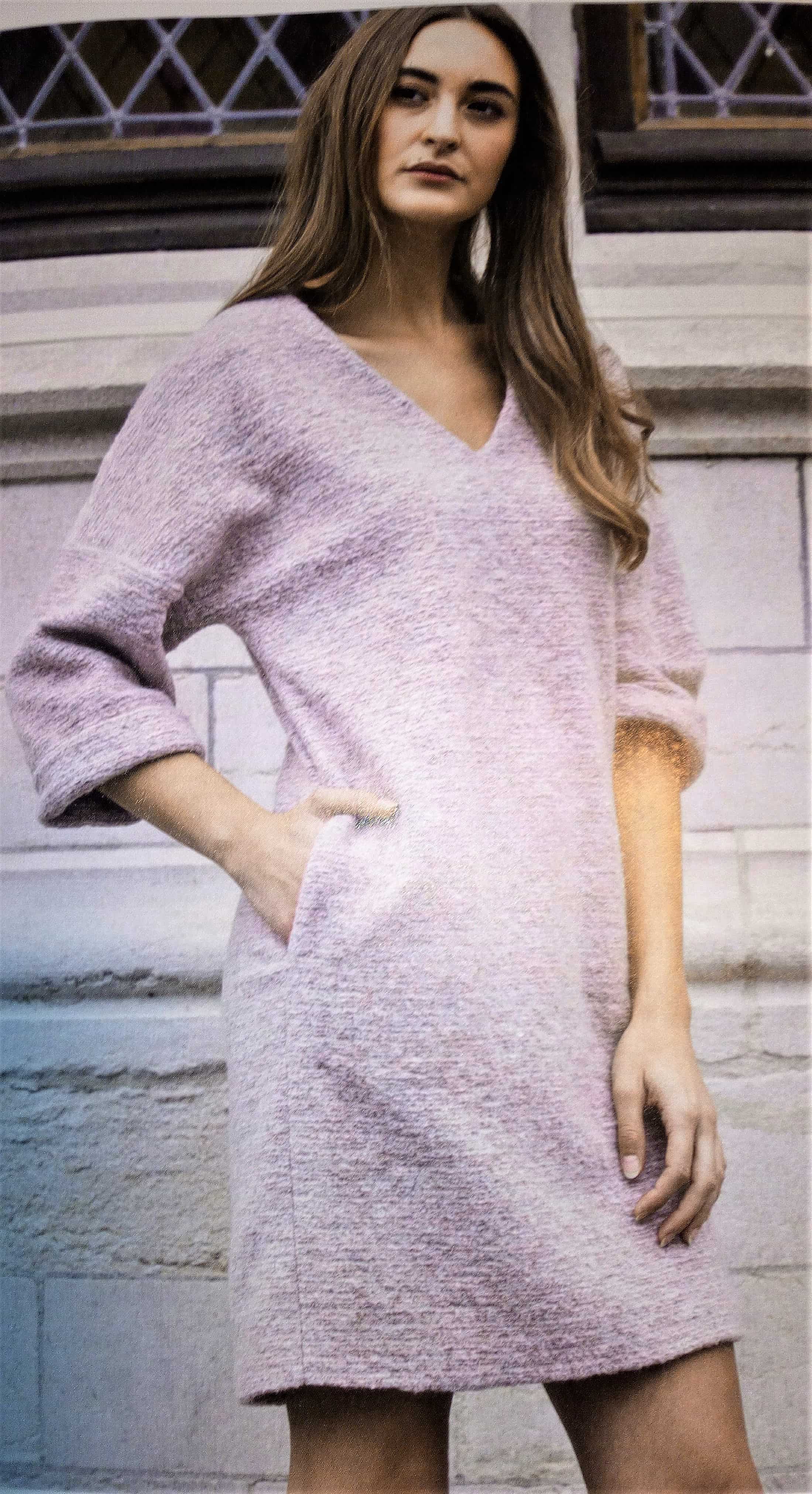 Voici une première robe qui va du 34 au 56. Elle est toute simple un peu large, avec un col en v. Les poches sont cachés dans la couture de côté. Un revers vient terminer les manches.