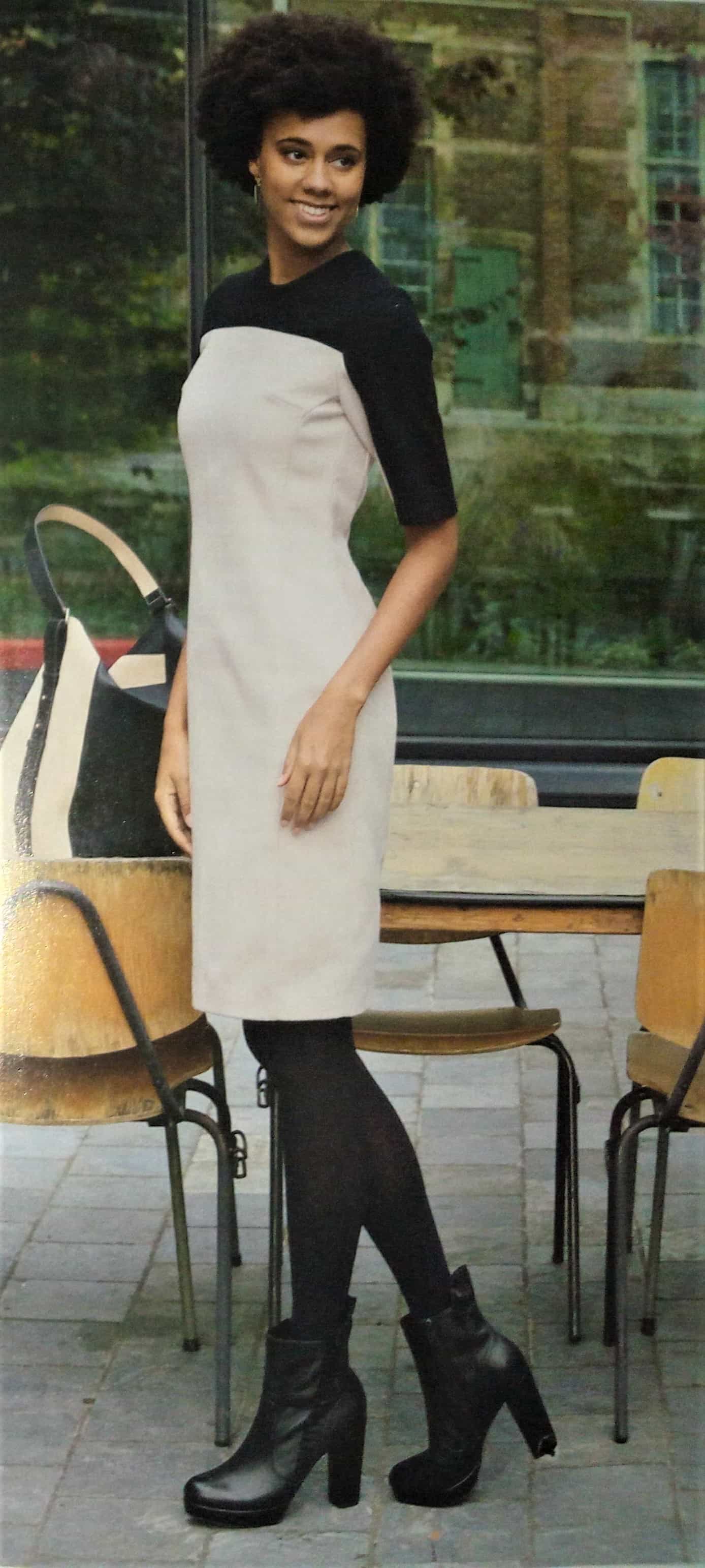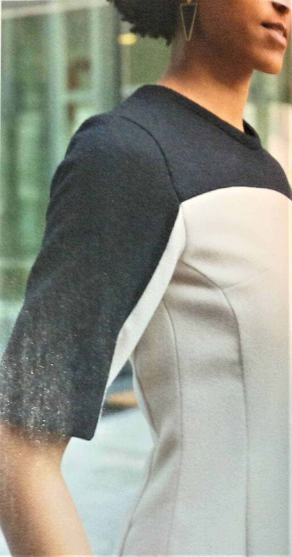 Cette robe est superbe, elle va du 34 au 56, est est réalisée en deux couleurs. Elle possède des découpes princesses avec une petite pince. La coupe est idéale pour affiner la silhouette.