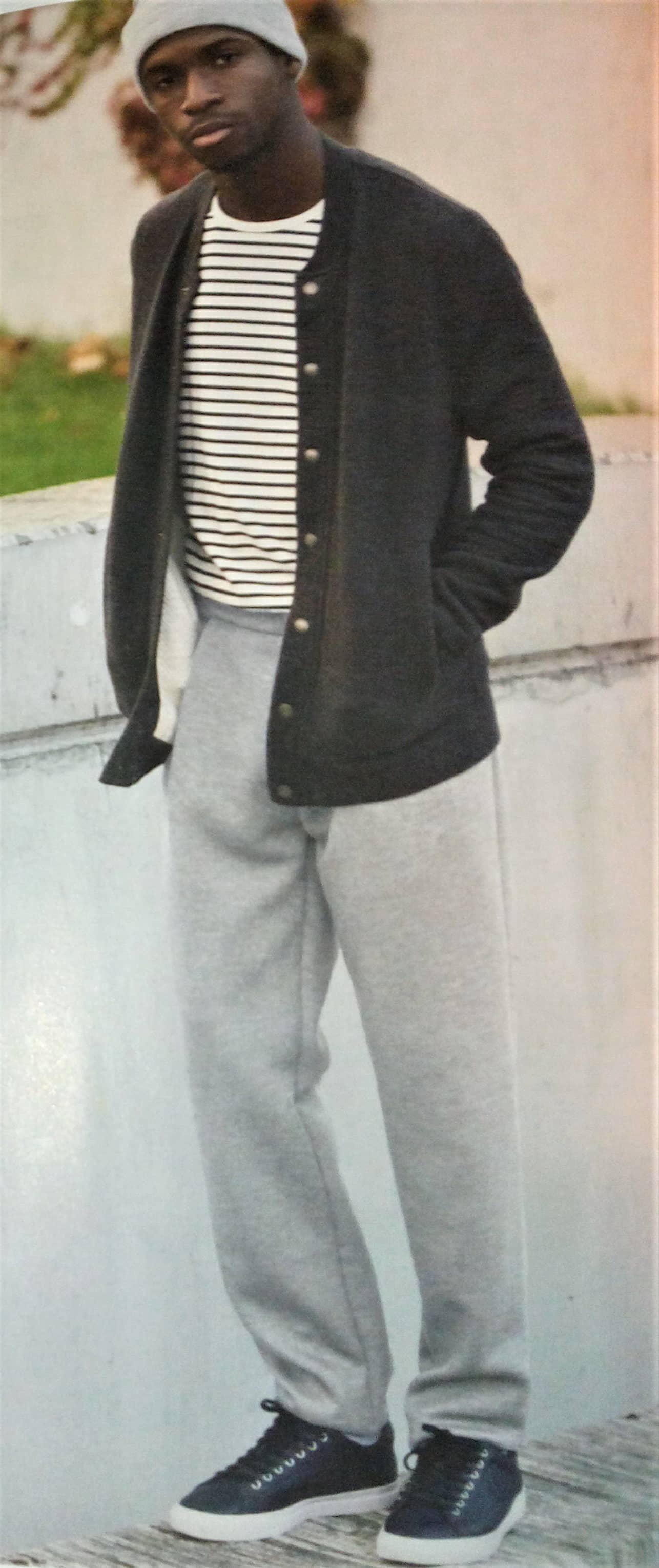 Voici, un pantalon de jogging pour homme avec une coupe un peu originale. Il y a deux plis sur le devant. L’originalité est poté sur le dos avec son empiècement et sa poche prise dans la couture.