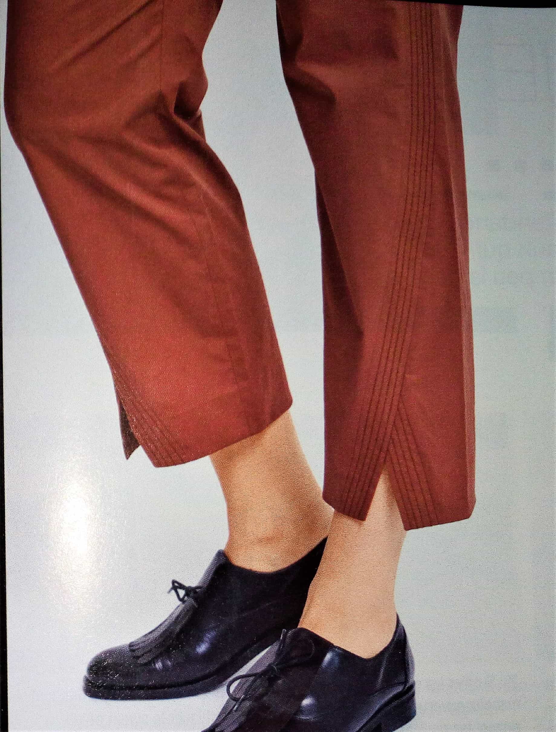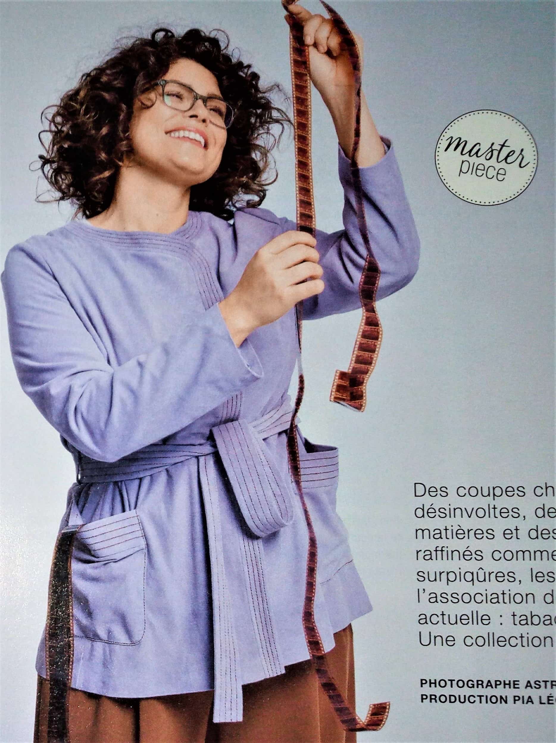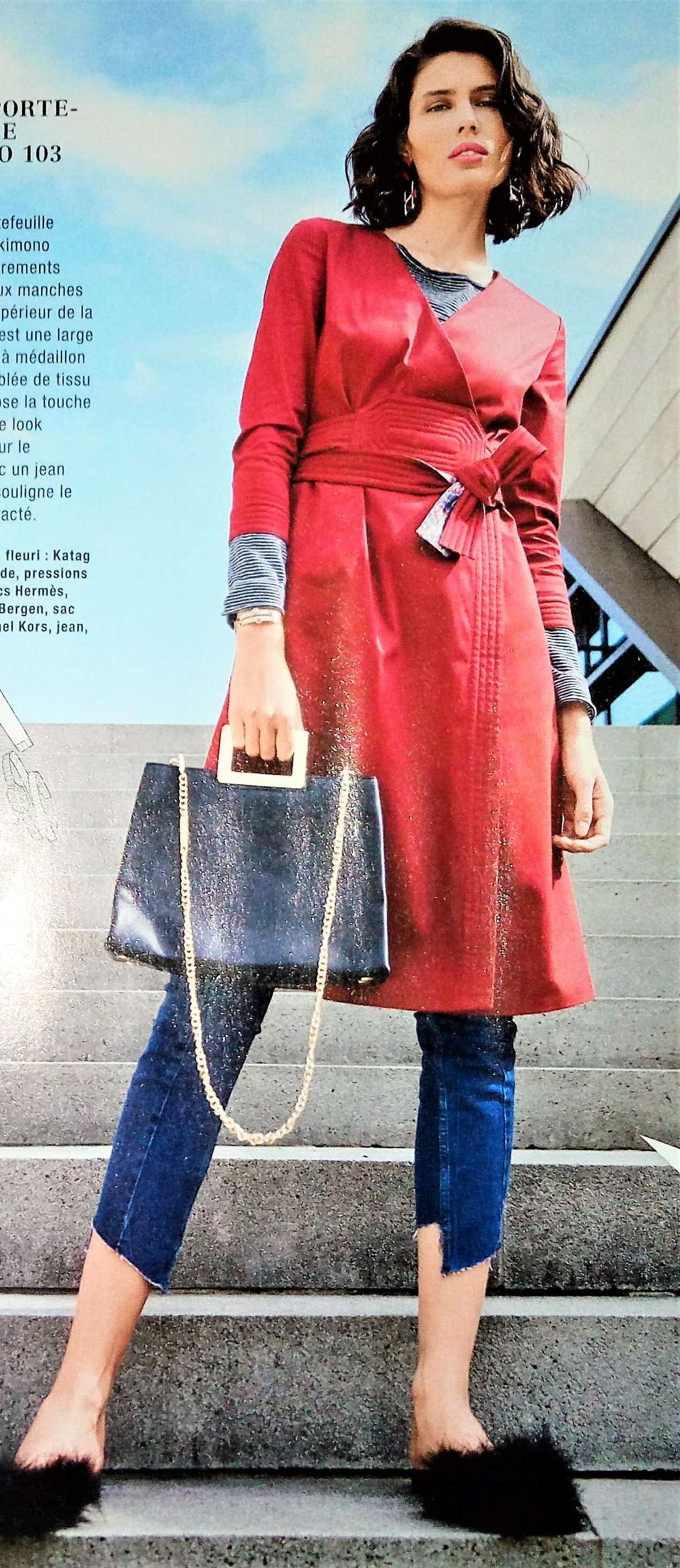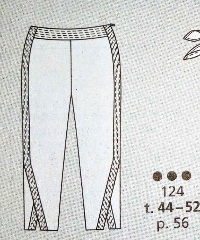 J’aime beaucoup ce pantalon 7/8 ème. Il agrandi la silhouette grâce aux parements surpiqués de côté. Vers l’ourlet les parements créent une petite fente. Je le trouve original. Il va de la taille 44 au 52.