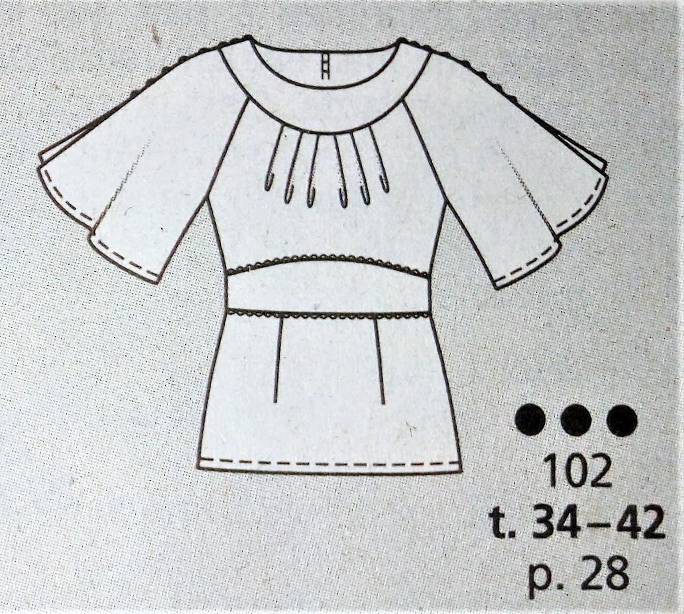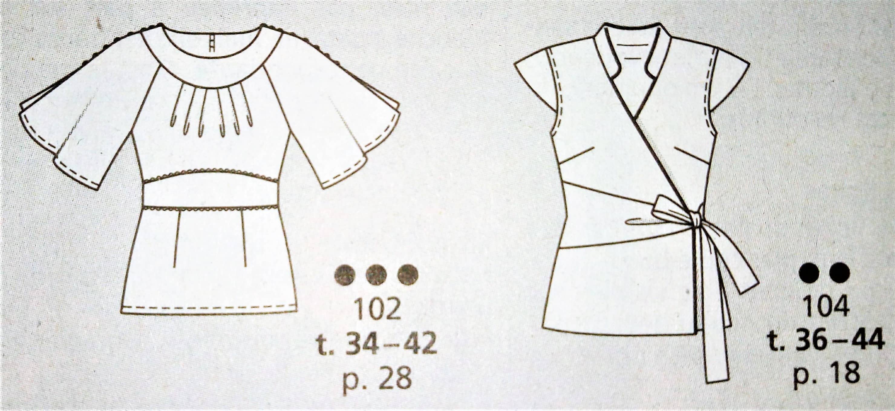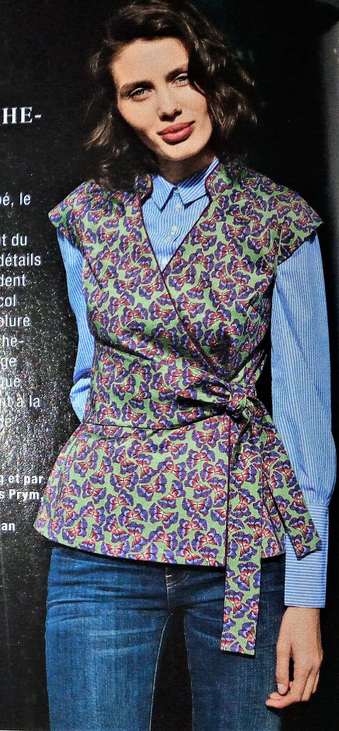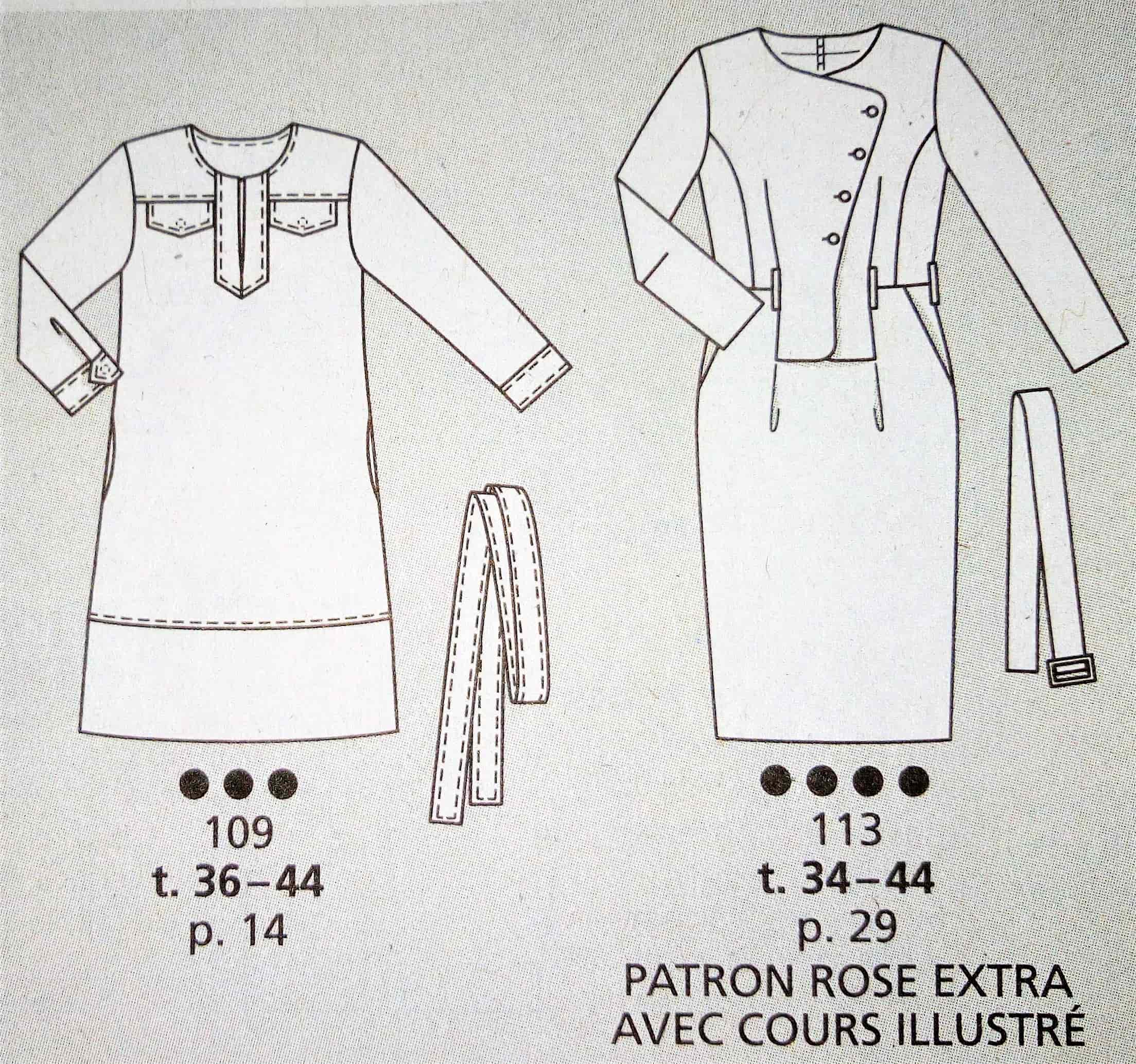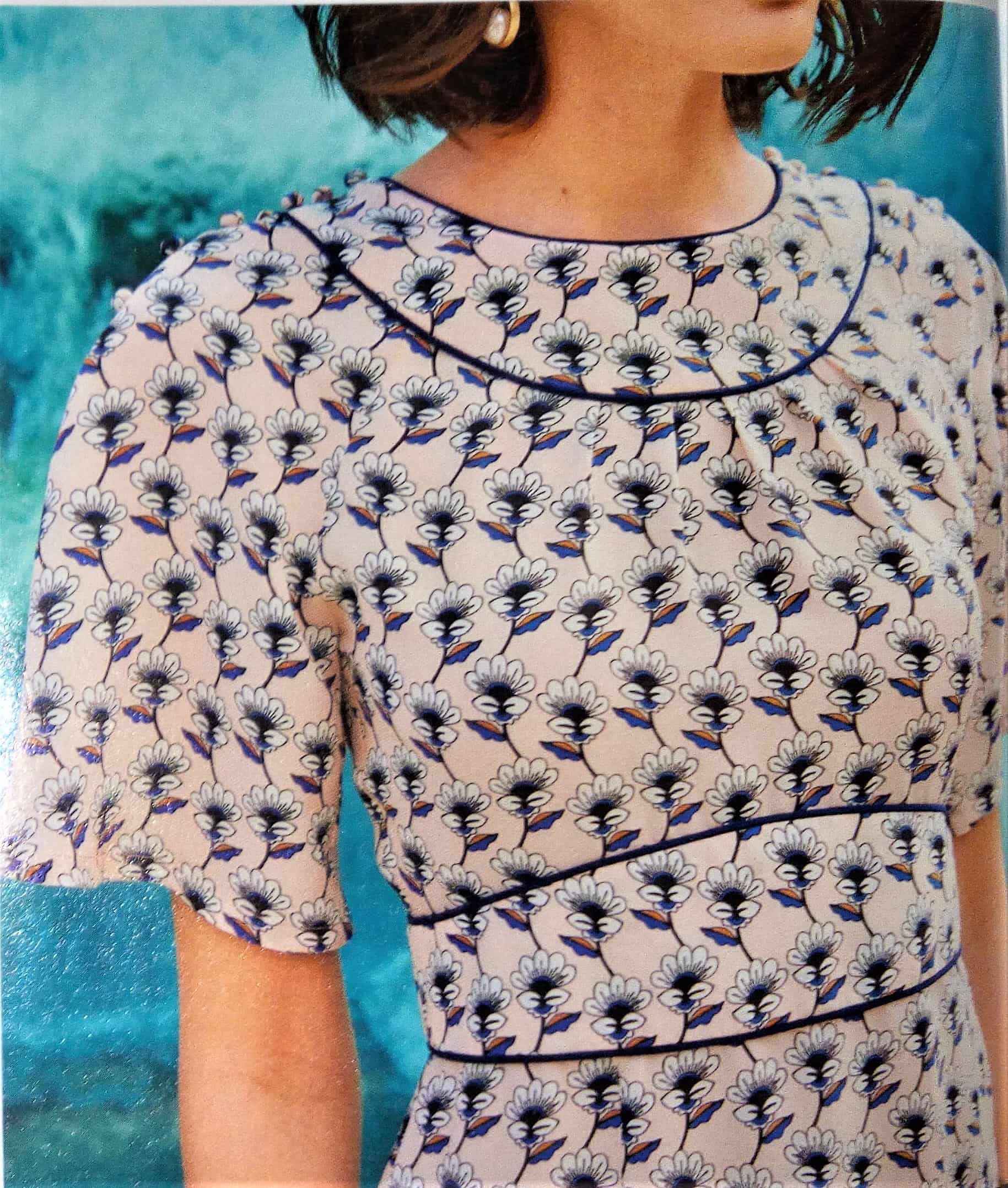 J’adore cette robe et la version top. Elle est d’inspiration vintage je dirai années 40. L’encolure est à parement bordée d’ un passepoil sur les petits plis du corsage. Les manches sont dites papillons, la ceinture est incrustée et soulignée elle aussi par un passepoil. Le bas de la robe est à godets pour accentuer encore plus l’effet aérien de la robe. Elle va du 34 au 42.