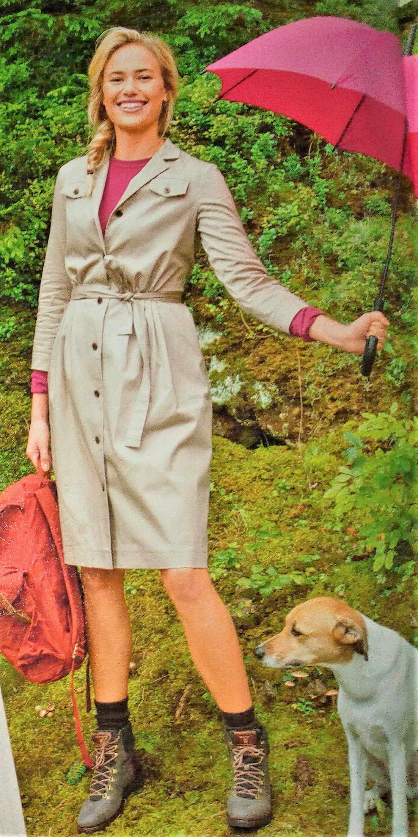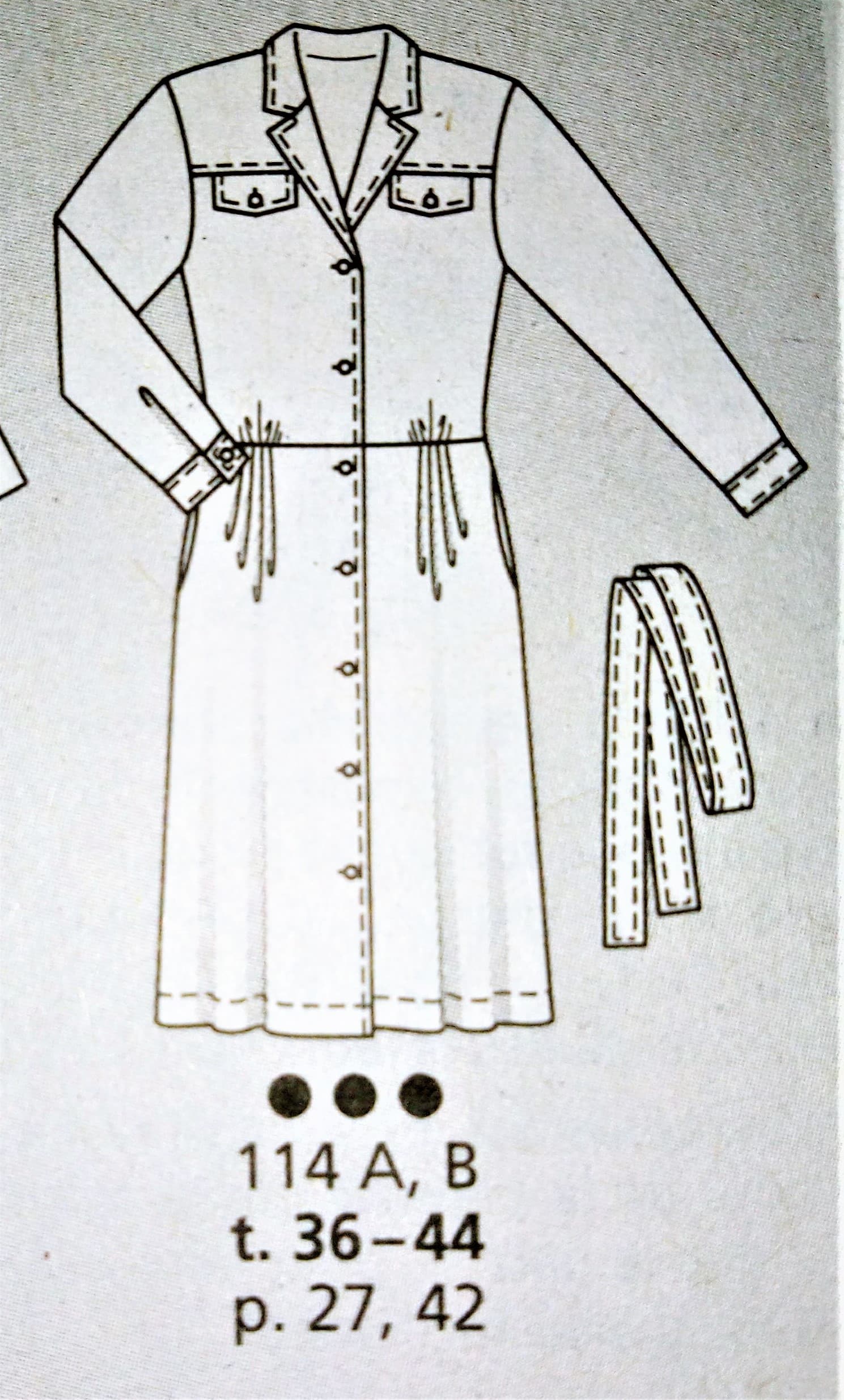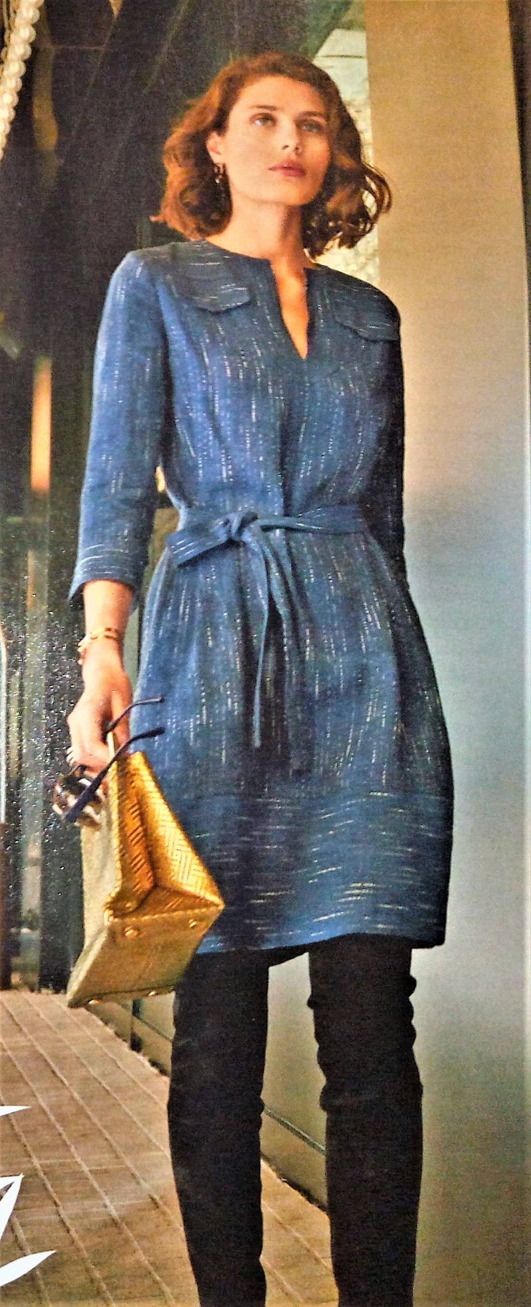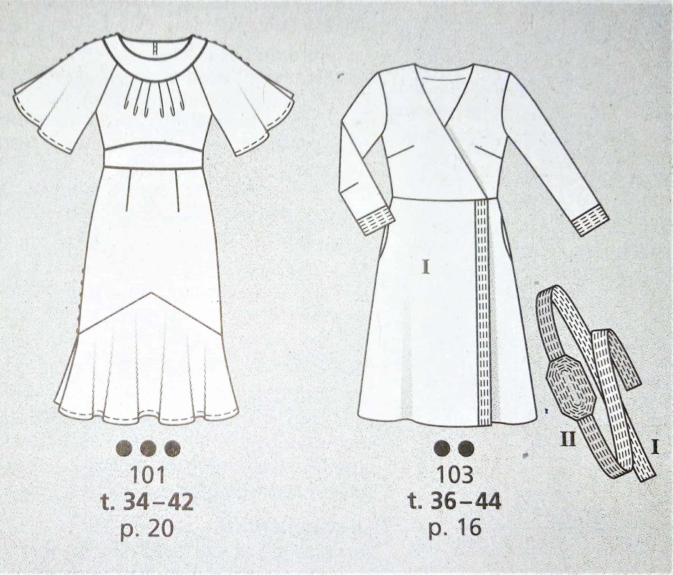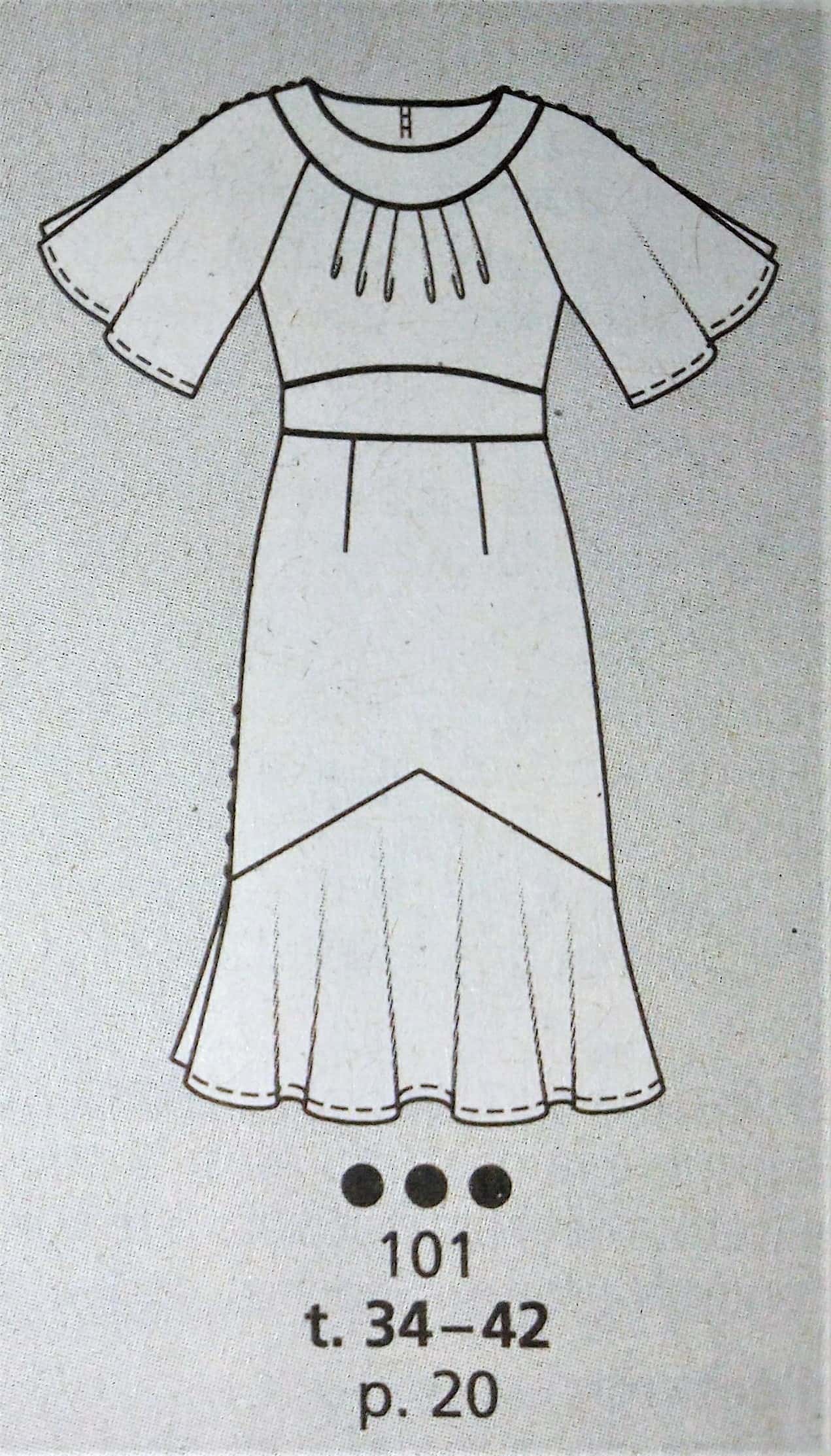 J’adore cette robe et la version top. Elle est d’inspiration vintage je dirai années 40. L’encolure est à parement bordée d’ un passepoil sur les petits plis du corsage. Les manches sont dites papillons, la ceinture est incrustée et soulignée elle aussi par un passepoil. Le bas de la robe est à godets pour accentuer encore plus l’effet aérien de la robe. Elle va du 34 au 42.
