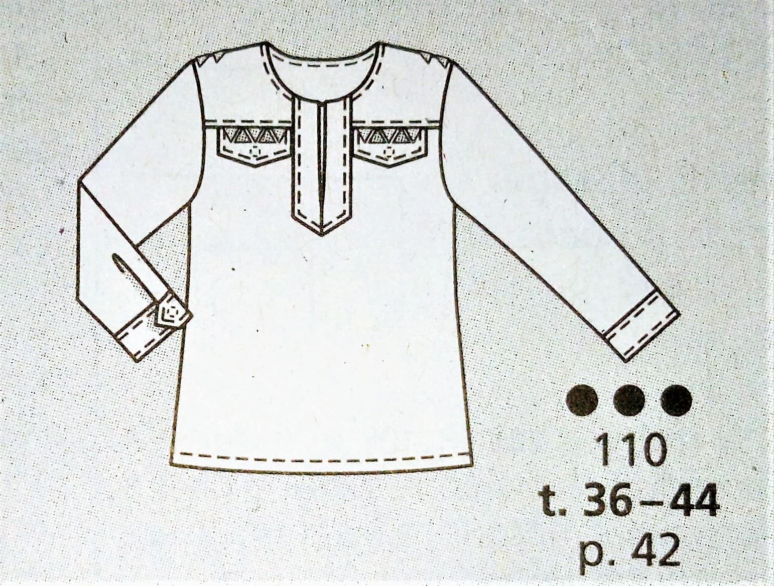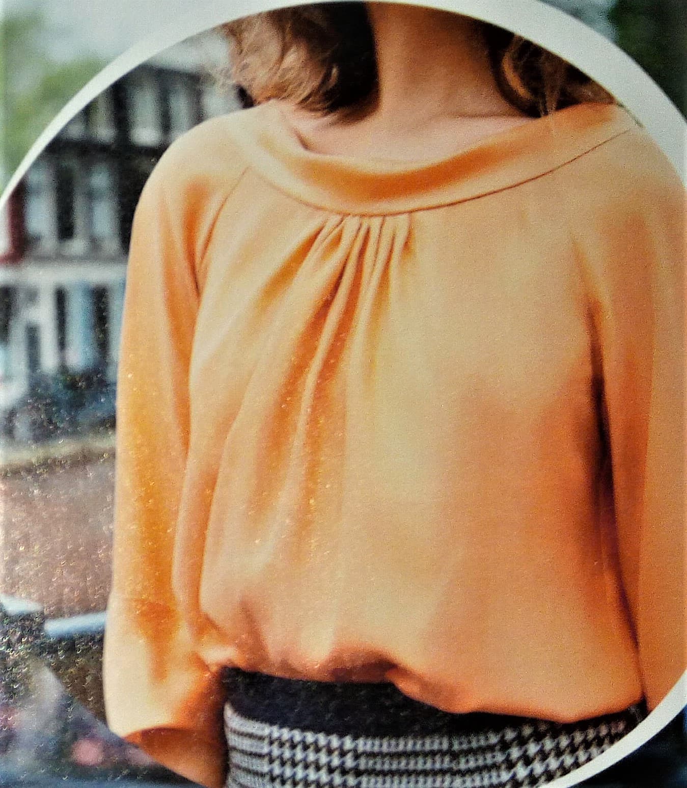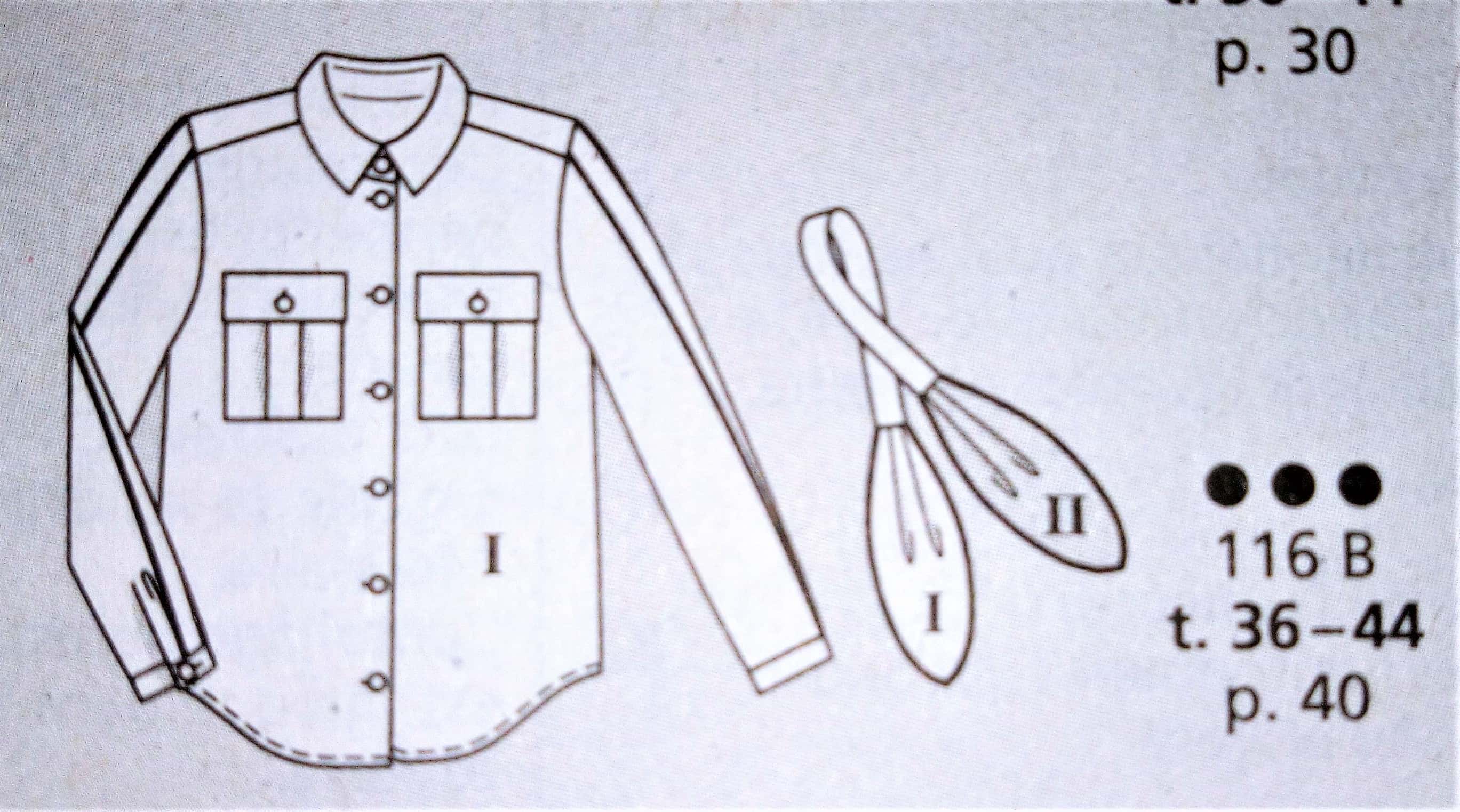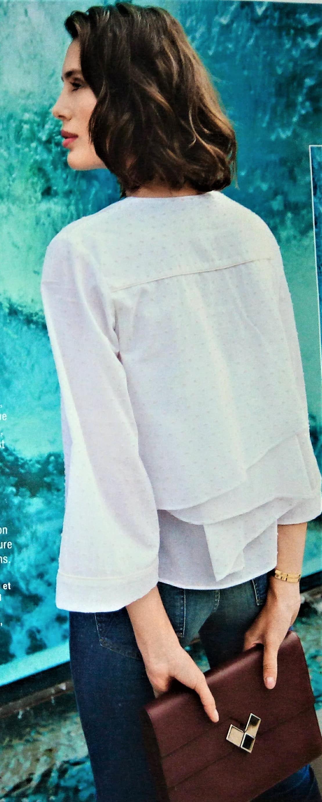 Que dire de cette blouse qui est juste somptueuse! L’encolure est à parement sur des plis du devant du corsage. Elle se termine par deux liens à nouer dans le dos. Les manches sont trois quart à revers. Ce top à lui aussi un coté rétro années 40. Il va du 36 au 44.