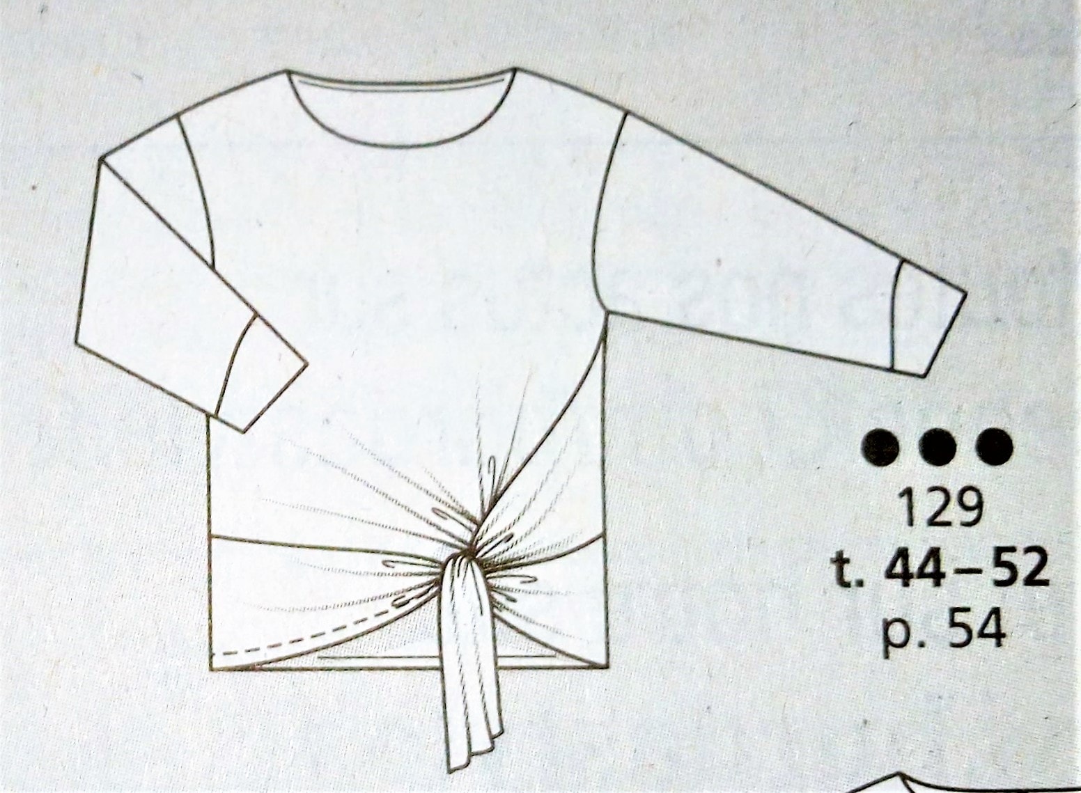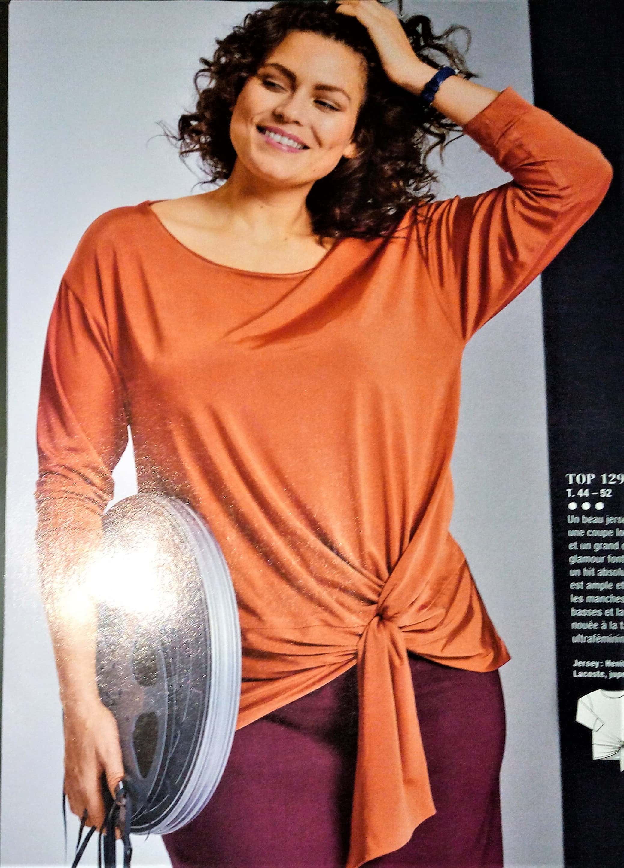 Voici un joli top en grande taille il va du 44 au 52. Il est cousu en jersey brillant, de coupe loose à manches longues. Son charme est dans le drapé accentué par les pans à nouer à la taille.