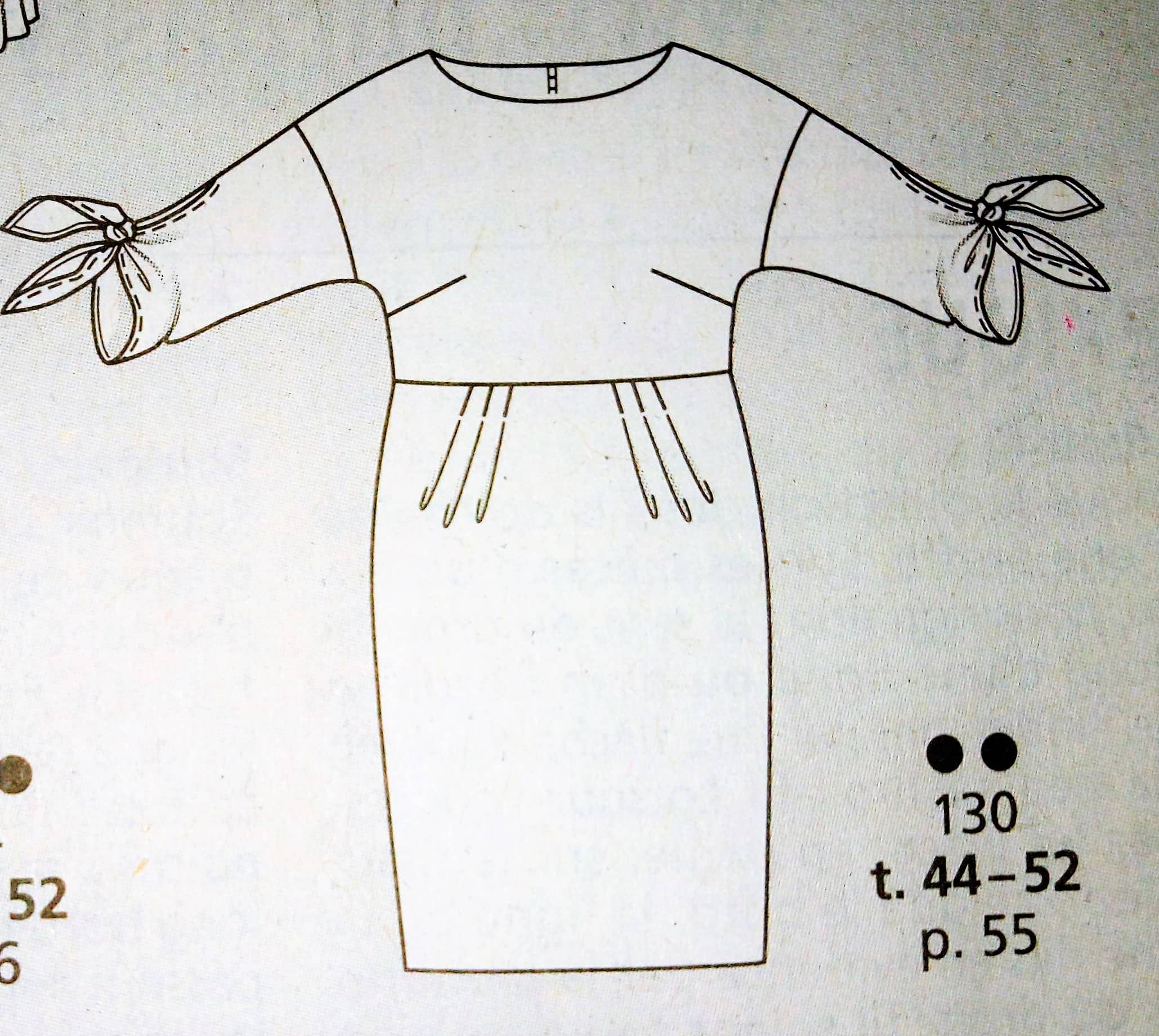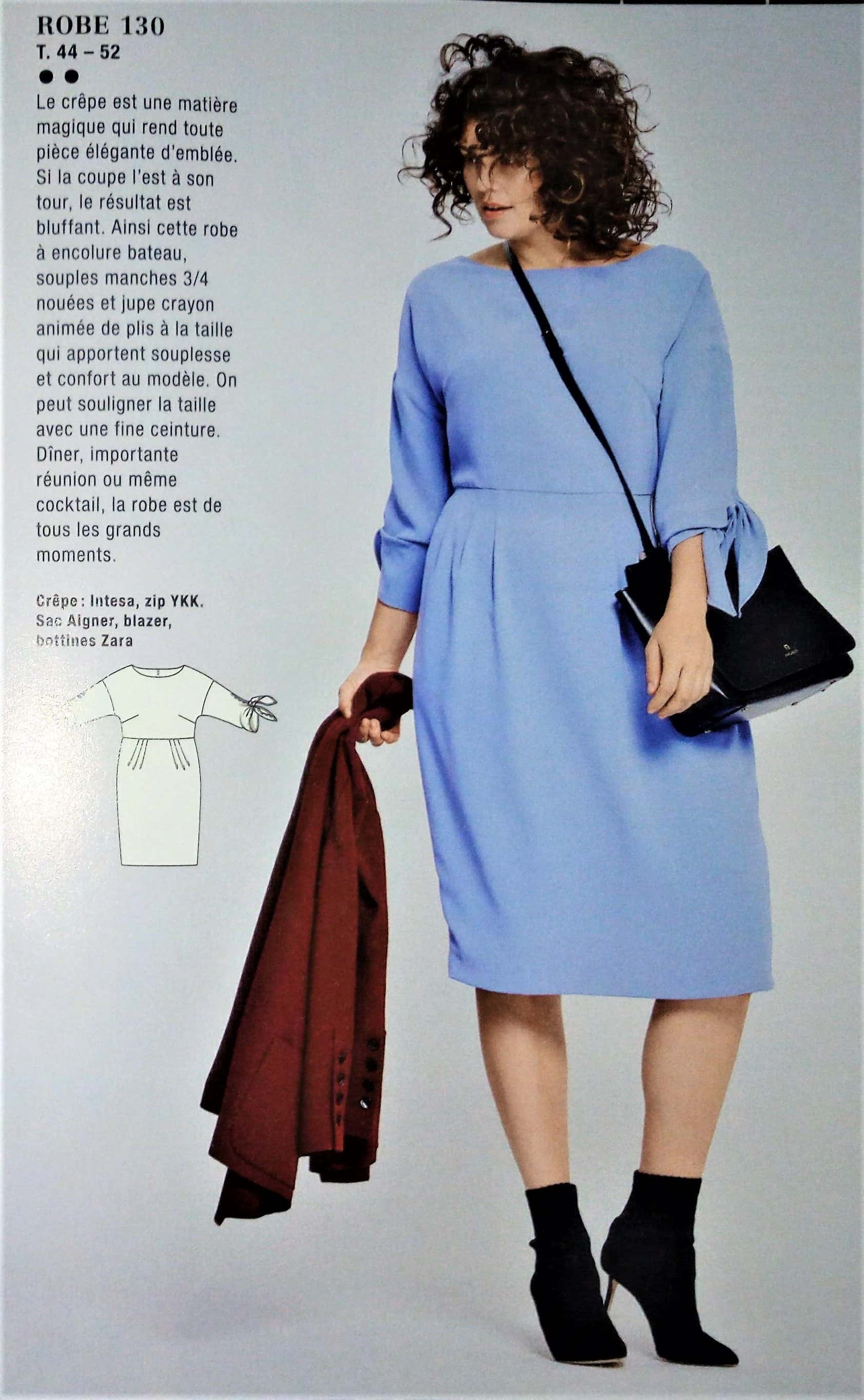 Encore une robe mais elle est ici en grandes tailles , elle va du 44 au 52. Cette robe est a encolure bateau, avec des manches trois quart qui se termine avec un nœud. Le bas de la robe est formé par une jupe crayon avec des plis à la taille pour le confort.