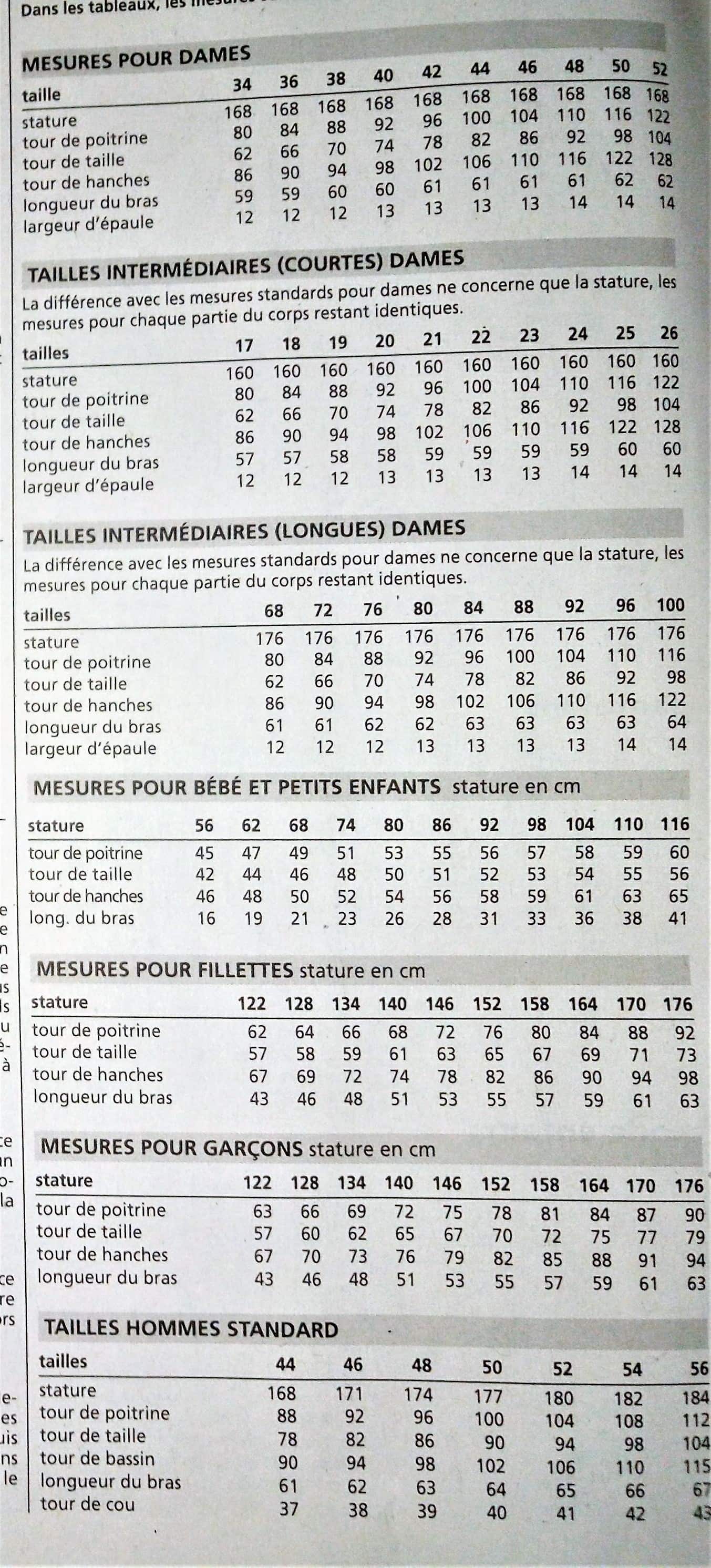 Le tableau des tailles