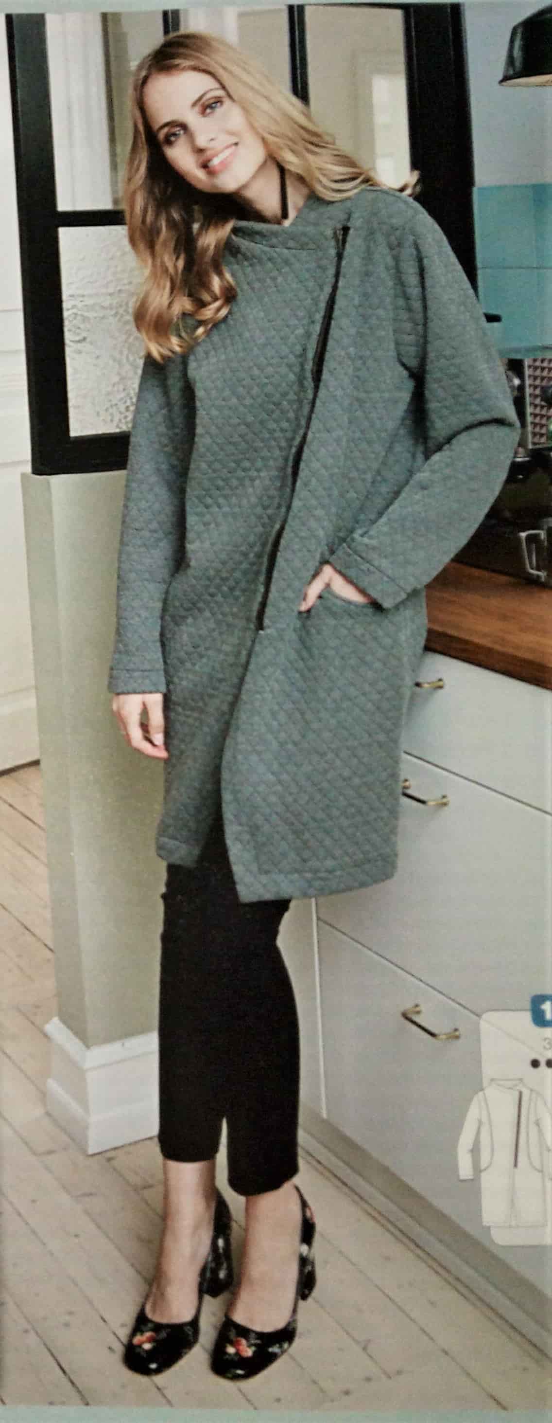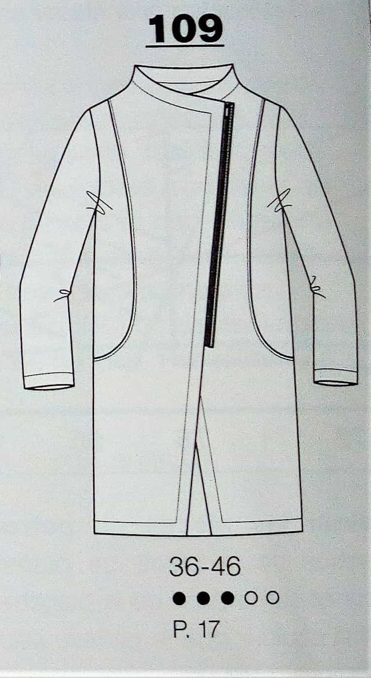 J’aime particulièrement ce manteau asymétrique fermé par une grande fermeture à glissière. Les découpes bretelles se terminent en arrondi par des poches. Il va du 36 au 46.