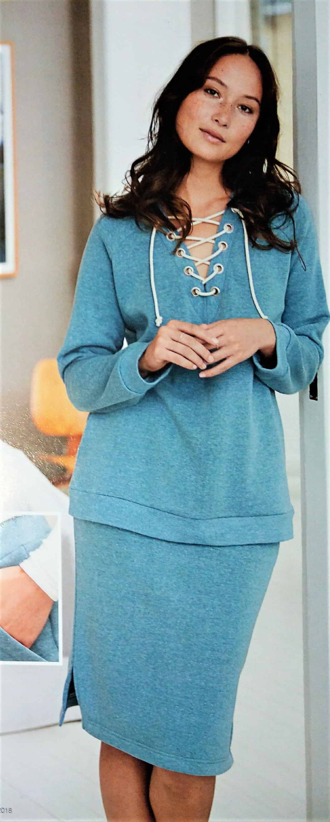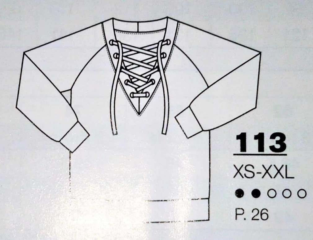 Je suis assez mitigée sur le choix du tissus pour ce sweat, je trouve justement qu’il a un côté trop sport. Je le verrai plutôt dans un autre tissus pour casser ce côté sportwear. Le sweat est à manches longues raglan, avec un grand décolleté en v fermé par des lacets. Il va de la taille XS au XXL..