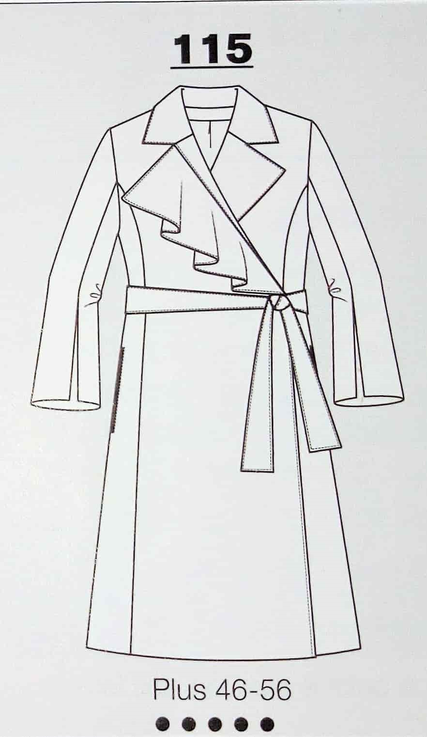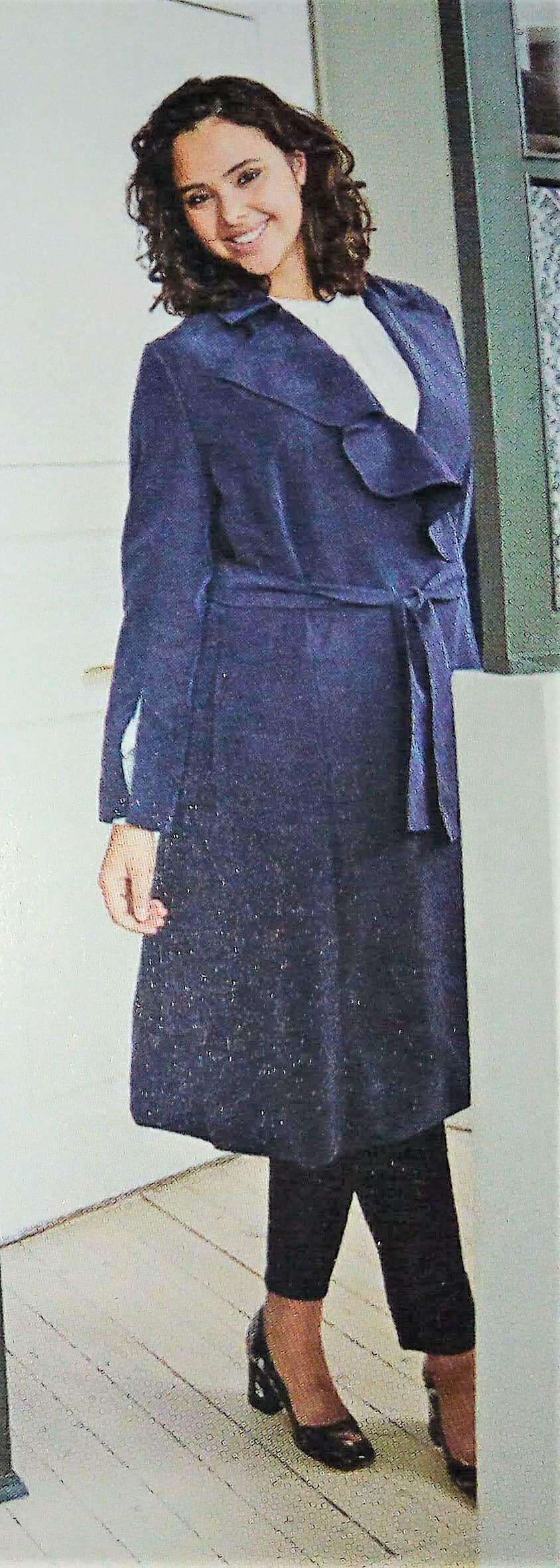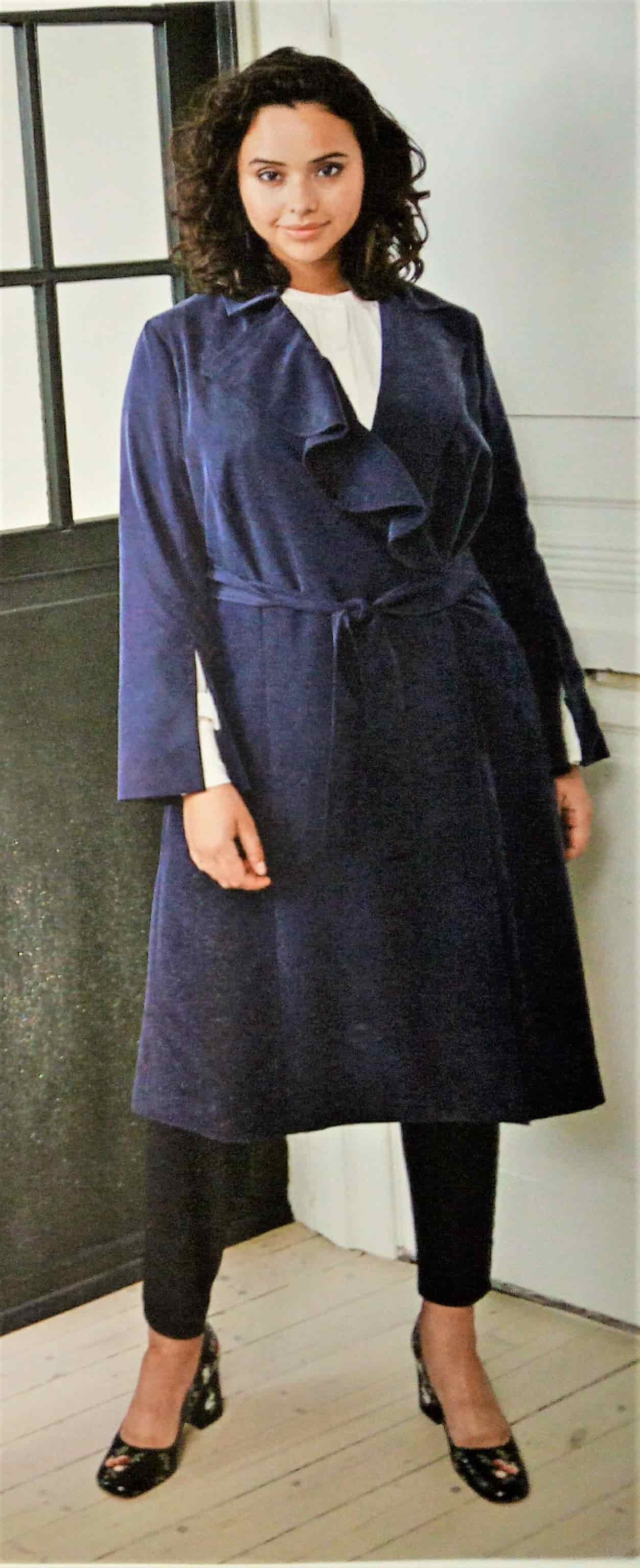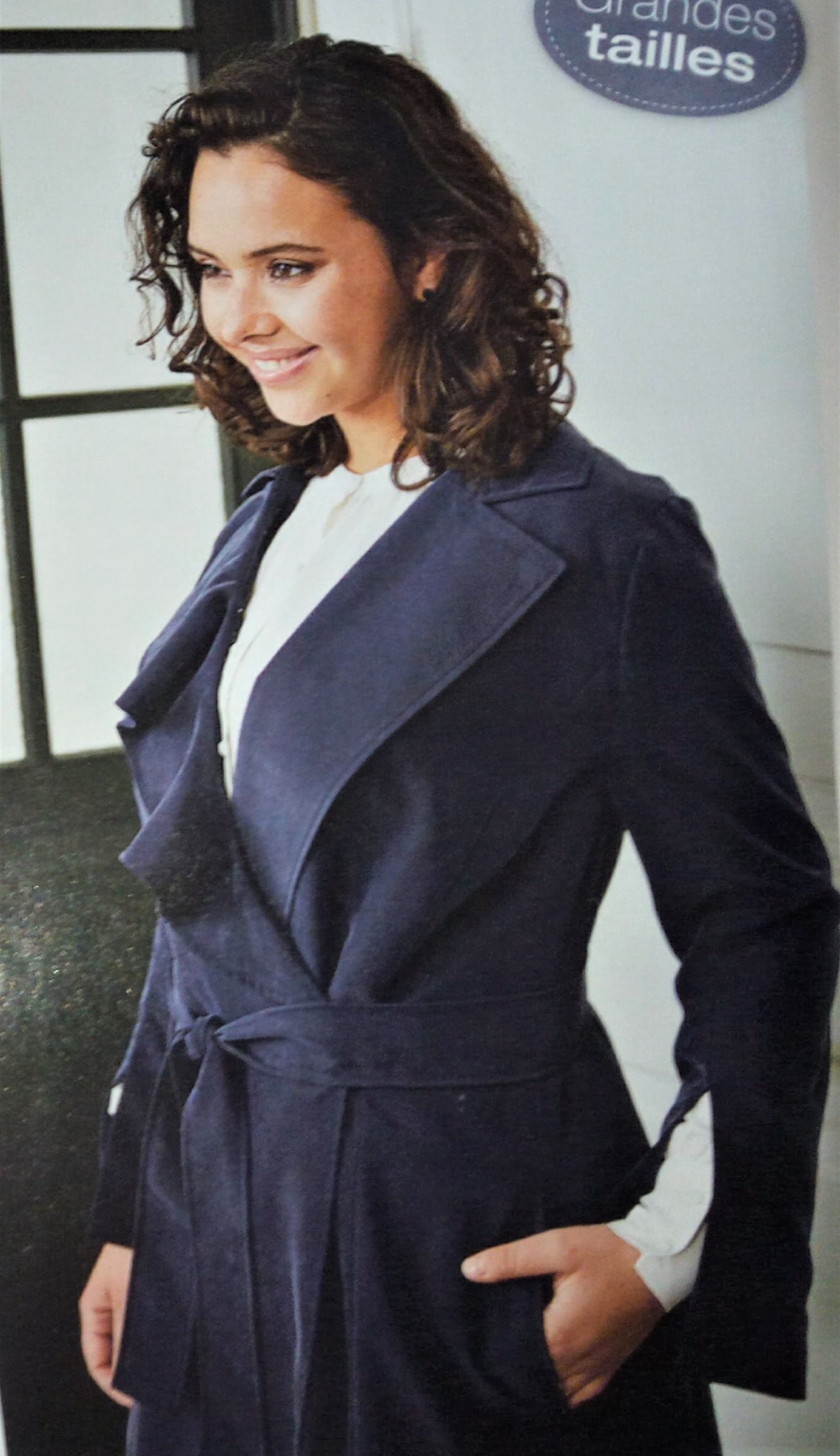 J’adore , ce manteau ou devrais je dire cette robe manteau. Il est fermée par une ceinture façon cache coeur. Le col est grand et large et agrémenté d’un volant sur un pan. Les découpes princesse allongent la silhouette. Les manches sont tailleurs avec une découpe. Il y des poches dans les coutures de côtés. Il va du 46 au 56.