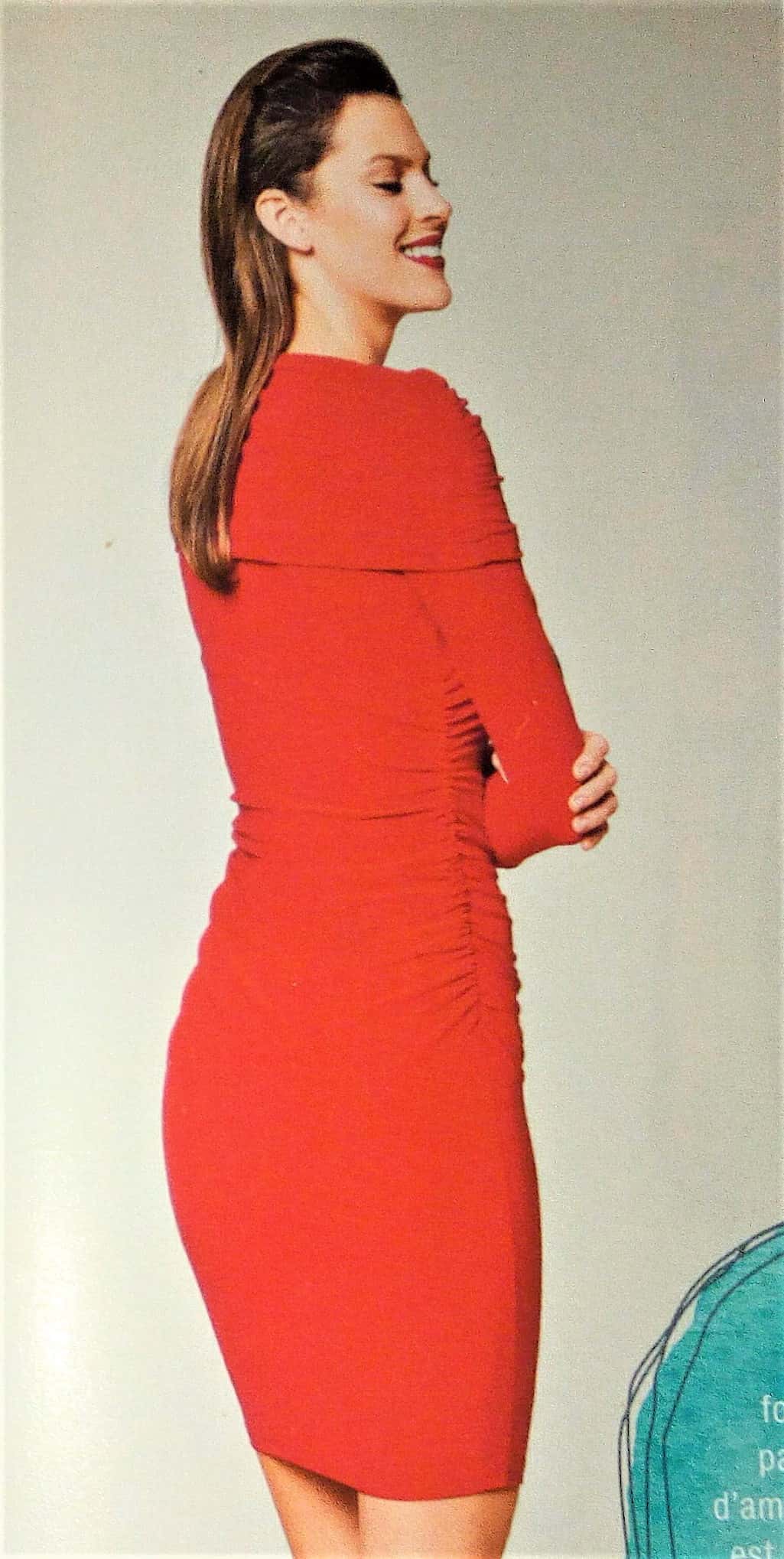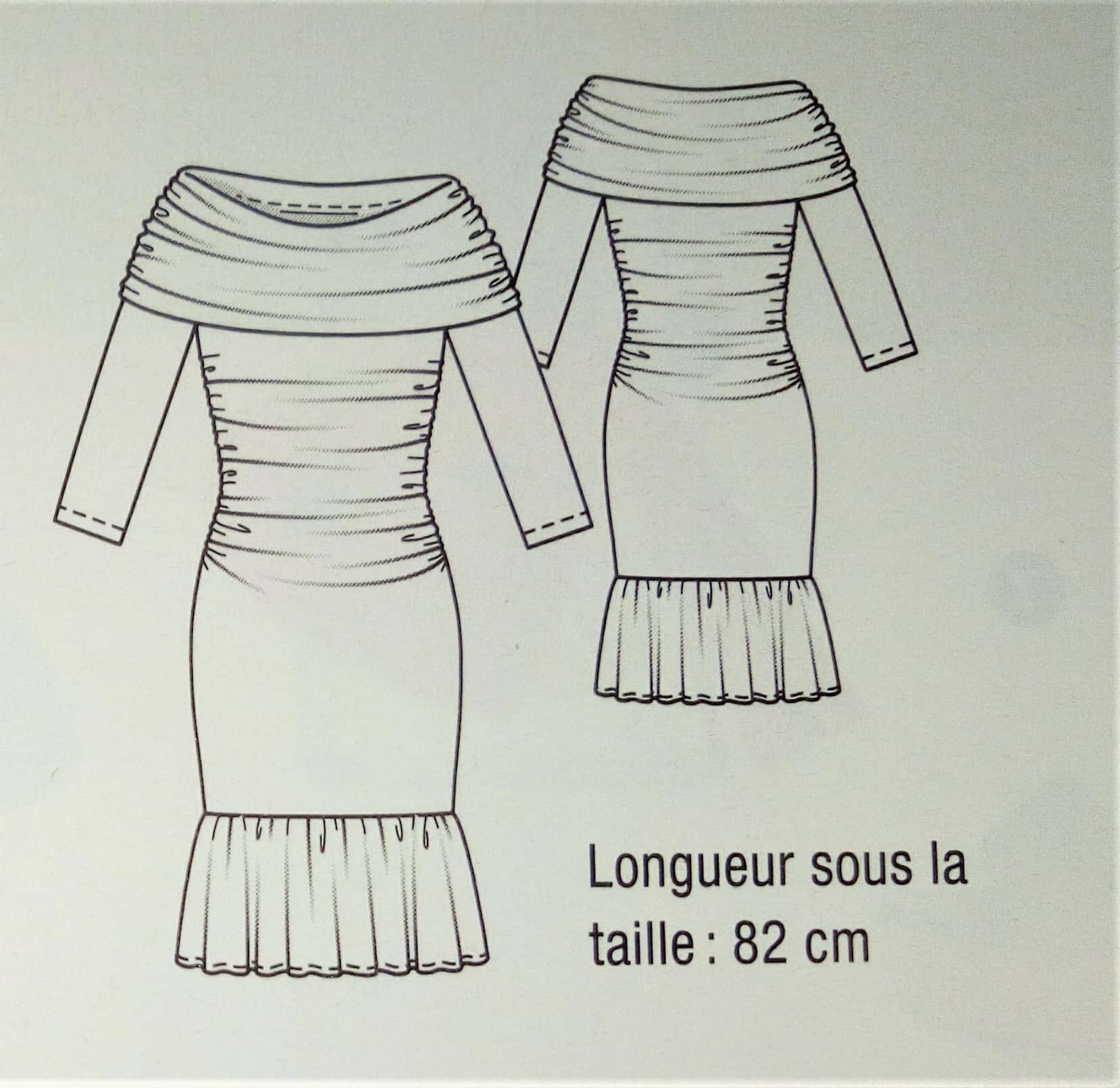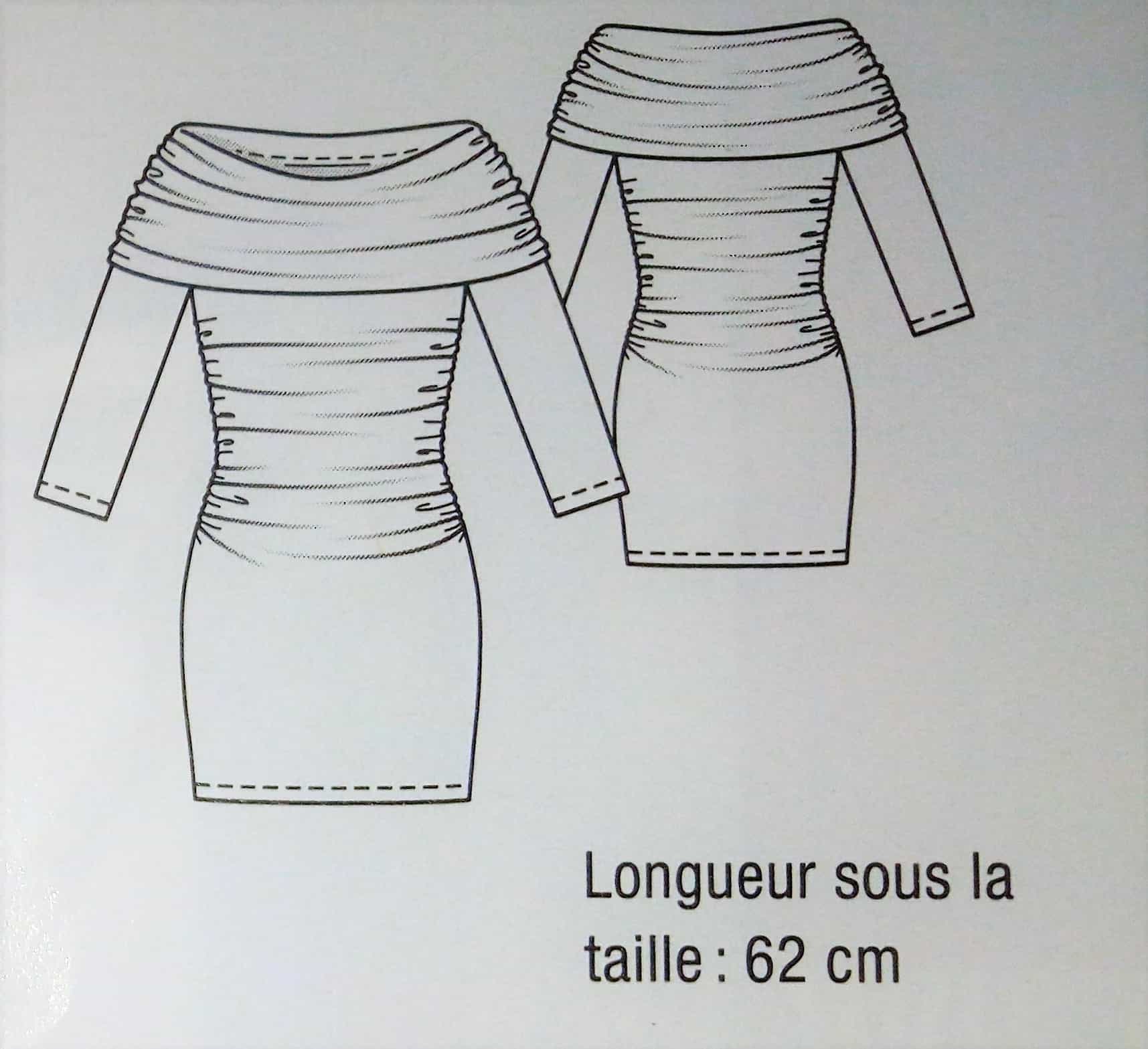 Cette robe glamour est sexy, est magnifique, tout comme la version marinière. Elle est moulante et drapée aux côtés sur la version robe. Le grand col bandeau permet de la porter de plusieurs manières, en col bénitier, bateau, roulé, ou sur les épaules pour un esprit romantique.