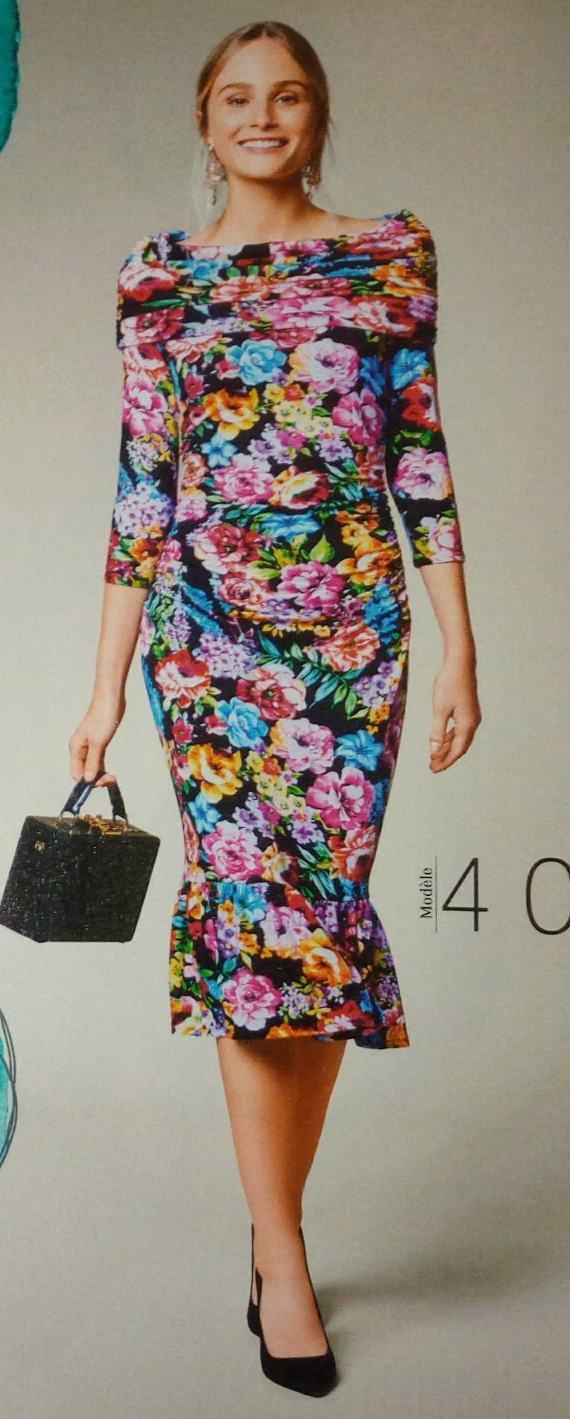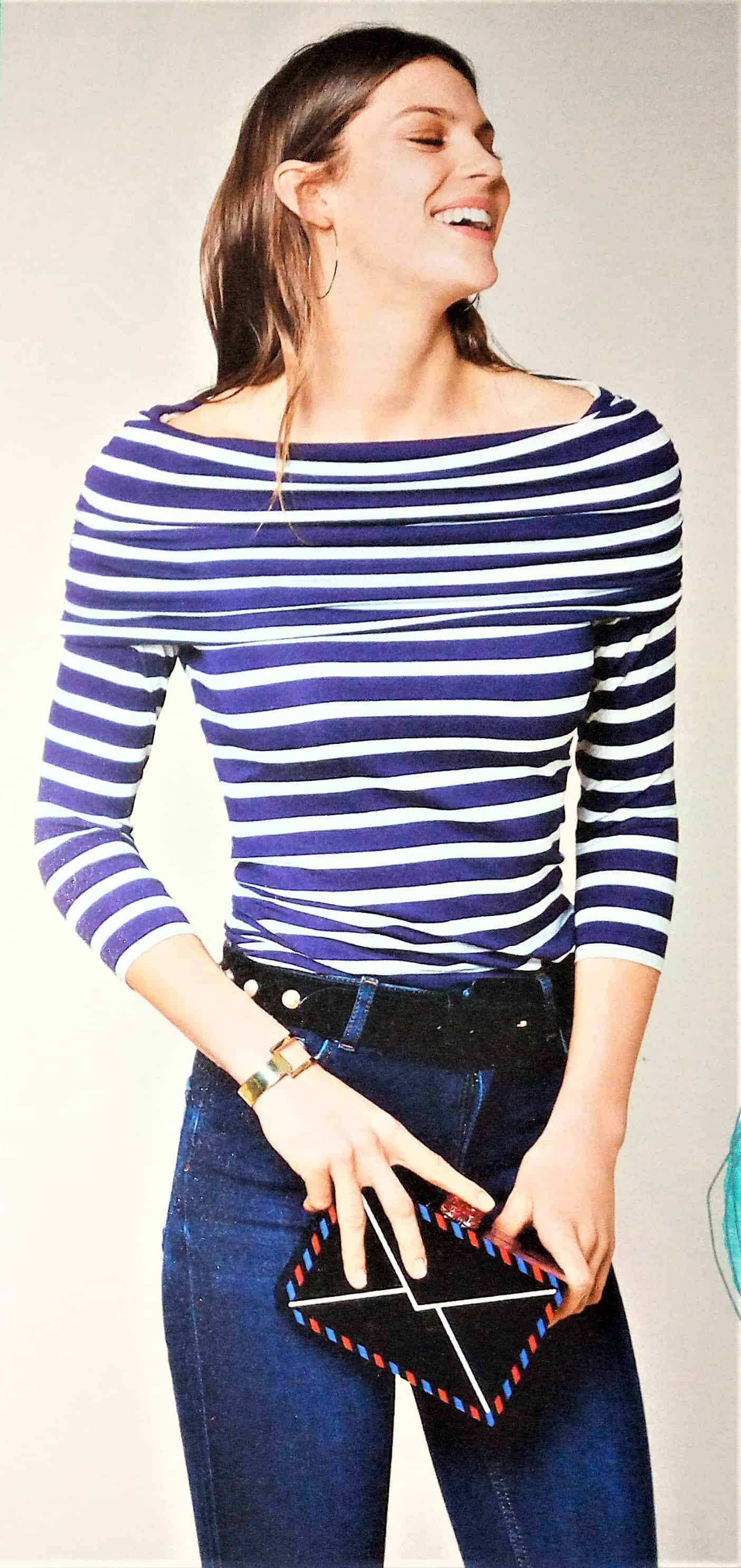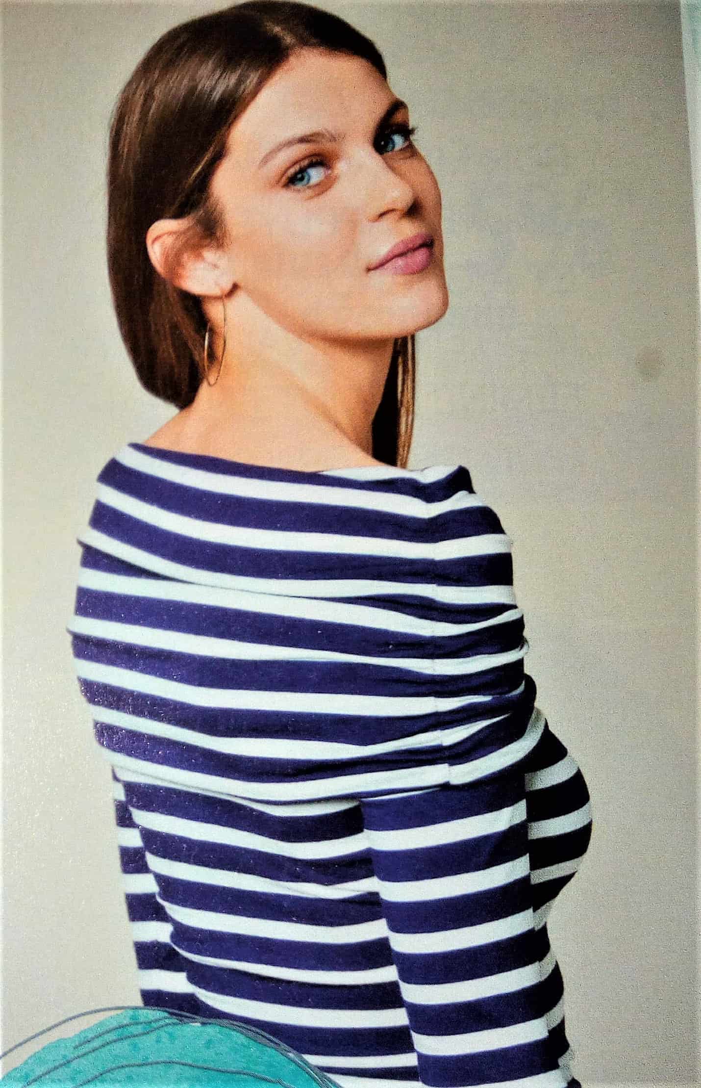 Cette robe glamour est sexy, est magnifique, tout comme la version marinière. Elle est moulante et drapée aux côtés sur la version robe. Le grand col bandeau permet de la porter de plusieurs manières, en col bénitier, bateau, roulé, ou sur les épaules pour un esprit romantique.