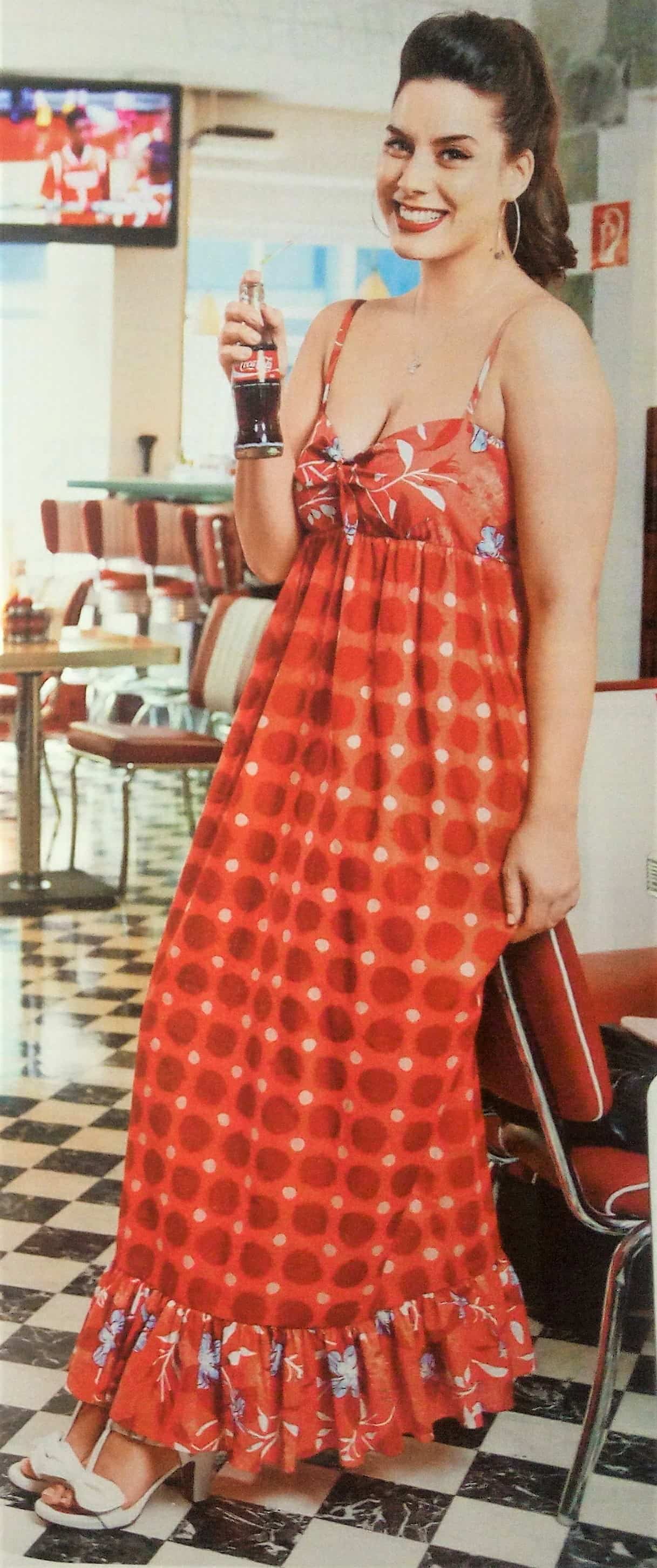 J’aime beaucoup cette robe d’inspiration flamenco. Elle possède des manches 3/4 avec une pince. Le corsage est de forme croisée cache coeur, avec des petits plis partant de l’épaule. La jupe à volants est asymétrique et maintenue à la taille par une piqûre. Elle va de la taille 44 au 54.