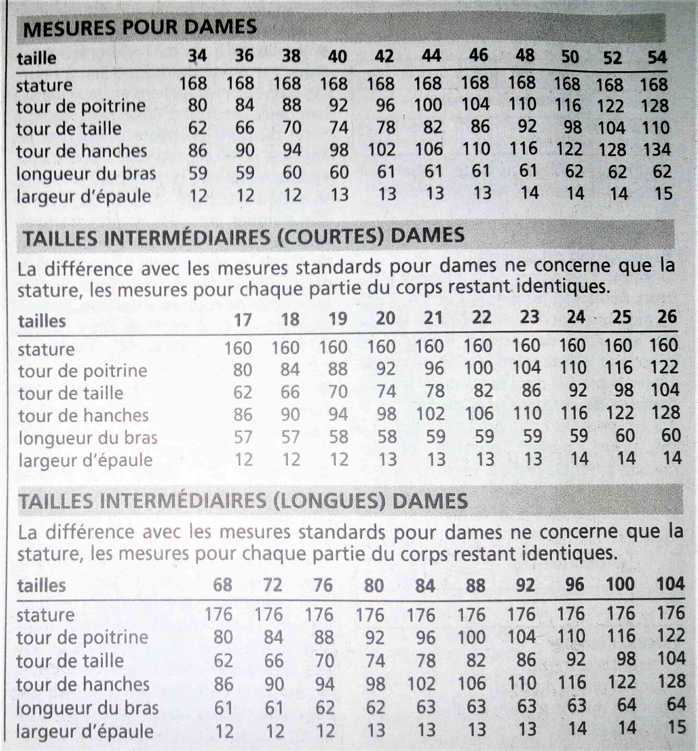 Le tableau des tailles