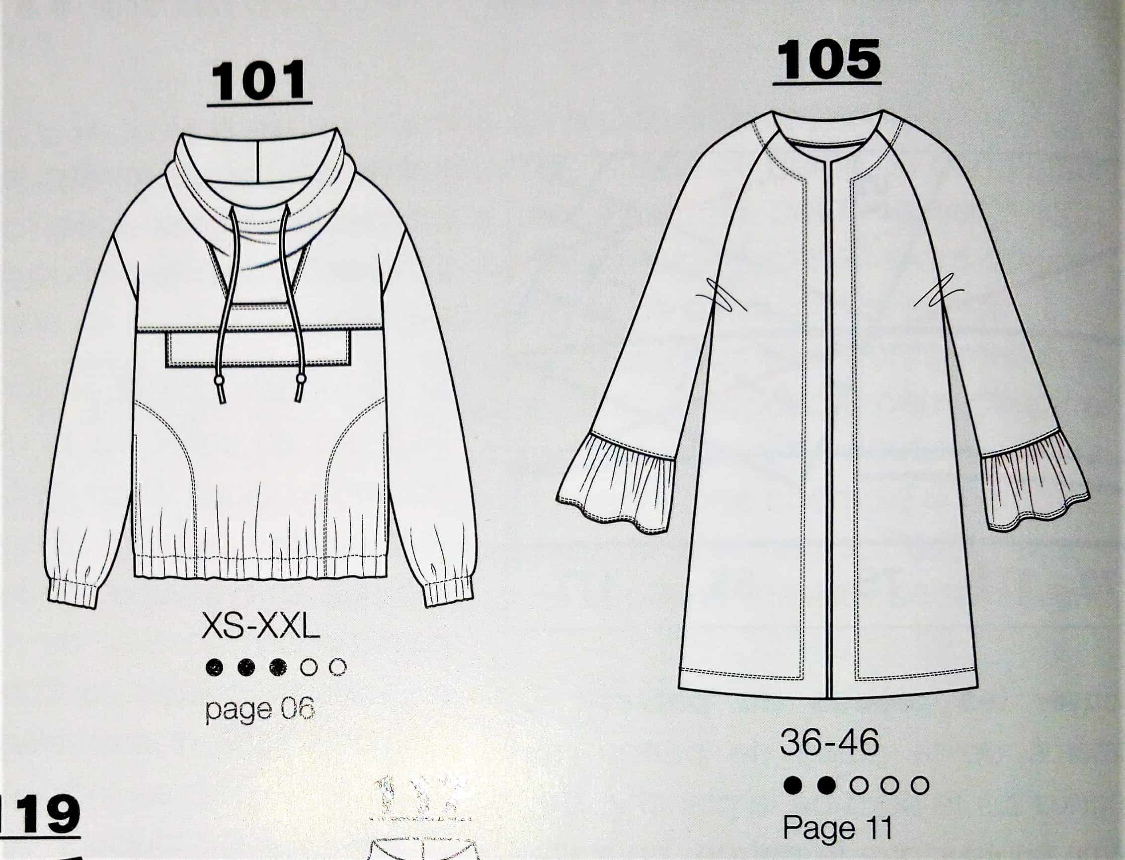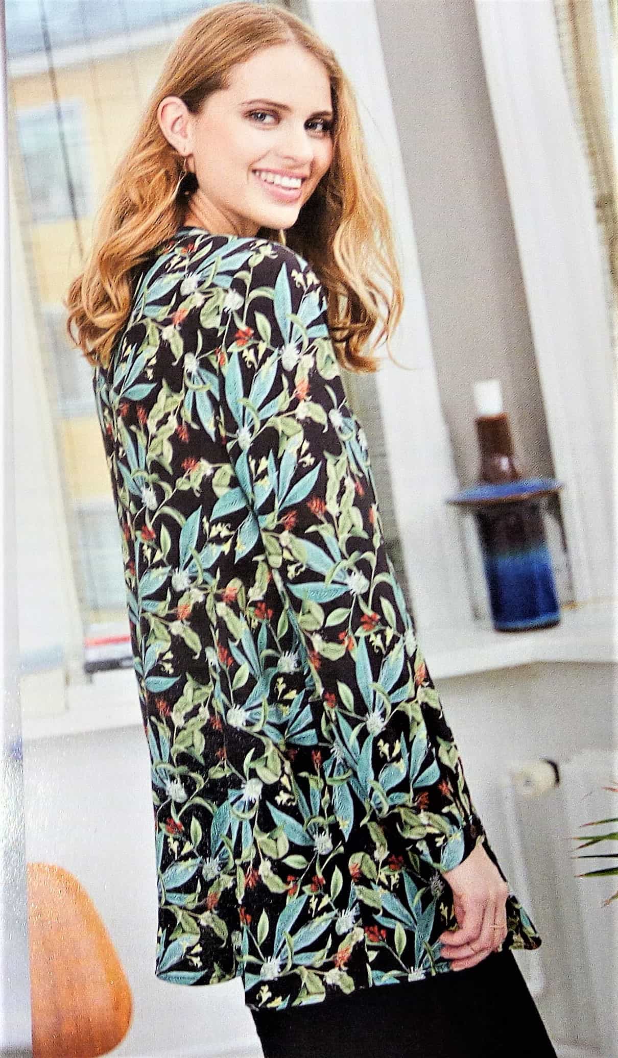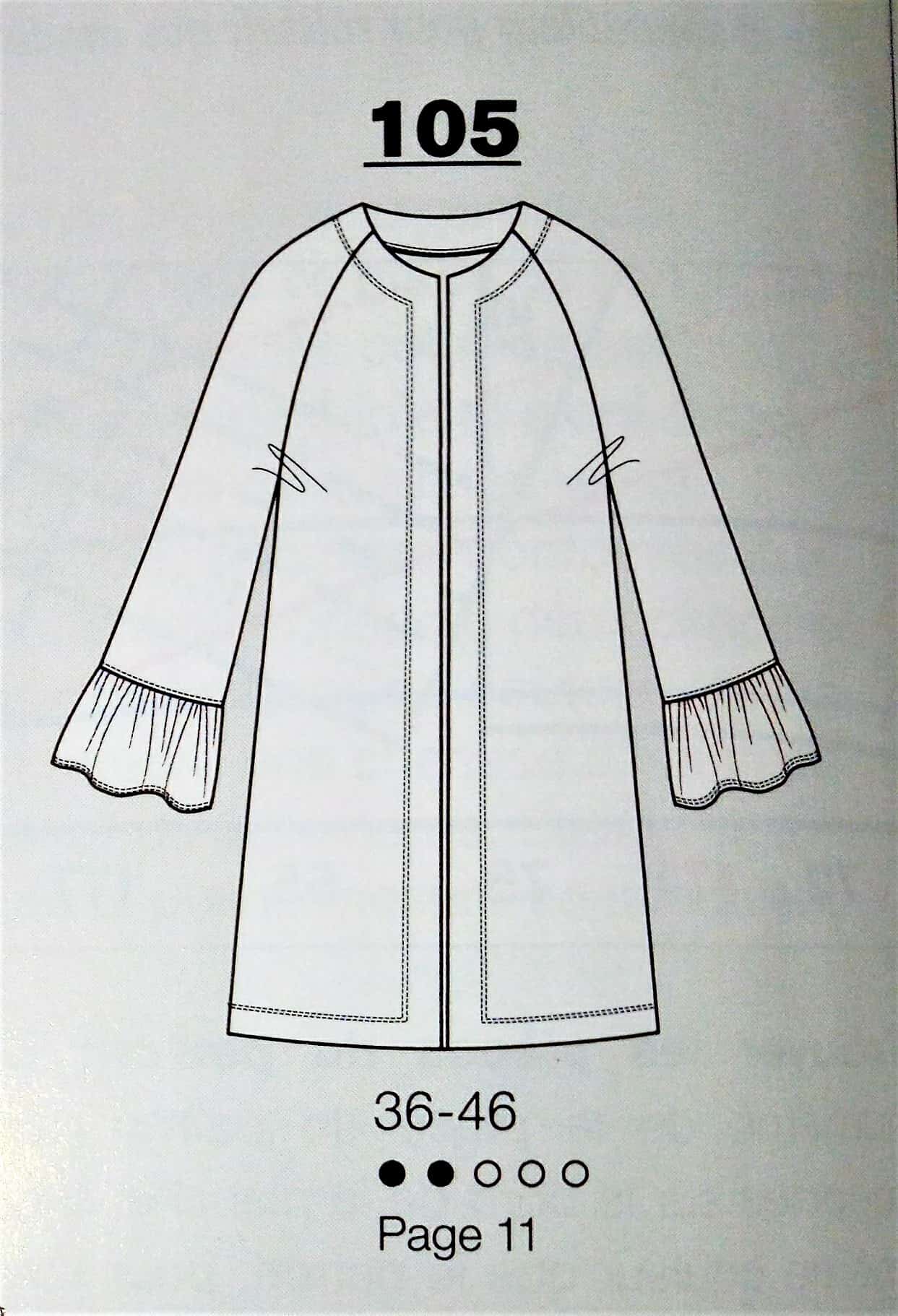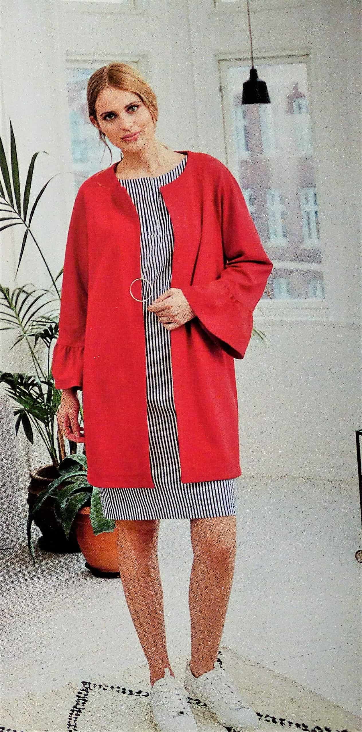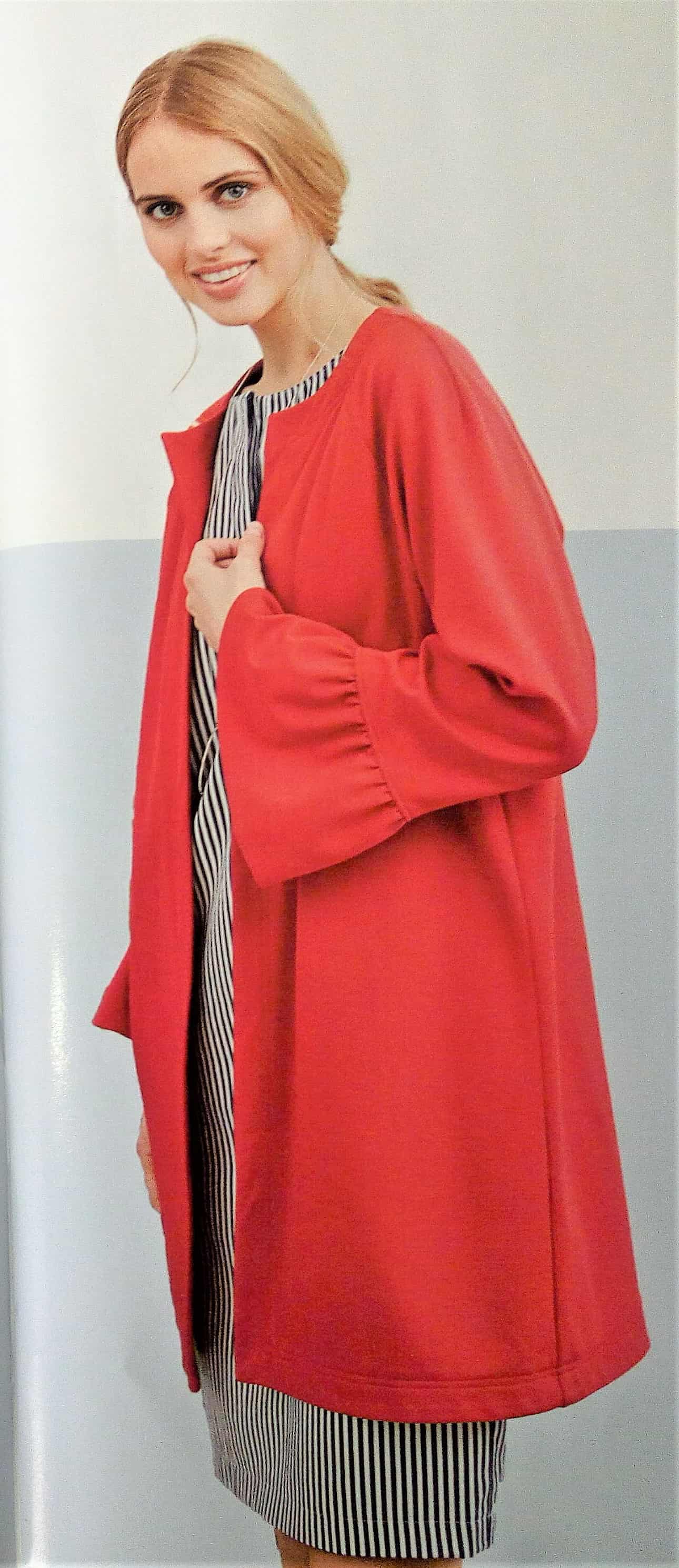 J’adore cette longue veste toute simple avec ses manches raglans volantées. Elle se porte ouverte d’où l’absence de boutonnage et rend merveilleusement bien en rouge. Les tailles vont de la taille 36 au 46.