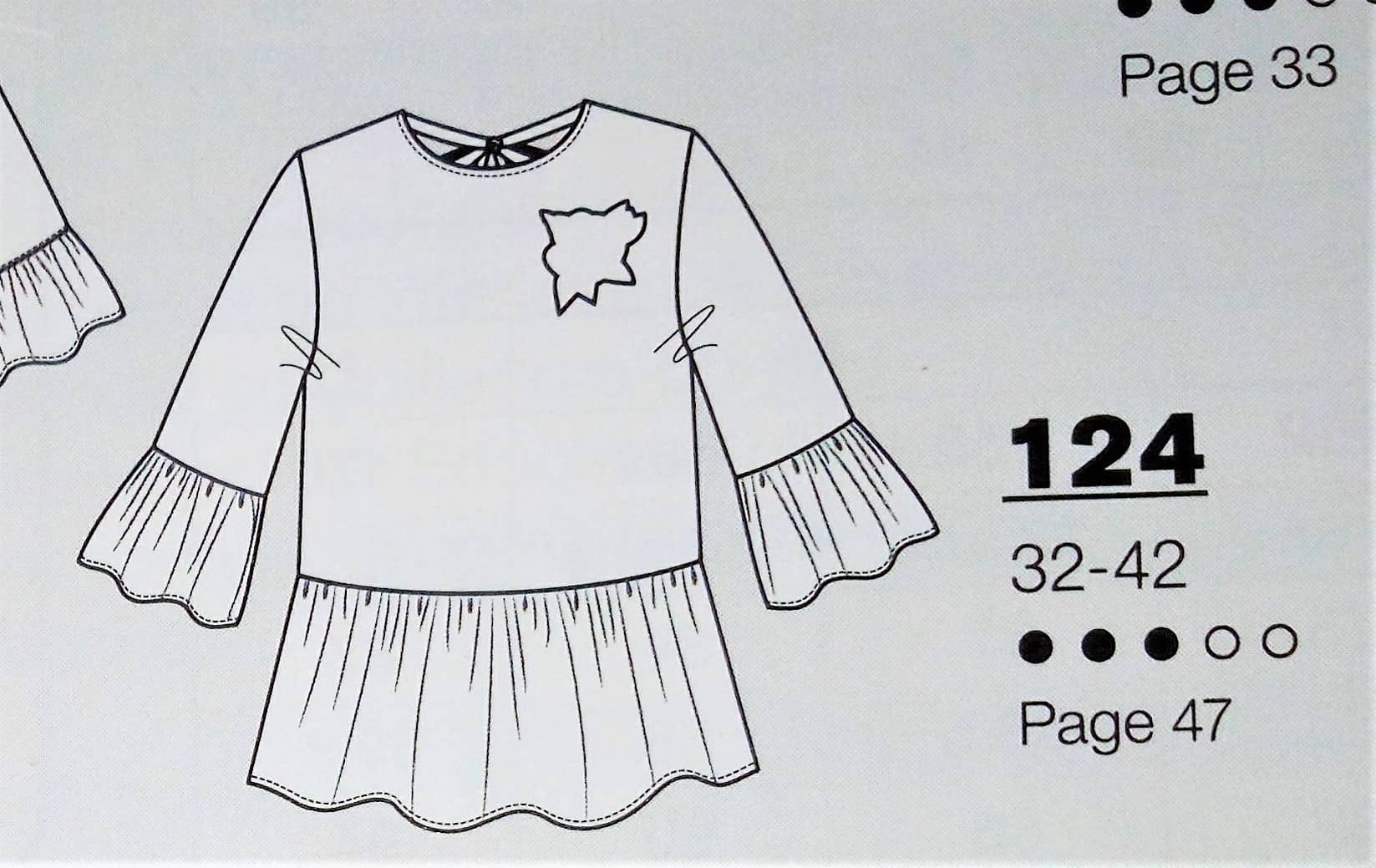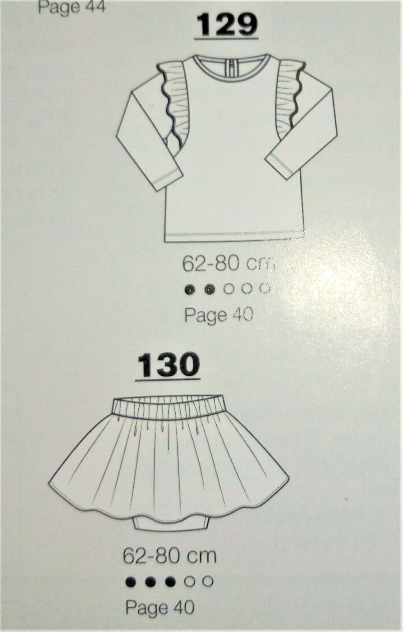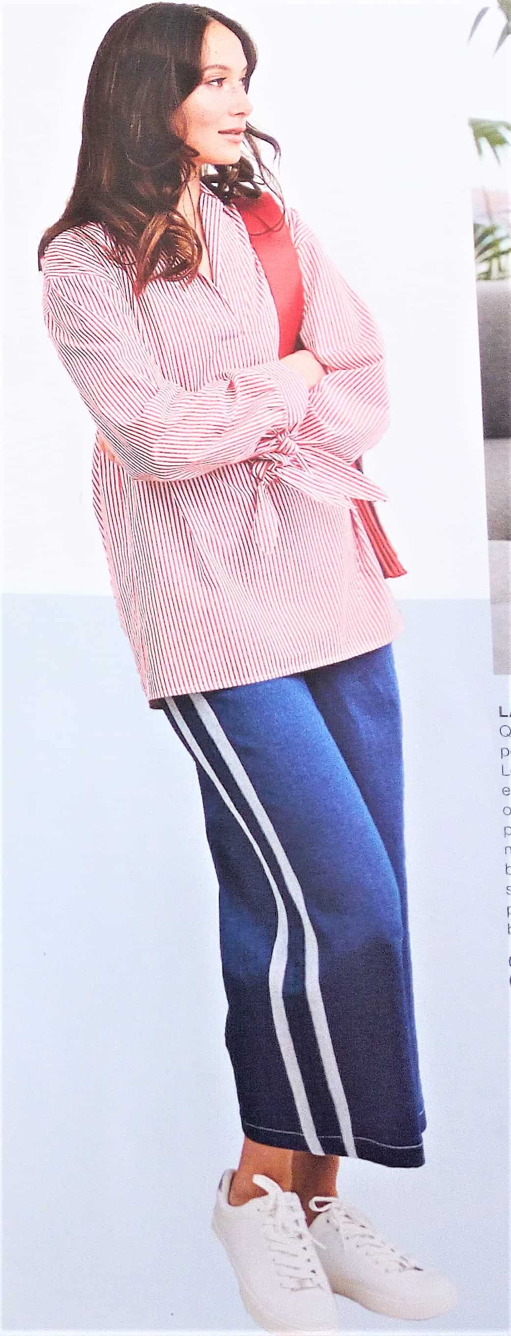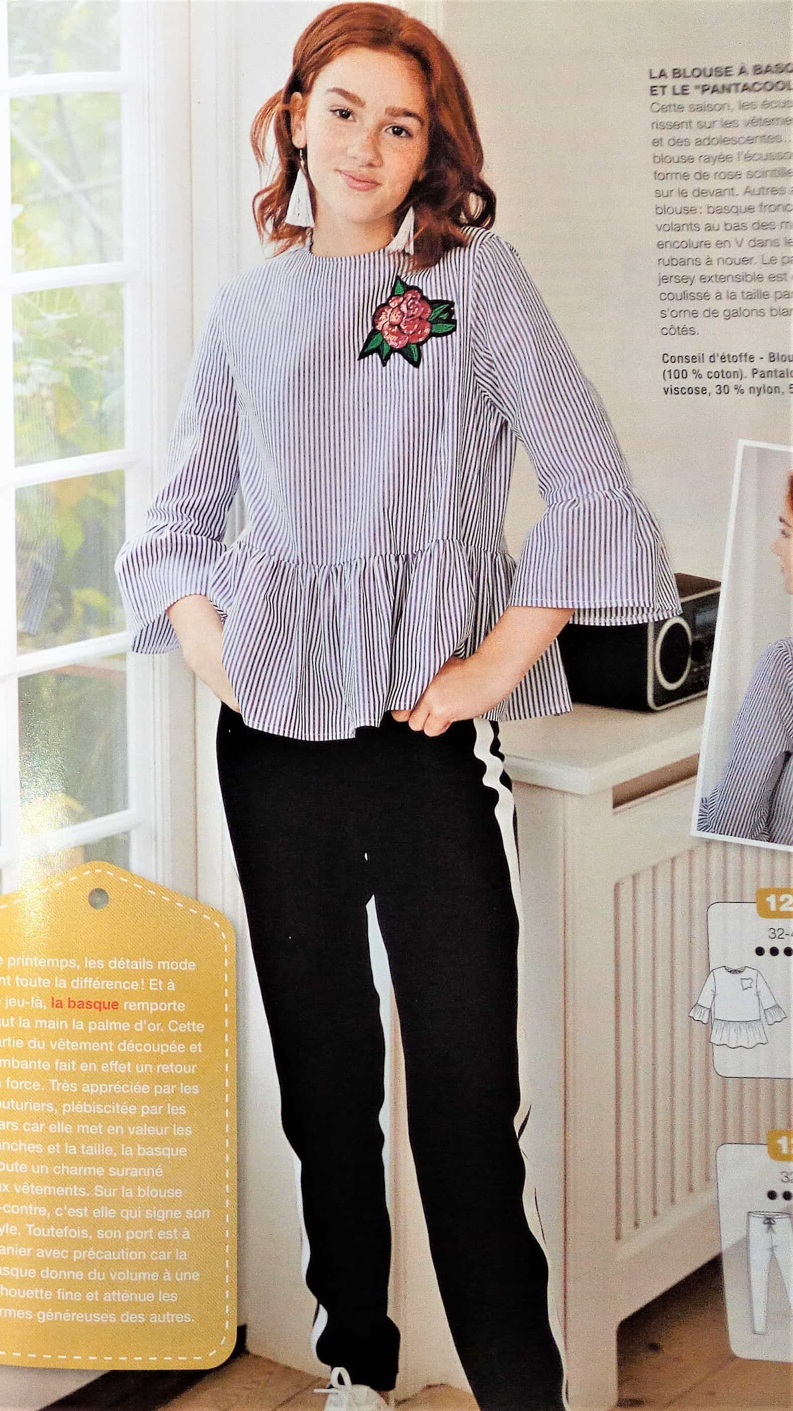 Encore pour ma pepette, ce coup ci des vêtements qui commencent à la taille 32, les ados sont trop souvent délaissés dans les revues couture, donc là je suis ravie de trouver une tenue complète. Il s’agit d’une blouse avec sa basque en forme de volant froncé tout comme les bas de manches. Le « pantacool » est réalisé en jersey , il est de forme droite et coulissé à la taille. Ils vont tous les deux du 32 au 42.