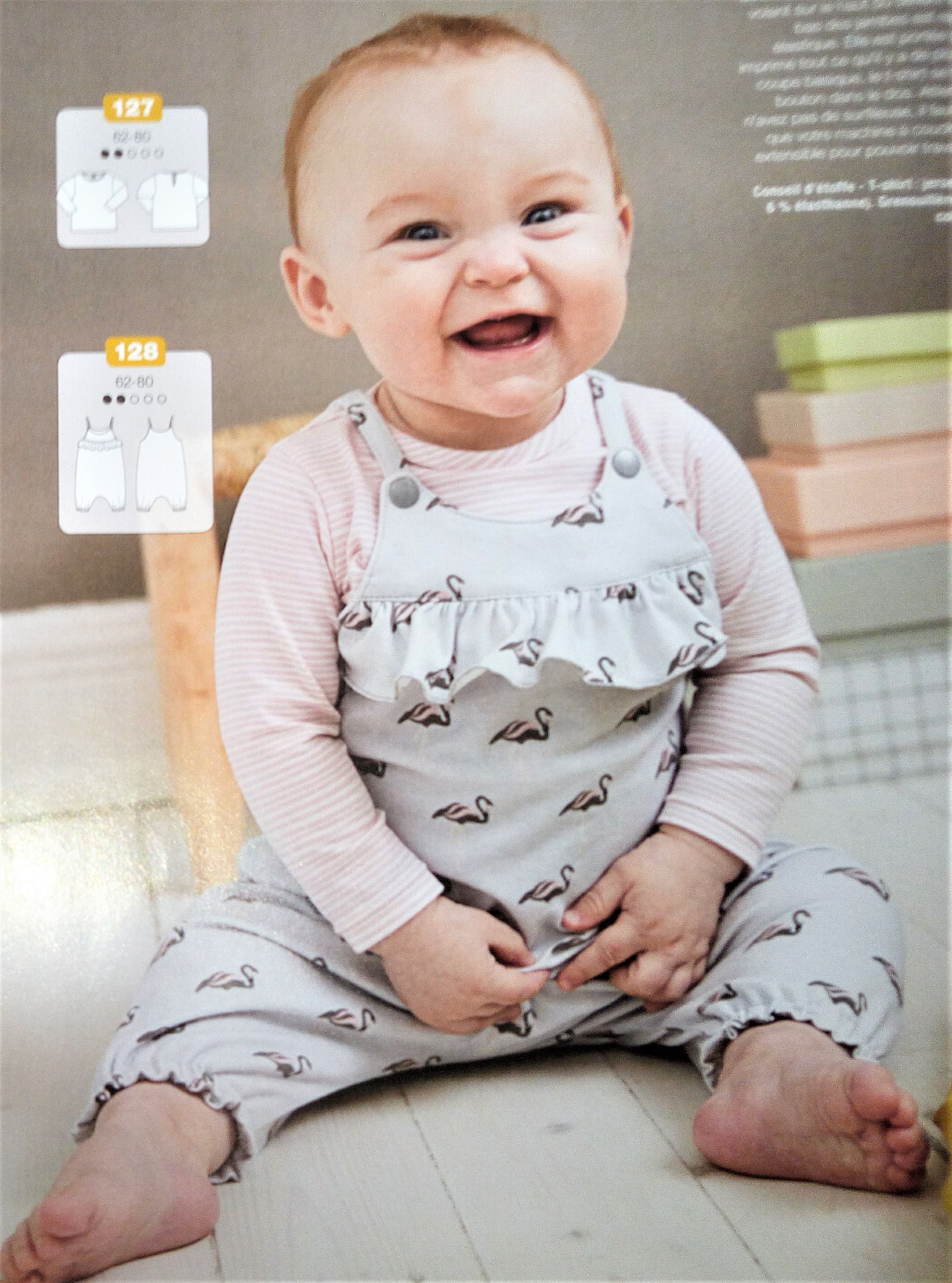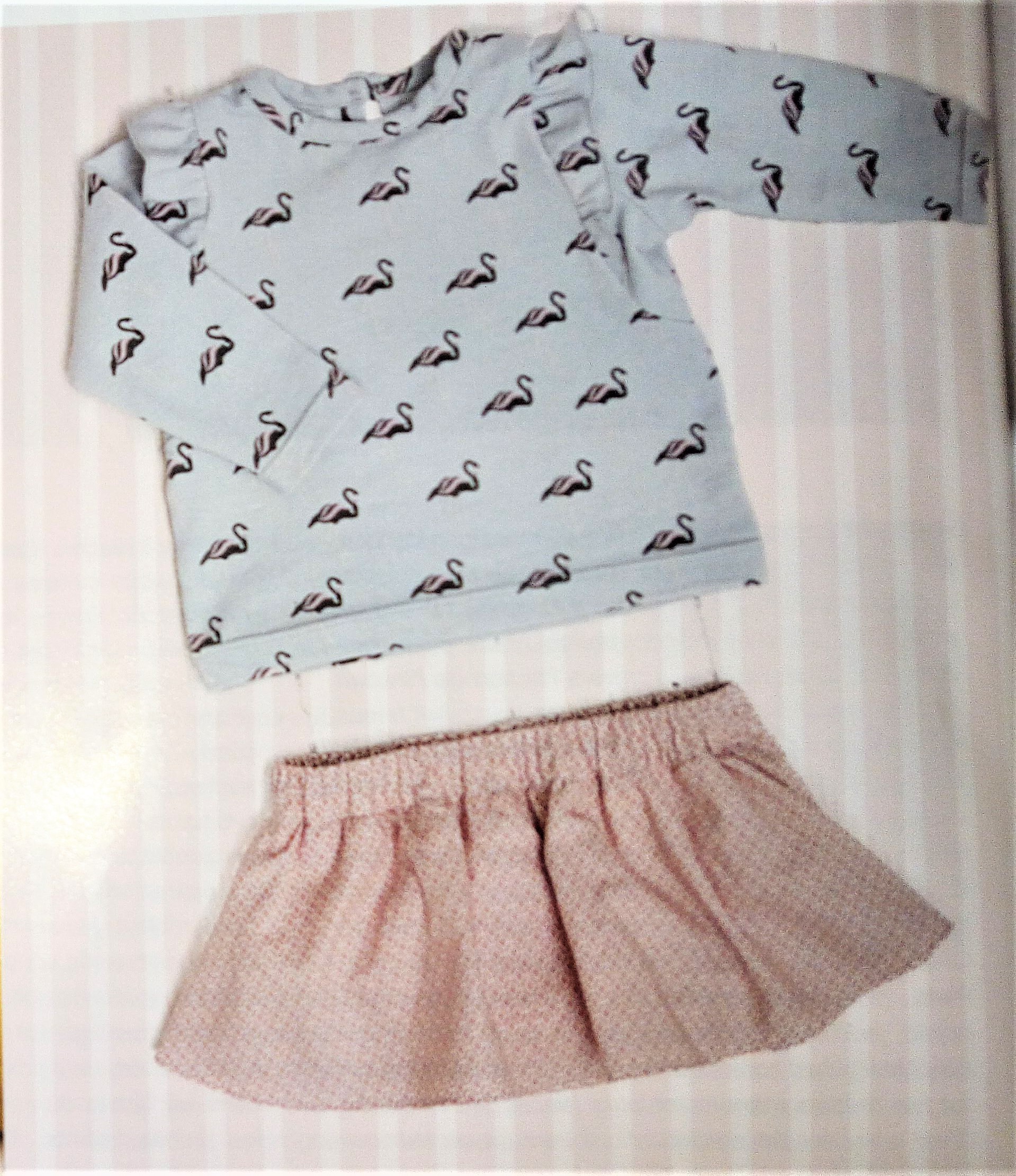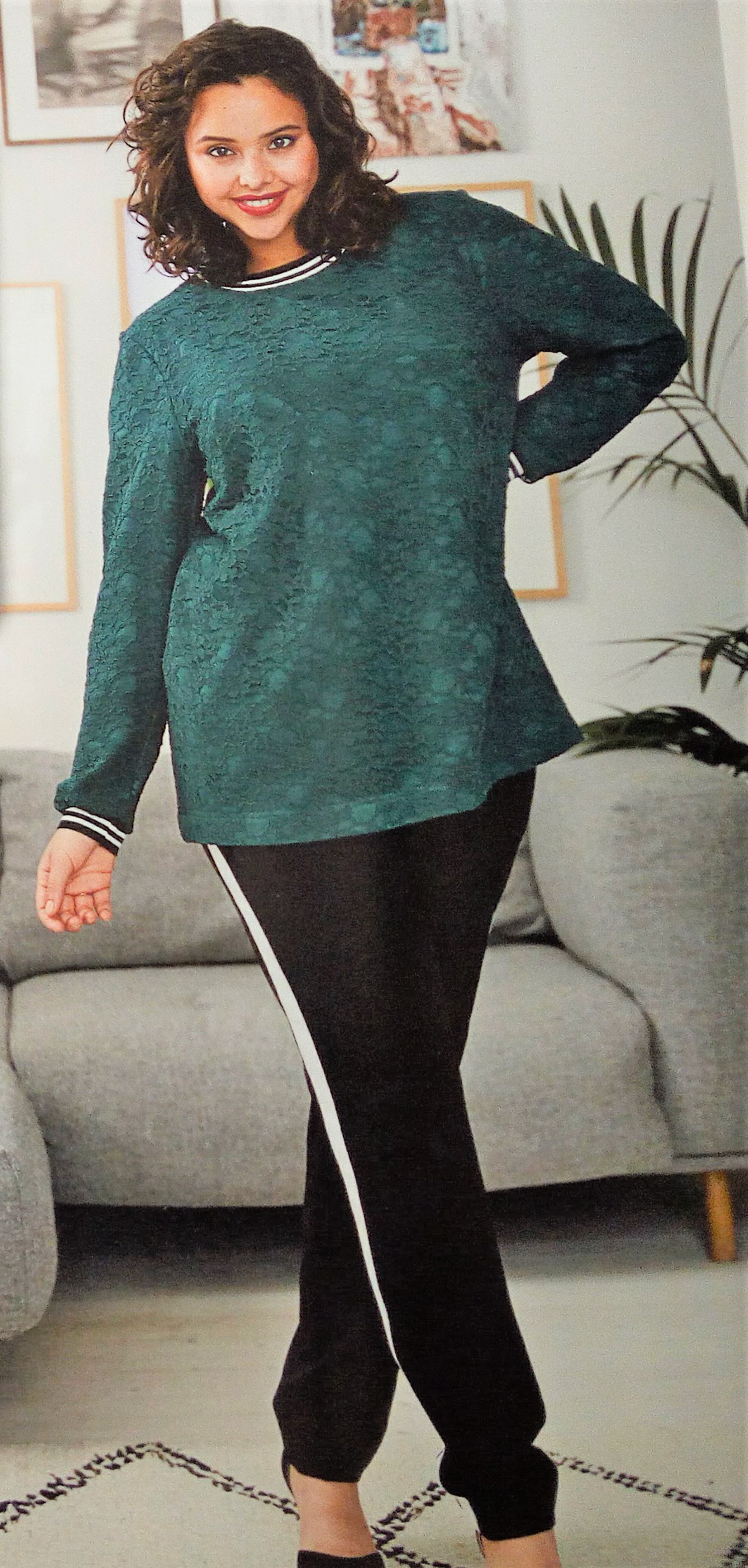 Encore pour ma pepette, ce coup ci des vêtements qui commencent à la taille 32, les ados sont trop souvent délaissés dans les revues couture, donc là je suis ravie de trouver une tenue complète. Il s’agit d’une blouse avec sa basque en forme de volant froncé tout comme les bas de manches. Le « pantacool » est réalisé en jersey , il est de forme droite et coulissé à la taille. Ils vont tous les deux du 32 au 42.