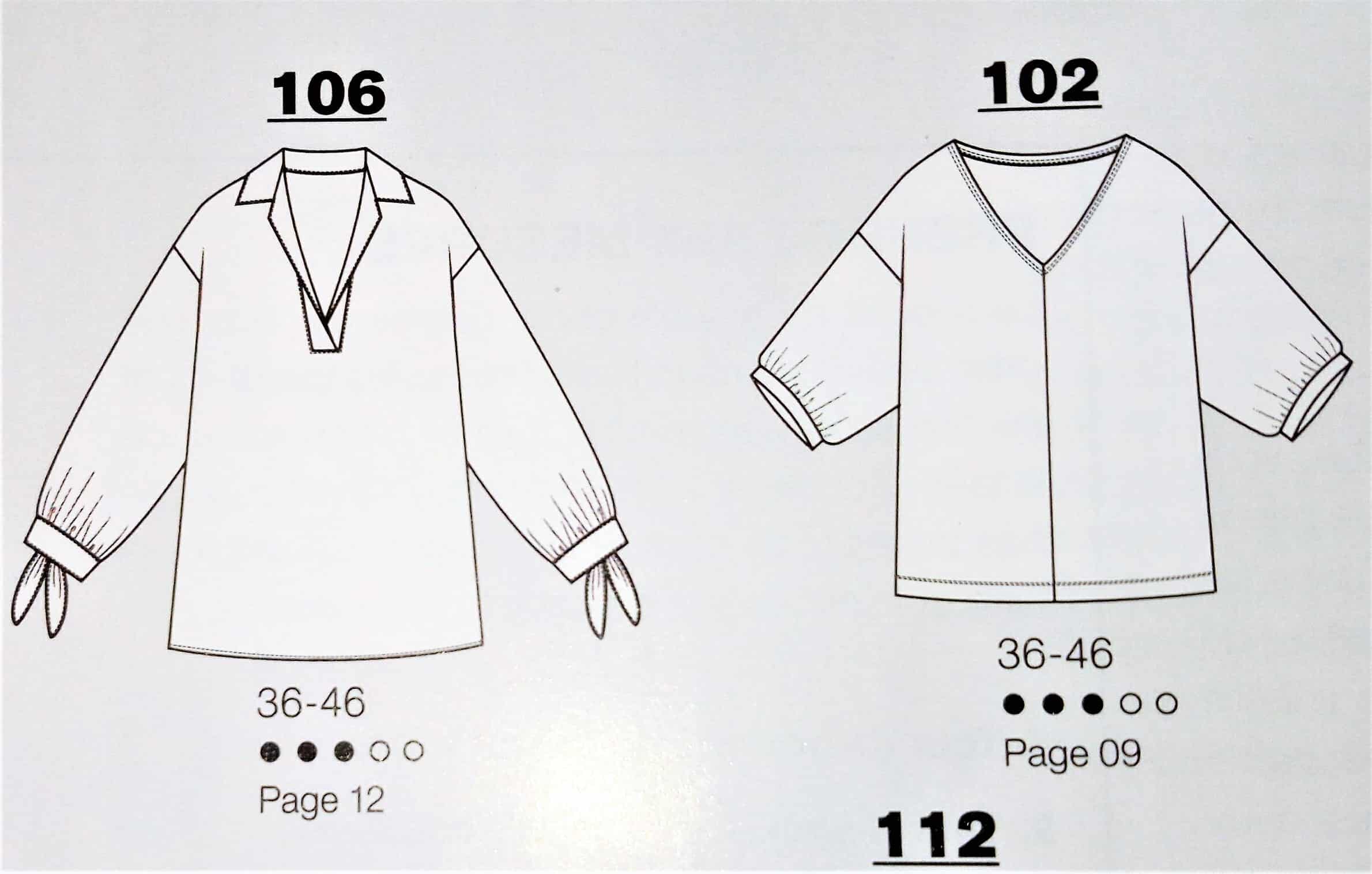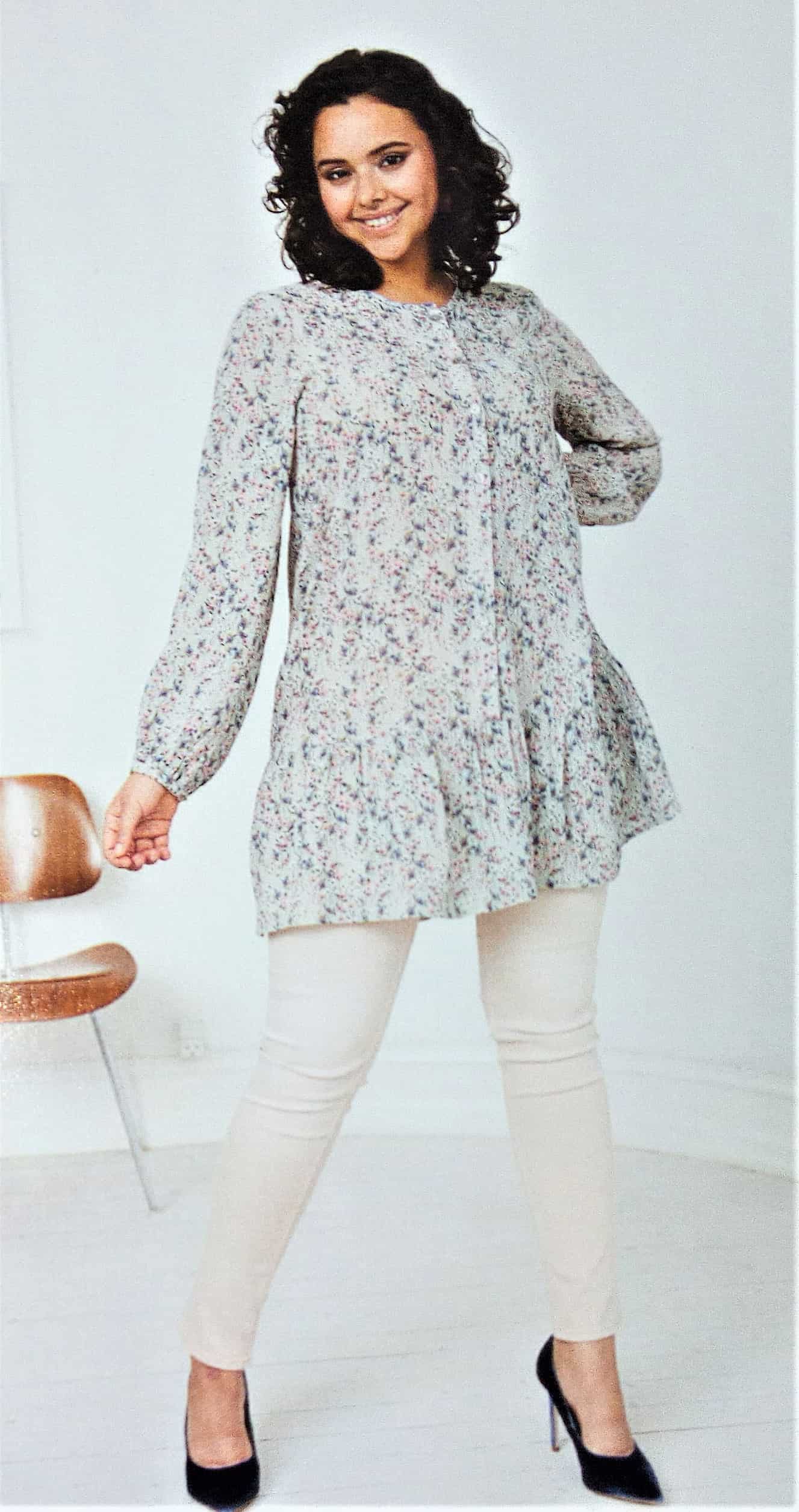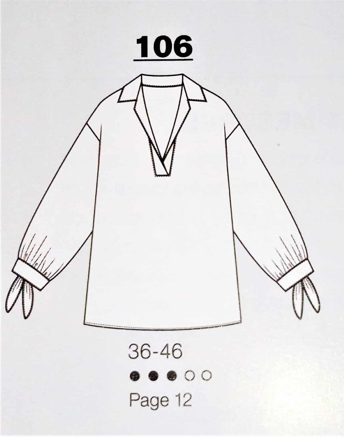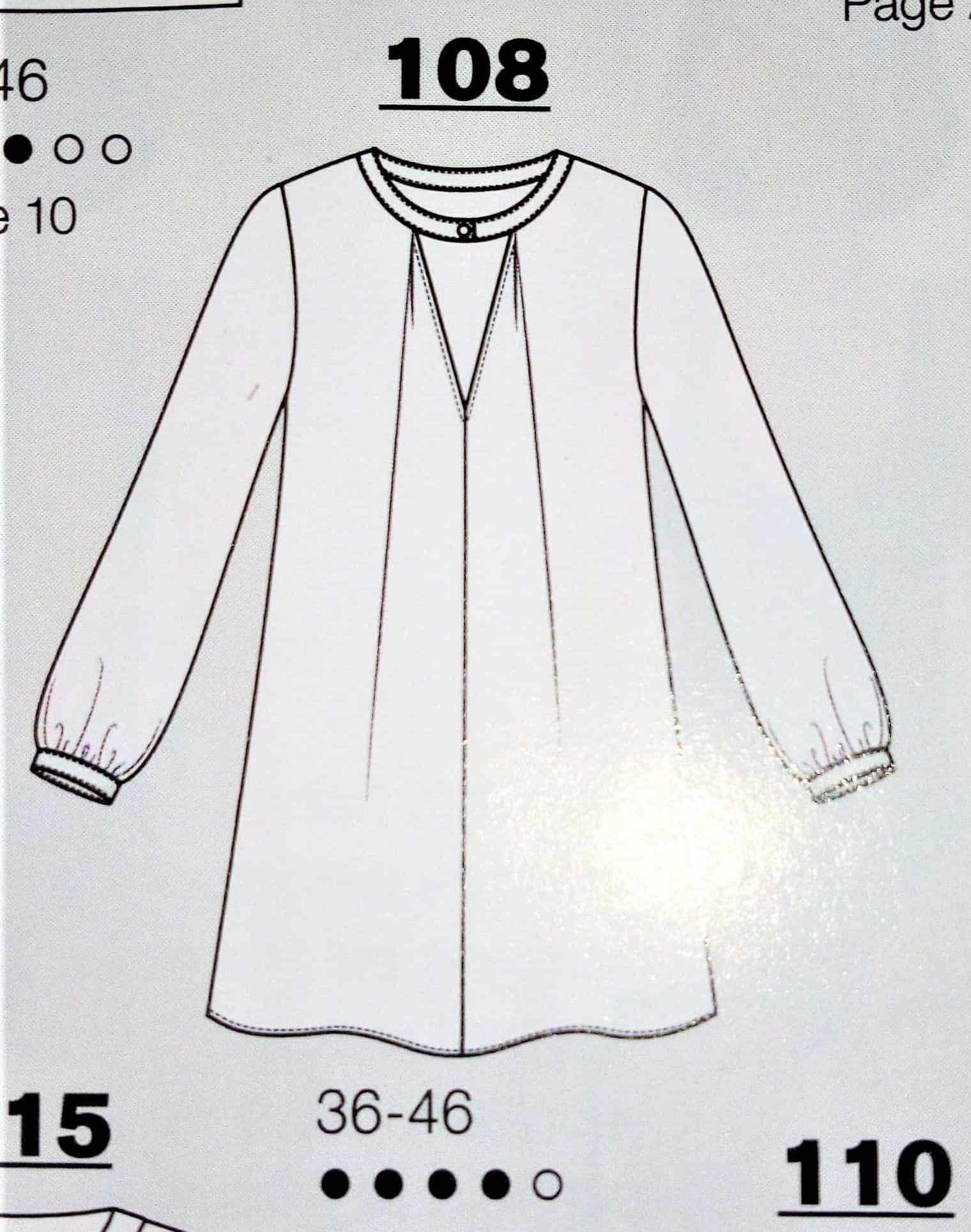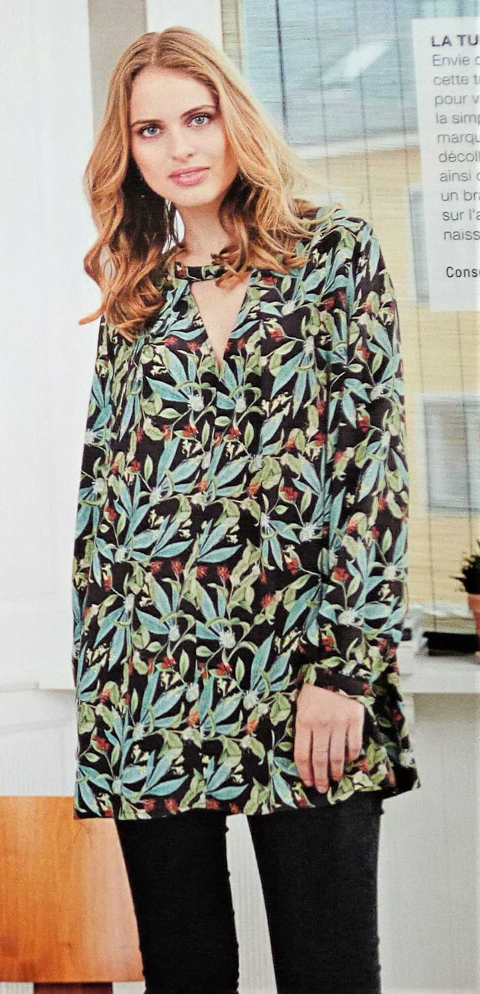 Cette tunique est superbe, de coupe simple avec un décolleté V maintenue par une petite patte boutonnée, des manches froncées sur un bracelet et deux plis qui partent de l’encolure. Elle va de la taille 36 au 46.