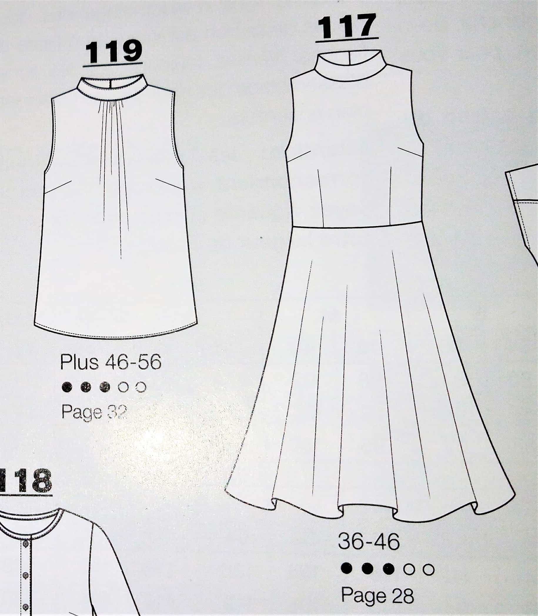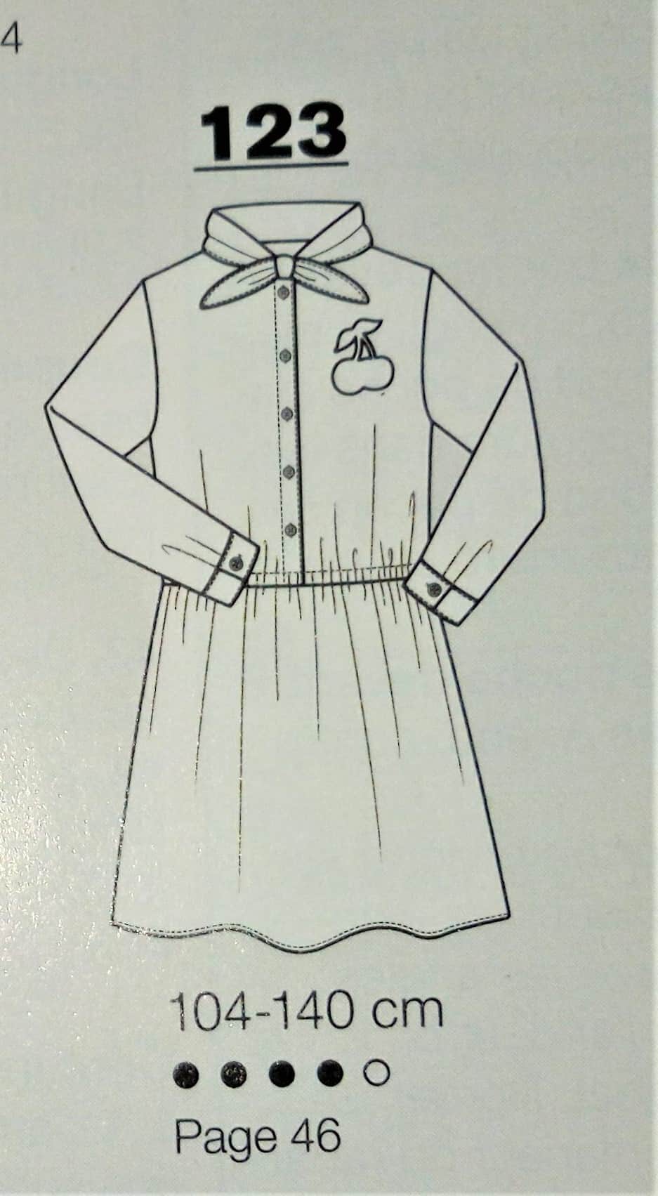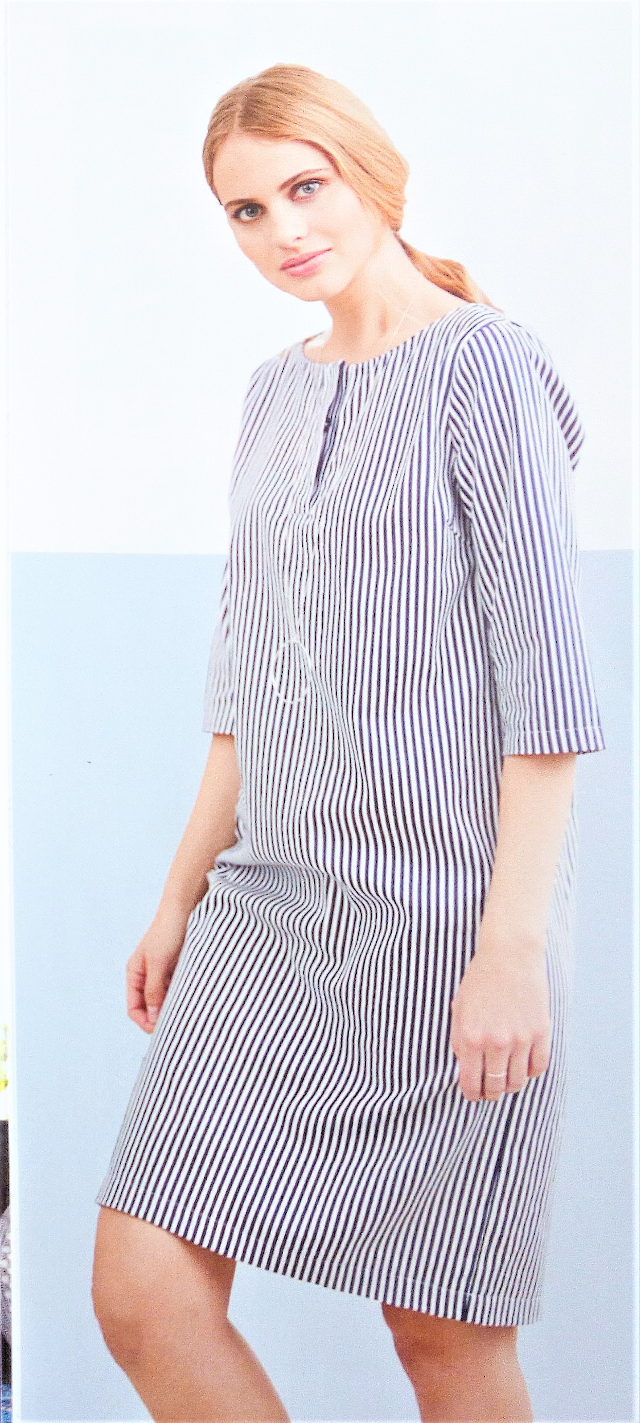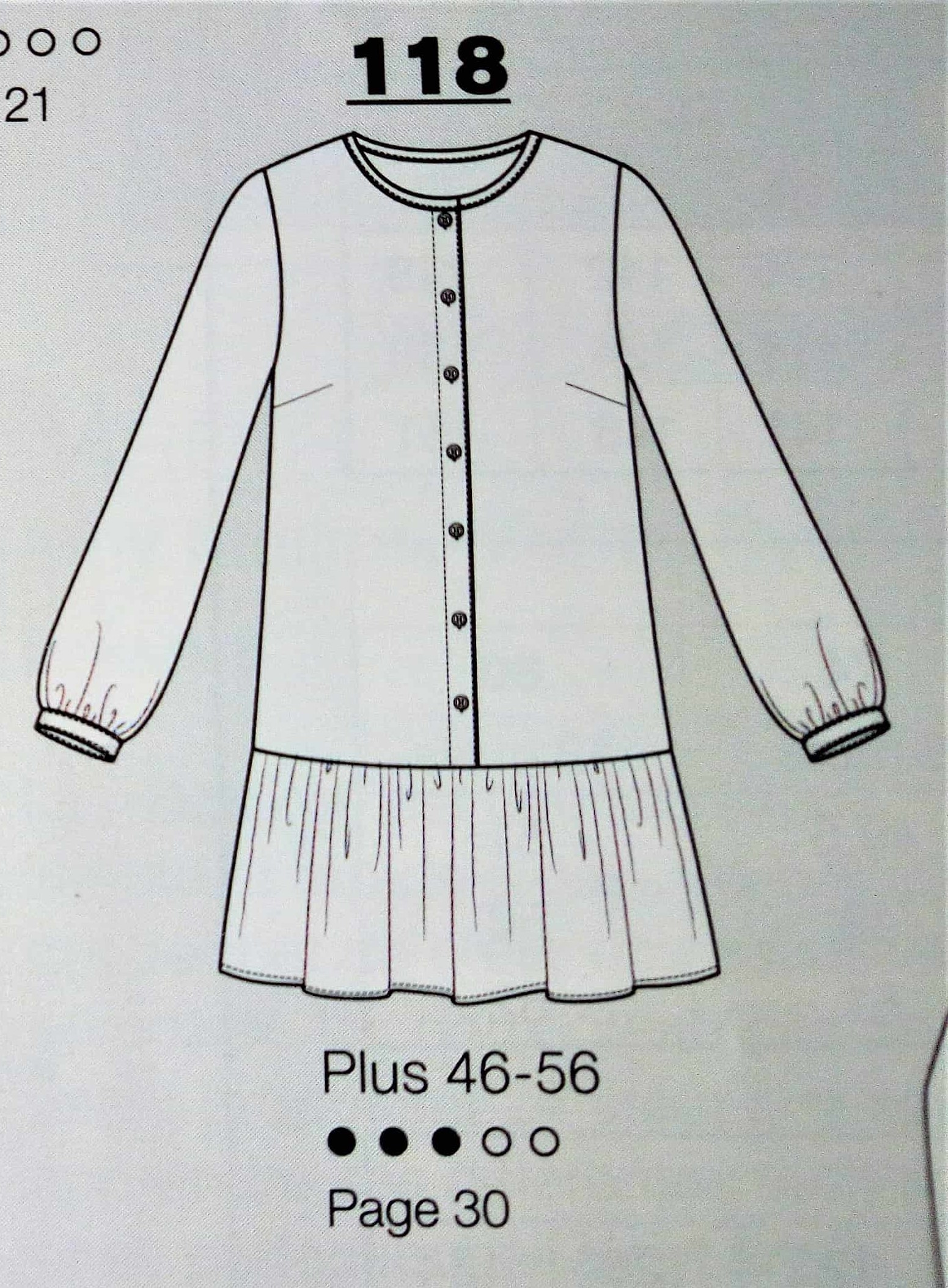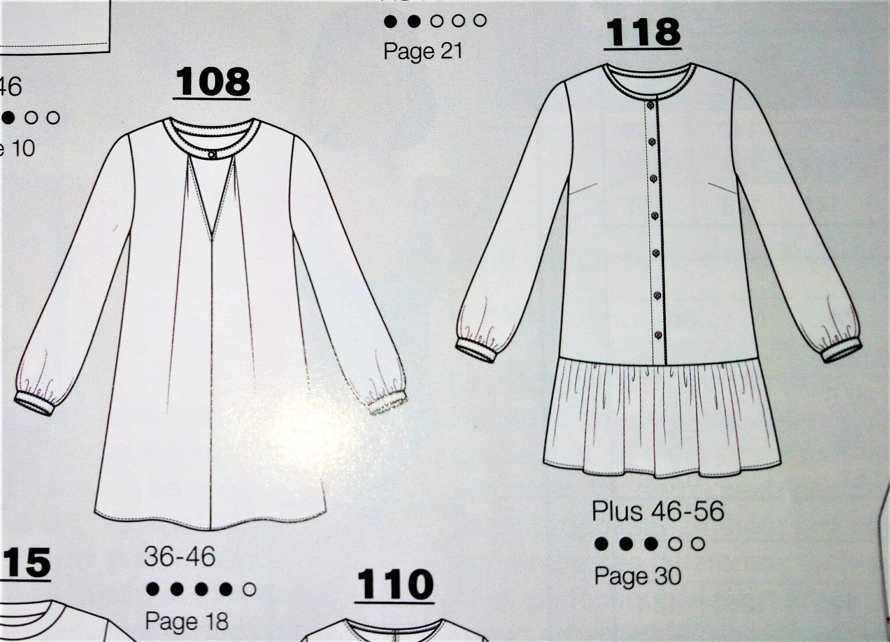 Cette tunique est superbe, de coupe simple avec un décolleté V maintenue par une petite patte boutonnée, des manches froncées sur un bracelet et deux plis qui partent de l’encolure. Elle va de la taille 36 au 46.