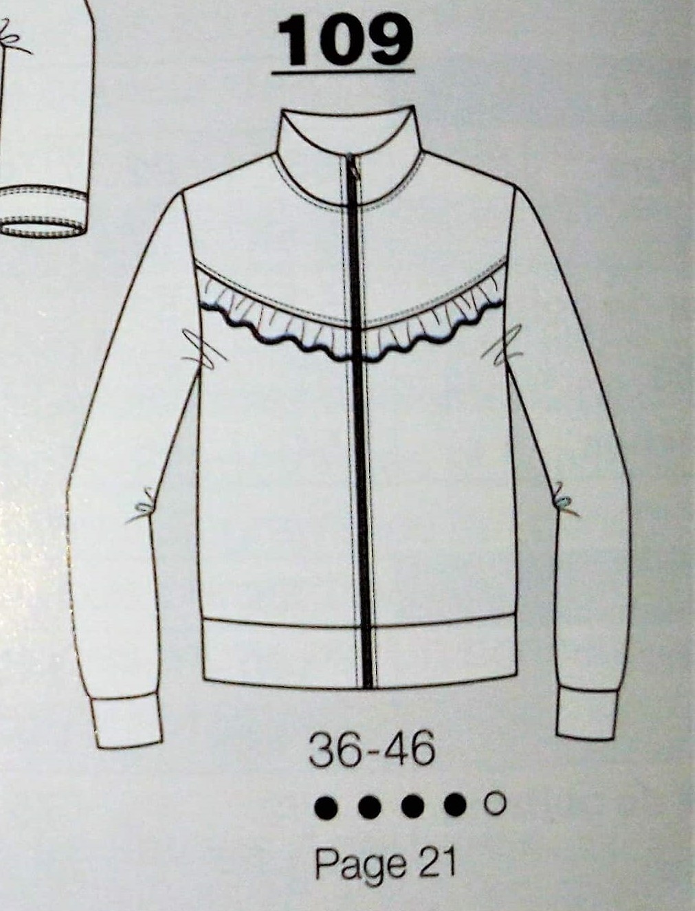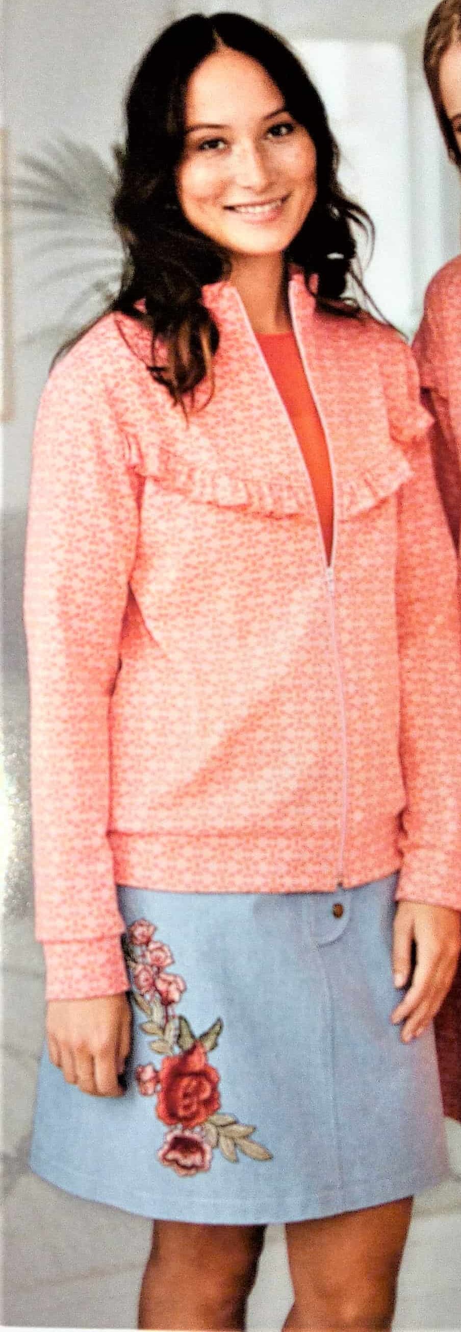 Voici un gilet/cardigan très sympa. Il est zippé, à manches longues et possède un empiècement souligné d’un petit volant. Il va du 36 au 46.