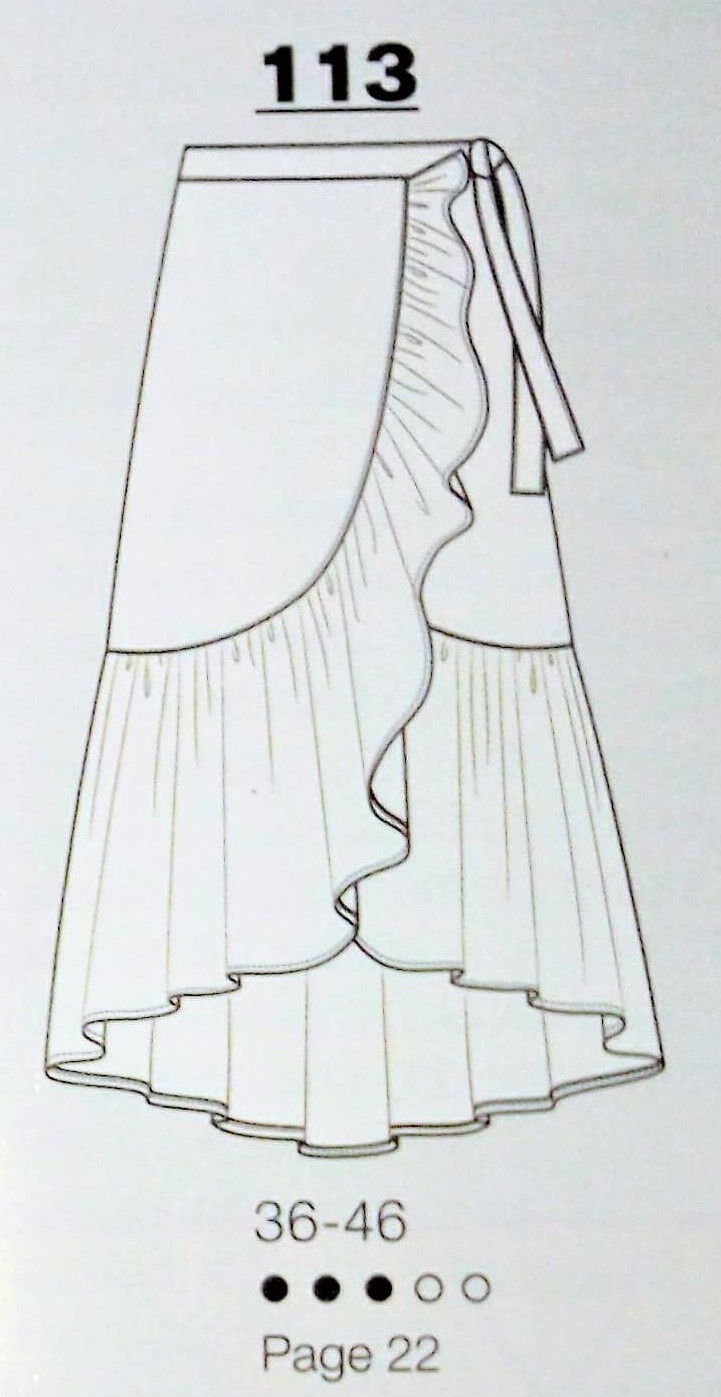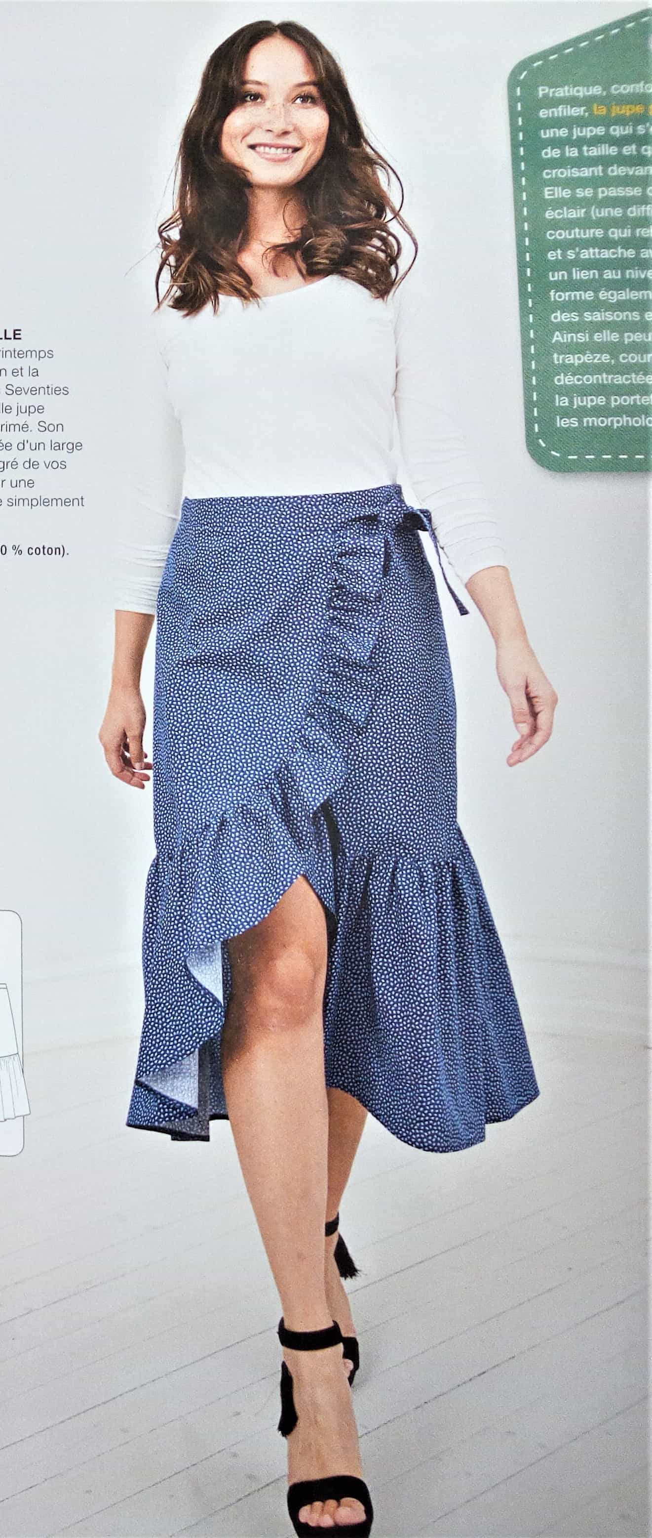 Pour changer voici une superbe jupe portefeuille, elle se noue sur le côté. Elle est bordée d’un large volant qui virevoltera à chaque pas. Elle va de la taille 36-46.