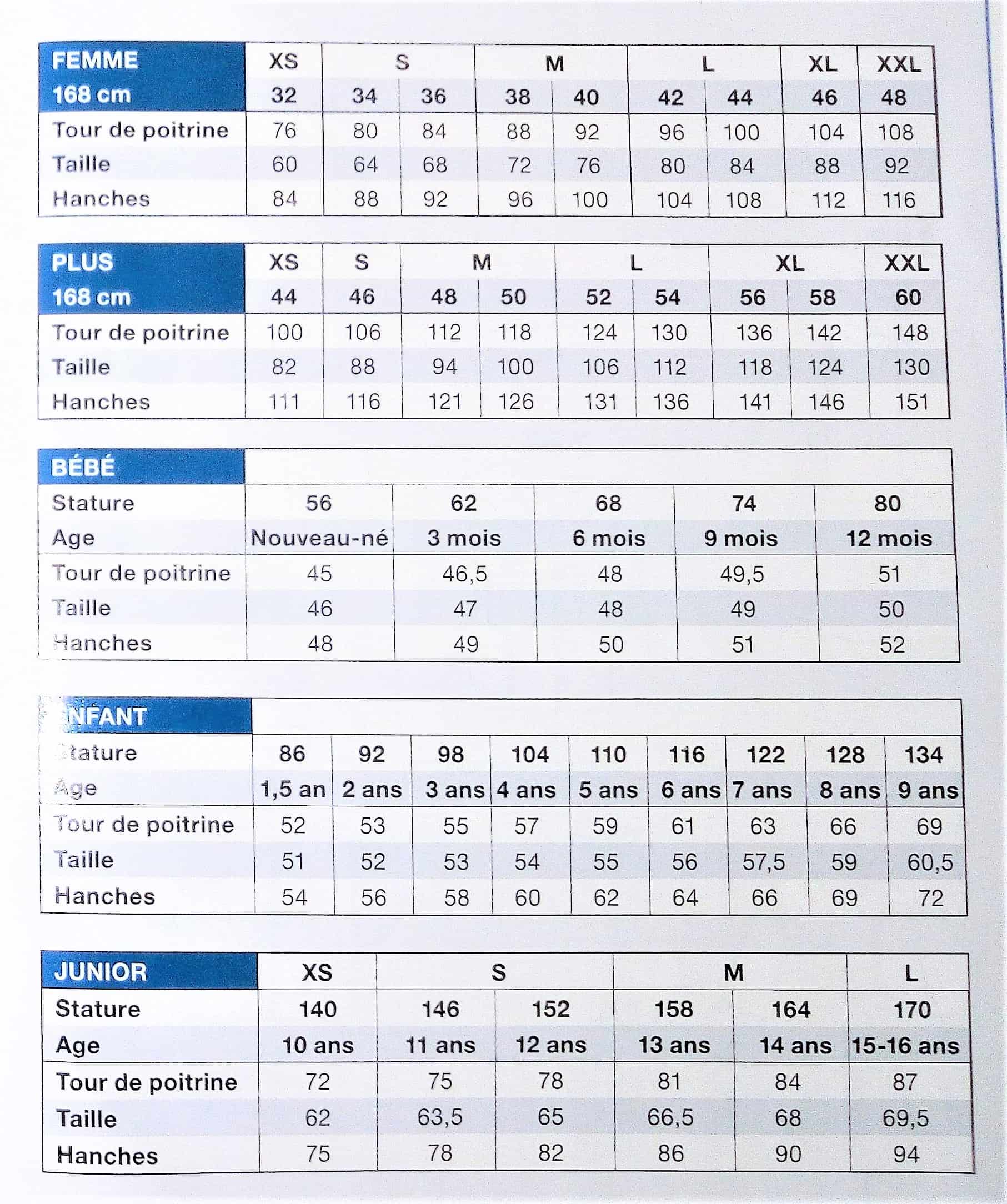 Le tableau des tailles