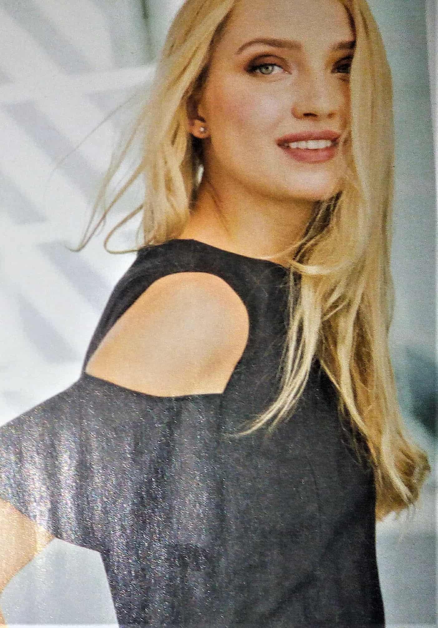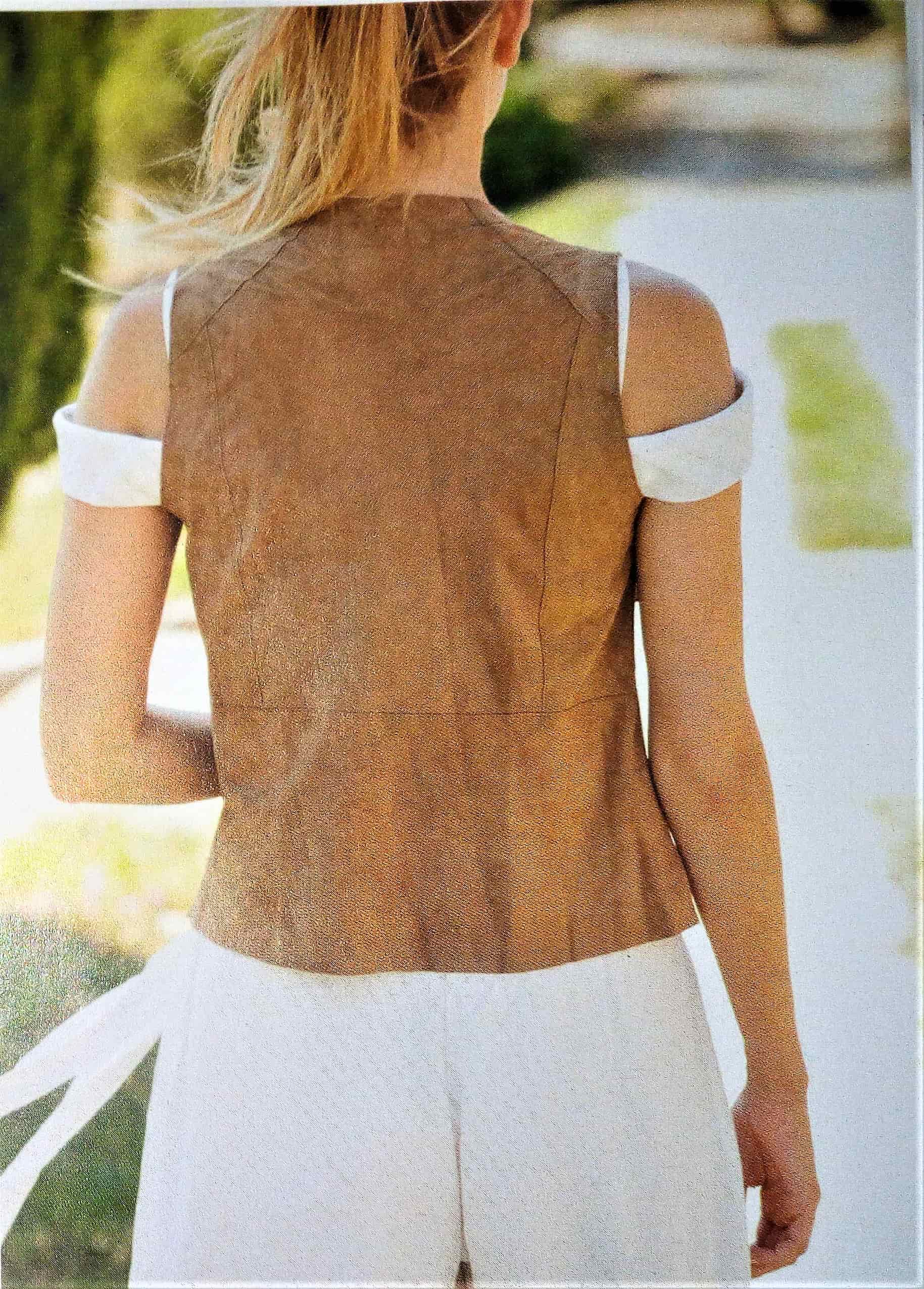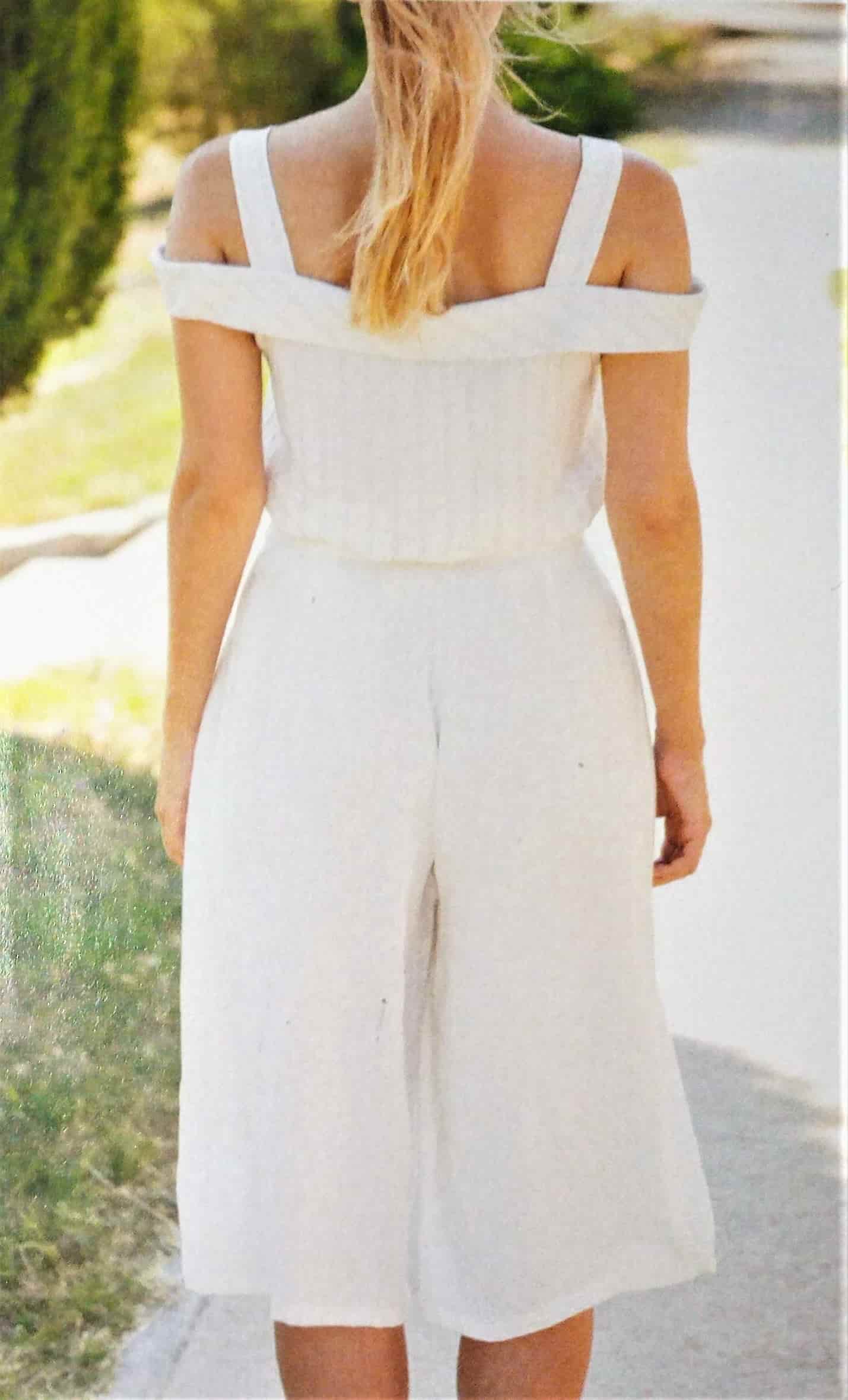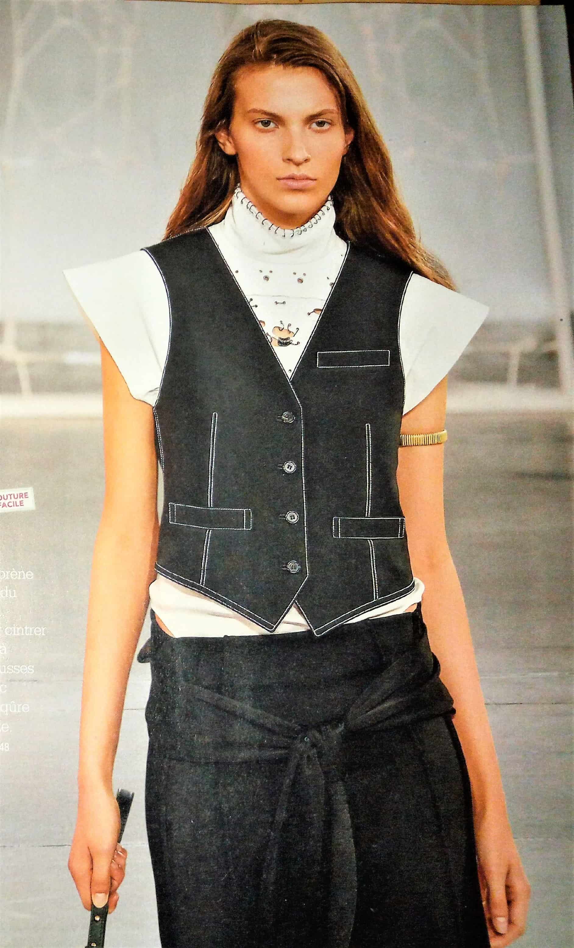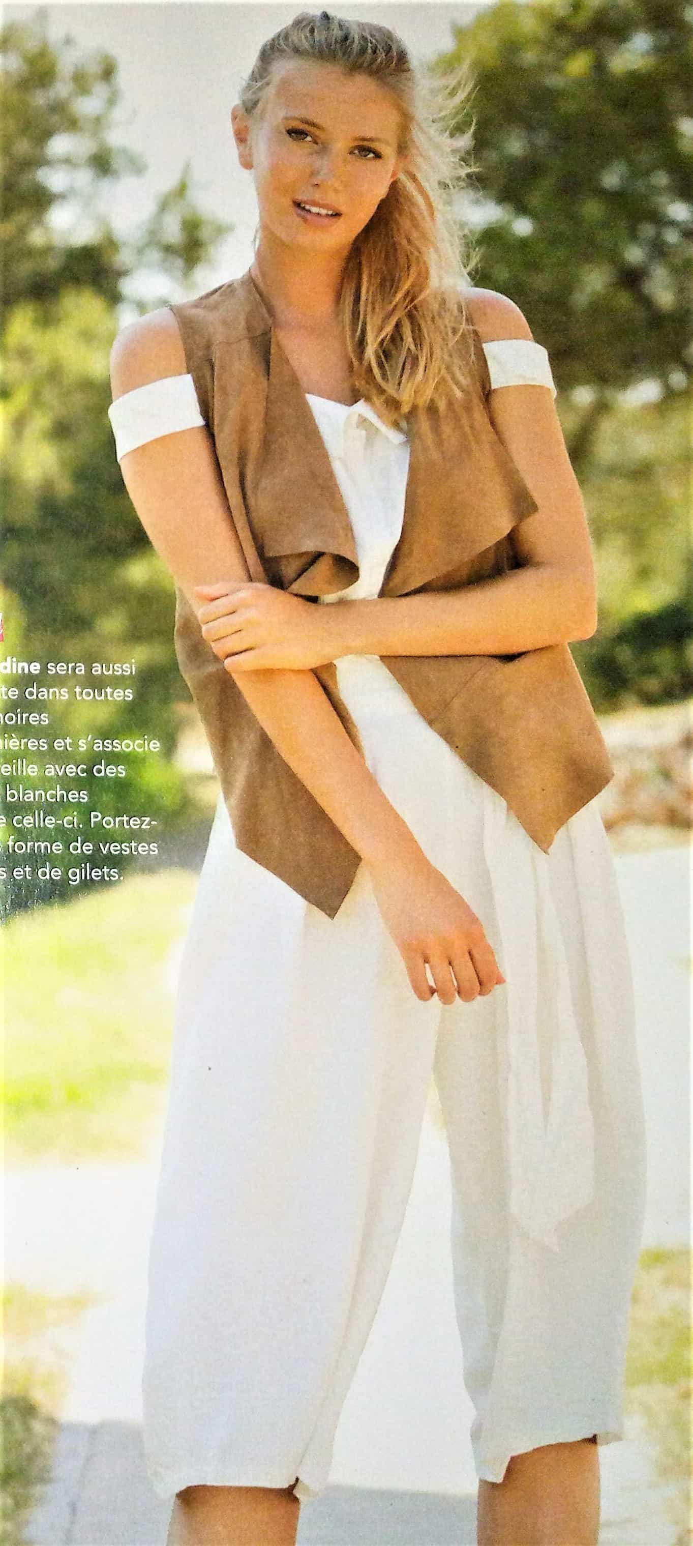 Je suis toujours fan des tops aux épaules dégagés je trouve celui ci particulièrement élégant avec le gilet contrastant, bon j’aime moins le pantalon « Crop ». La blouse possède un col droit qui passe sur les épaules, avec des petites bretelles, elle est boutonnées sur le devant. Le gilet a de nombreuses découpes. Le pantalon , possède des plis sur le devant et des lanières qui flottent. Il est en taille 40, 44 , 48.
